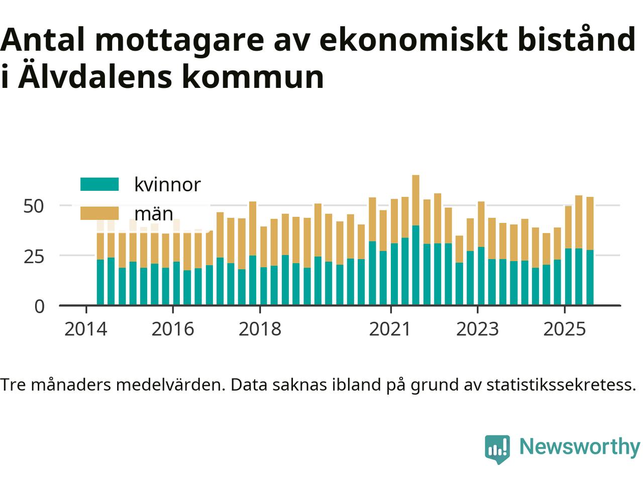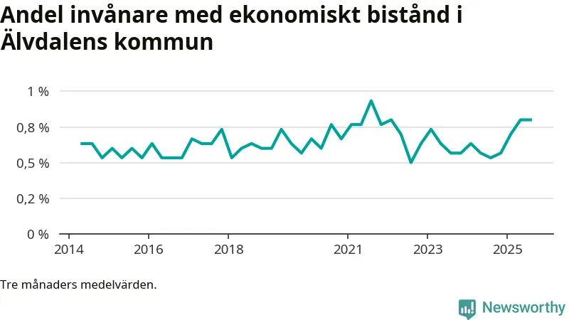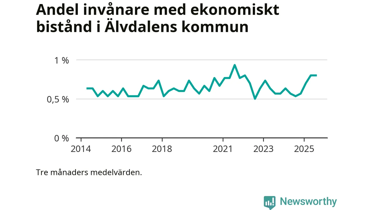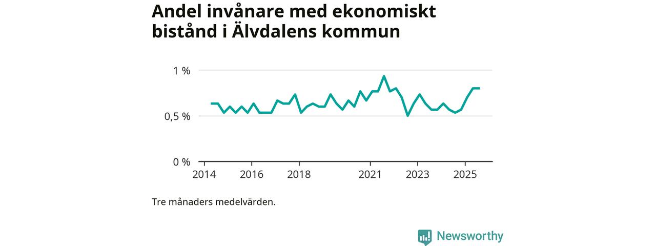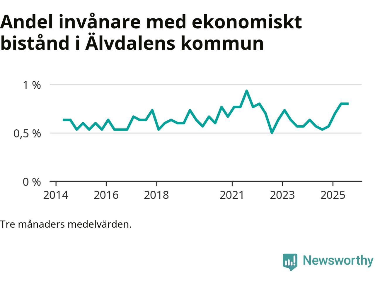 I genomsnitt 54 personer per månad fick ekonomiskt bistånd i Älvdalens kommun under sommarmånaderna (juni till augusti), vilket motsvarar 0,8 procent av den vuxna befolkningen. Det är lika stor andel som i våras, och något större andel än under sommaren för ett år sedan.