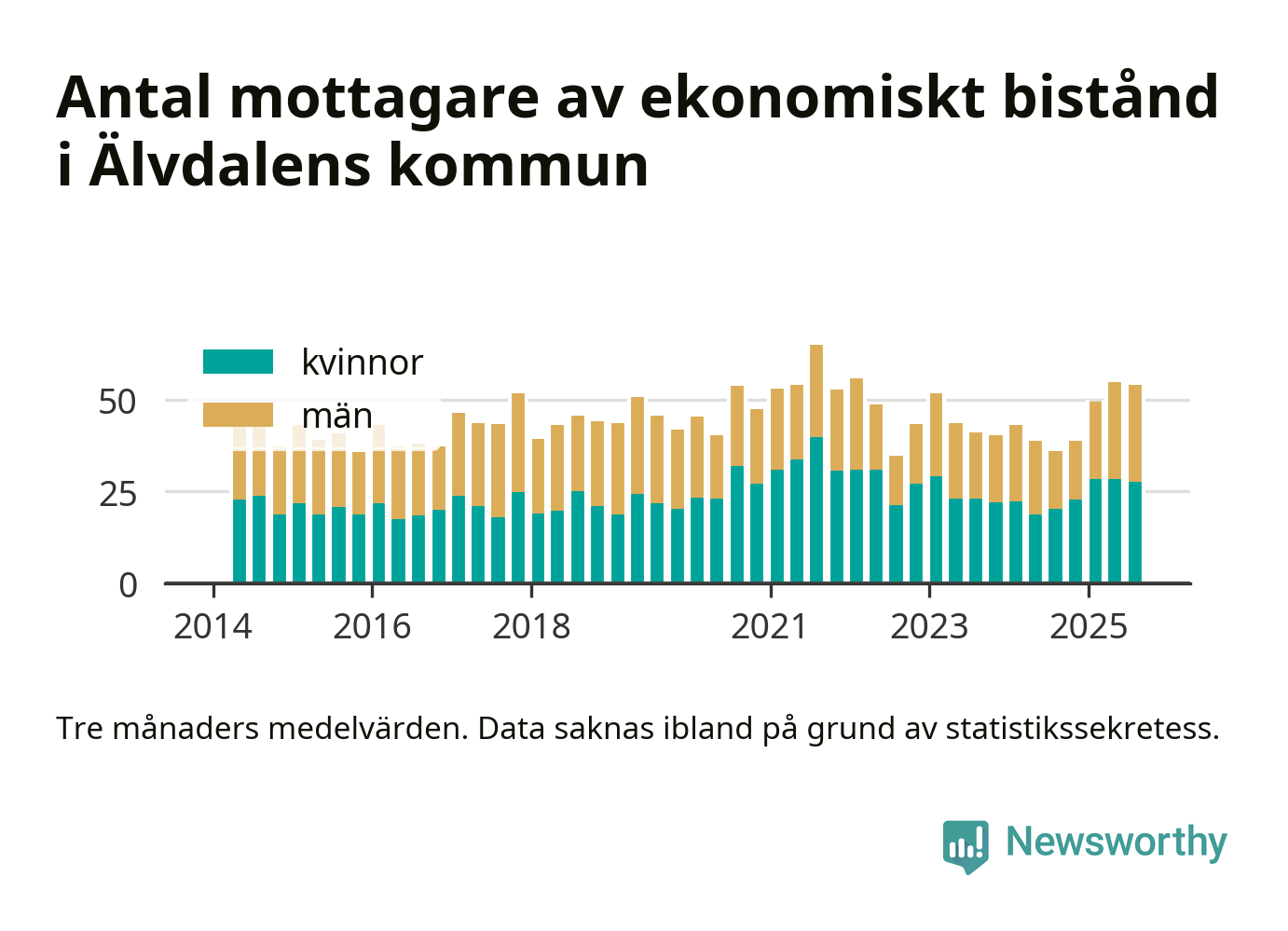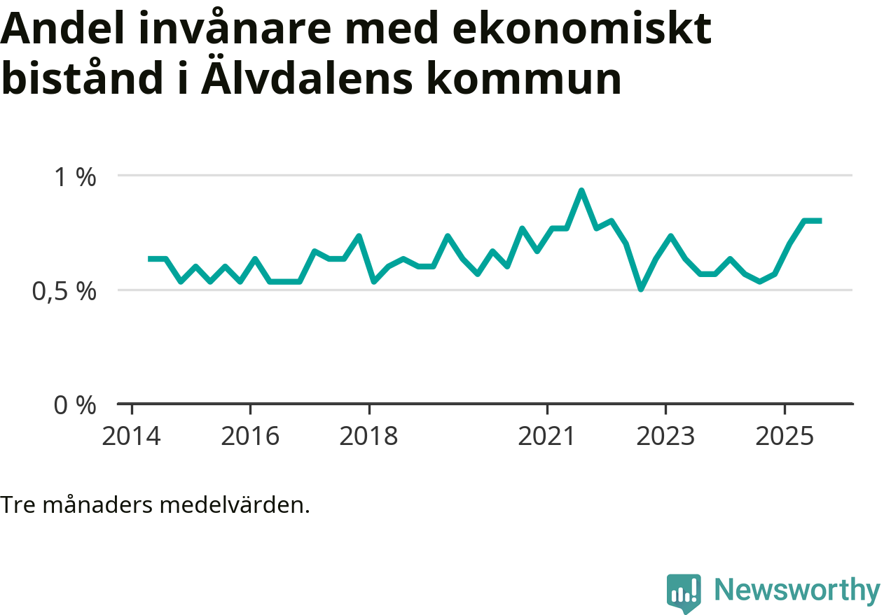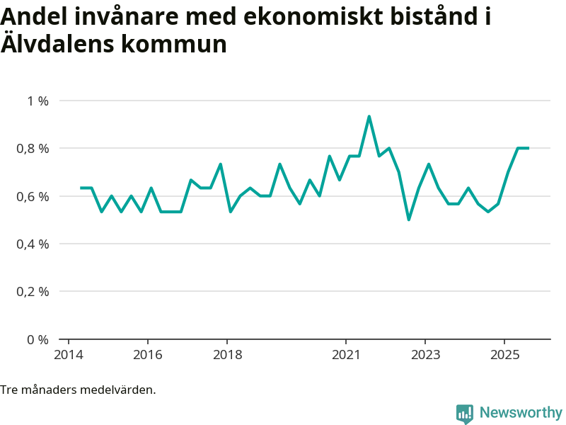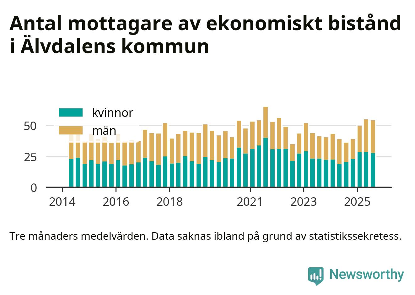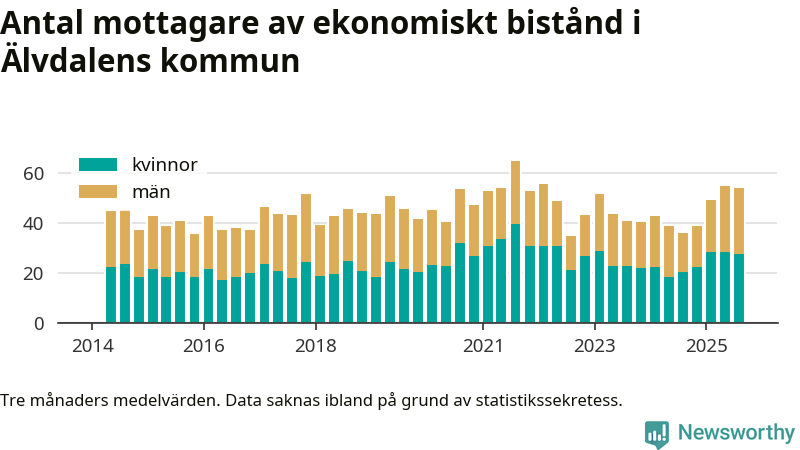 I genomsnitt 54 personer per månad fick ekonomiskt bistånd i Älvdalens kommun under sommarmånaderna (juni till augusti), vilket motsvarar 0,8 procent av den vuxna befolkningen. Det är lika stor andel som i våras, och något större andel än under sommaren för ett år sedan.