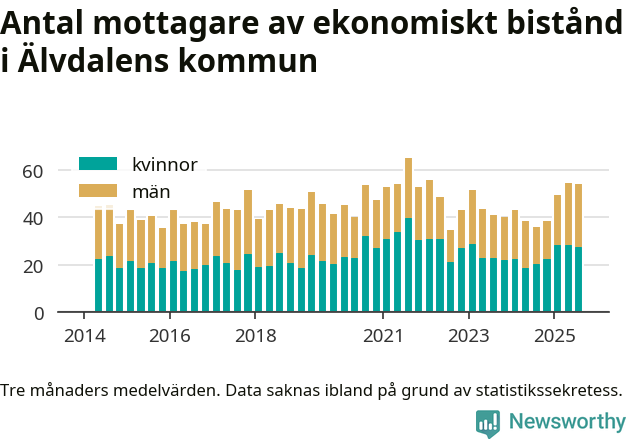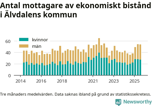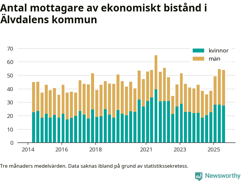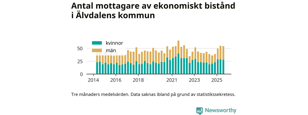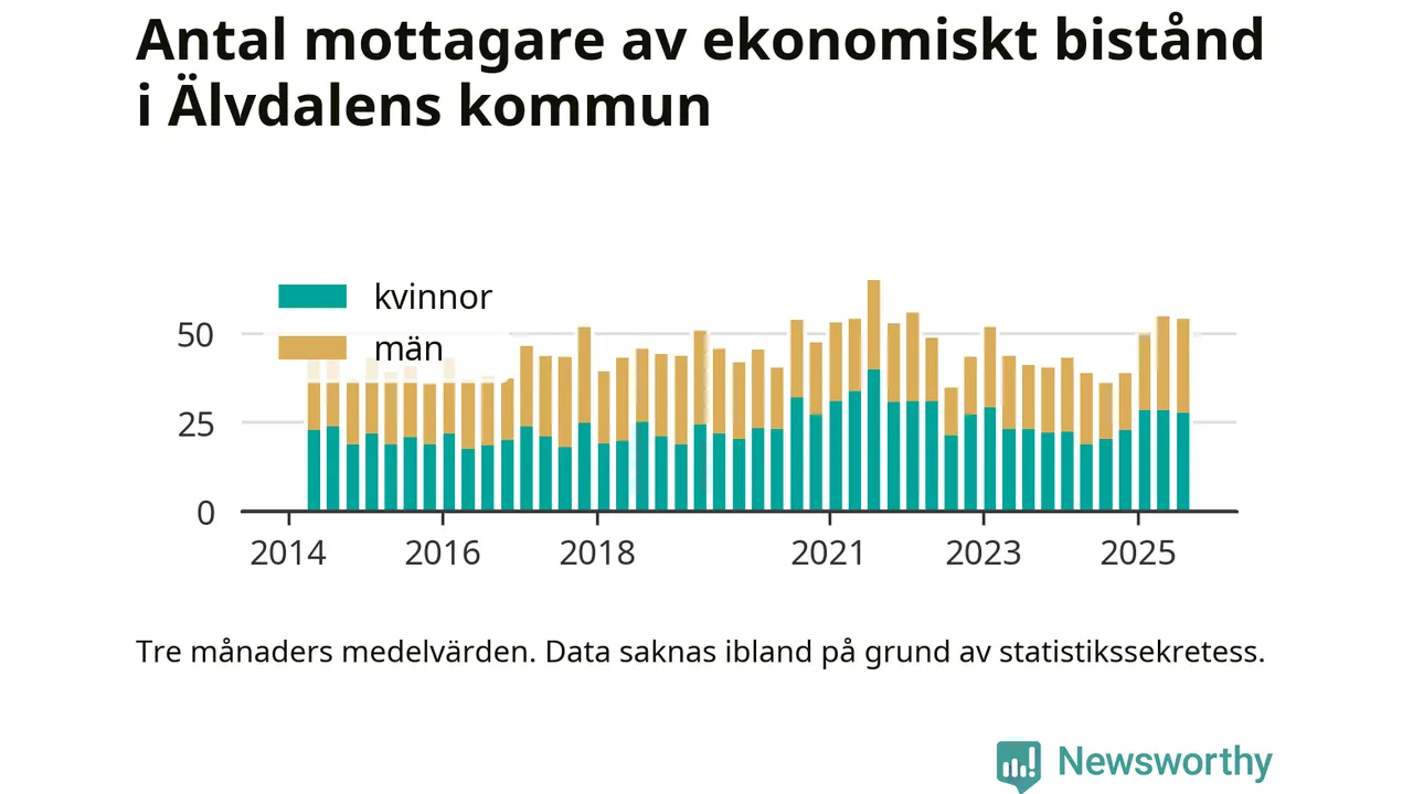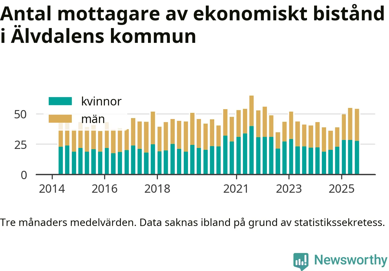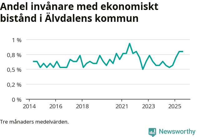 I genomsnitt 54 personer per månad fick ekonomiskt bistånd i Älvdalens kommun under sommarmånaderna (juni till augusti), vilket motsvarar 0,8 procent av den vuxna befolkningen. Det är lika stor andel som i våras, och något större andel än under sommaren för ett år sedan.
