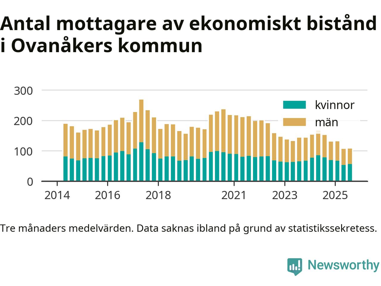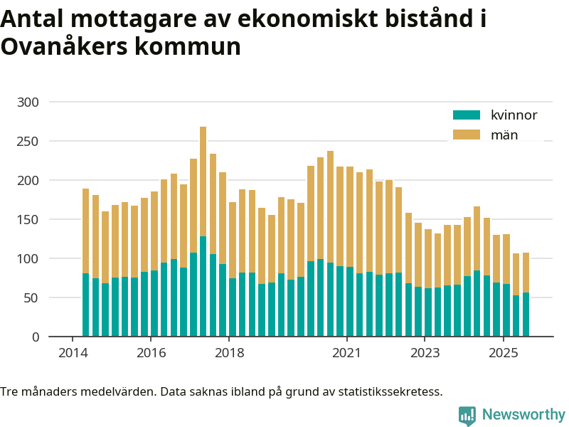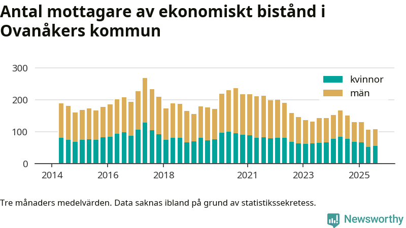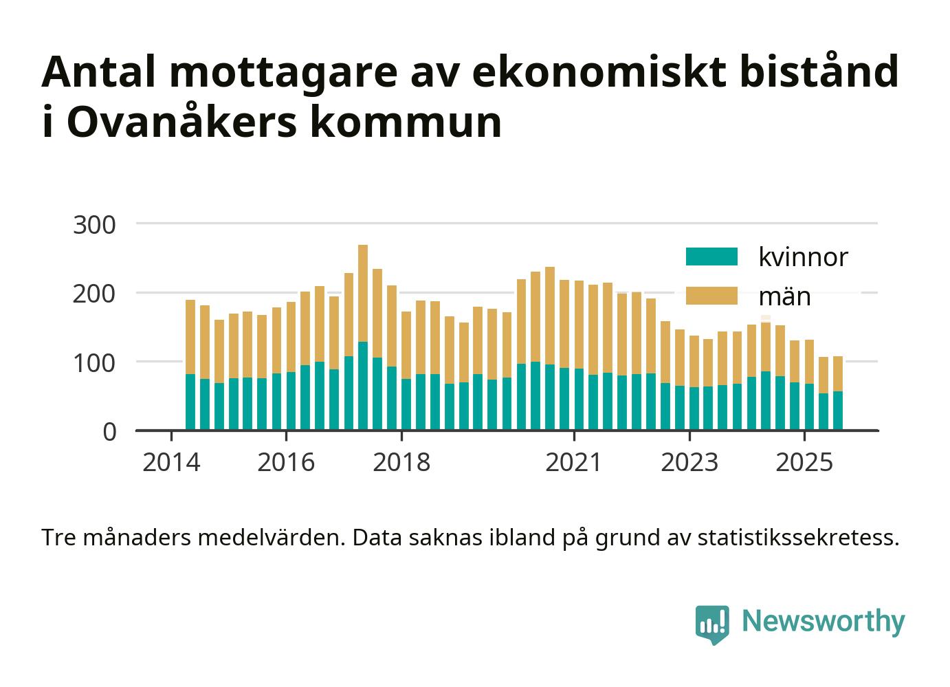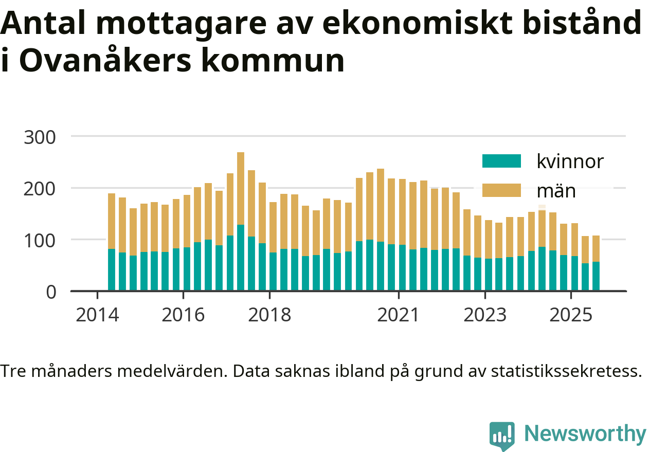 I genomsnitt 108 personer per månad fick ekonomiskt bistånd i Ovanåkers kommun under sommarmånaderna (juni till augusti), vilket motsvarar 1,0 procent av den vuxna befolkningen. Det är marginellt mer än i våras, och något mindre andel än under sommaren för ett år sedan.
