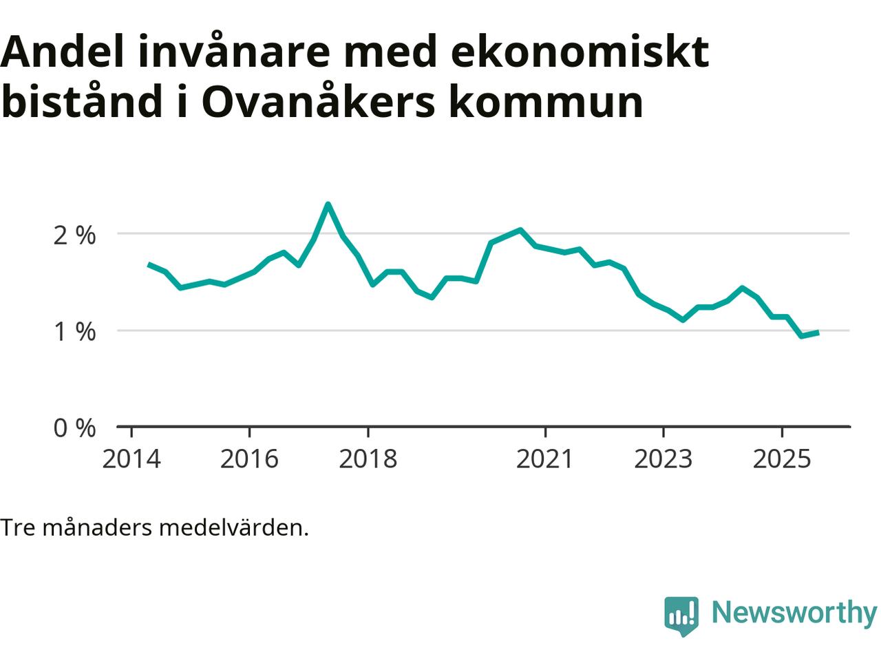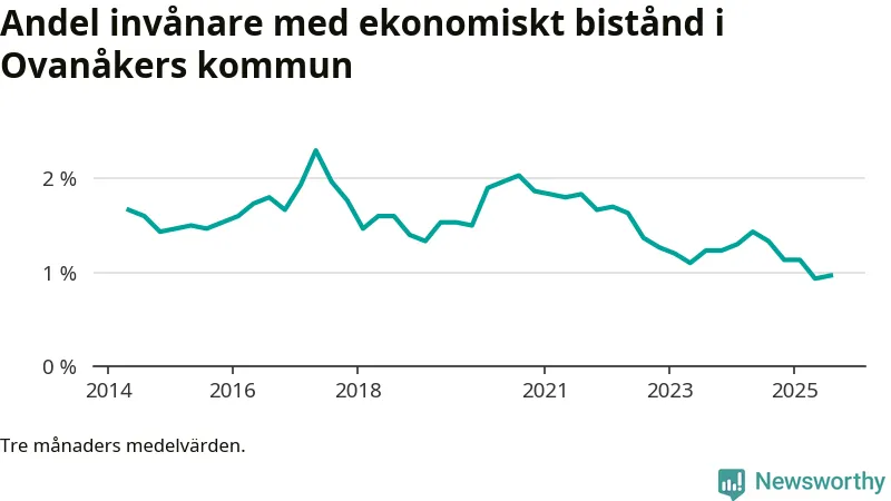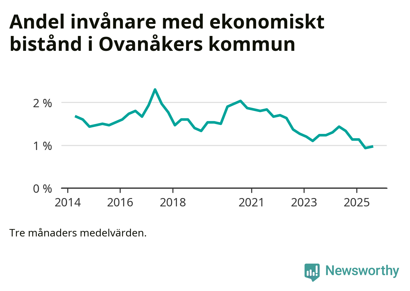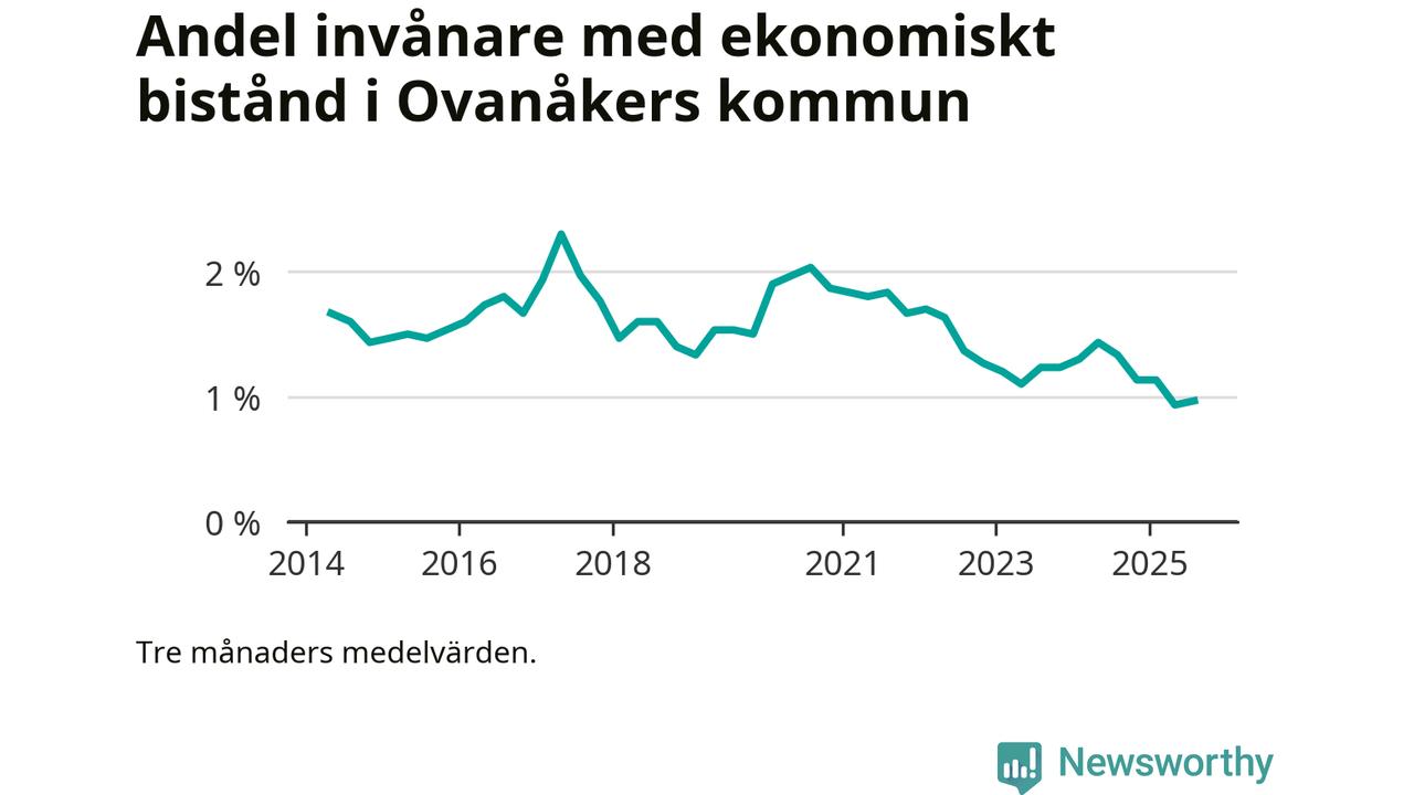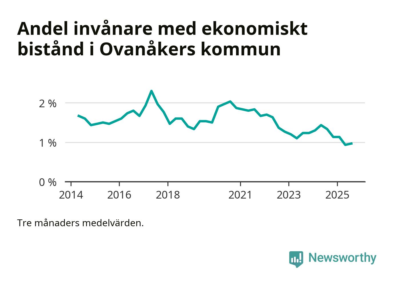 Andelen invånare med ekonomiskt bistånd i Ovanåkers kommun var lägre under sommaren jämfört med motsvarande period året innan. Det visar den senaste, preliminära statistiken från Socialstyrelsen.