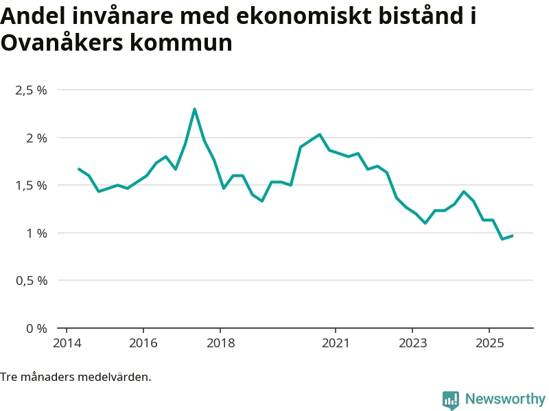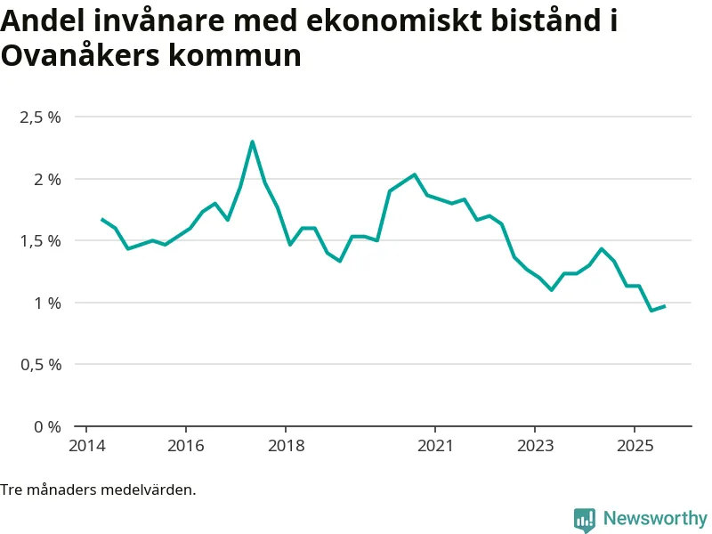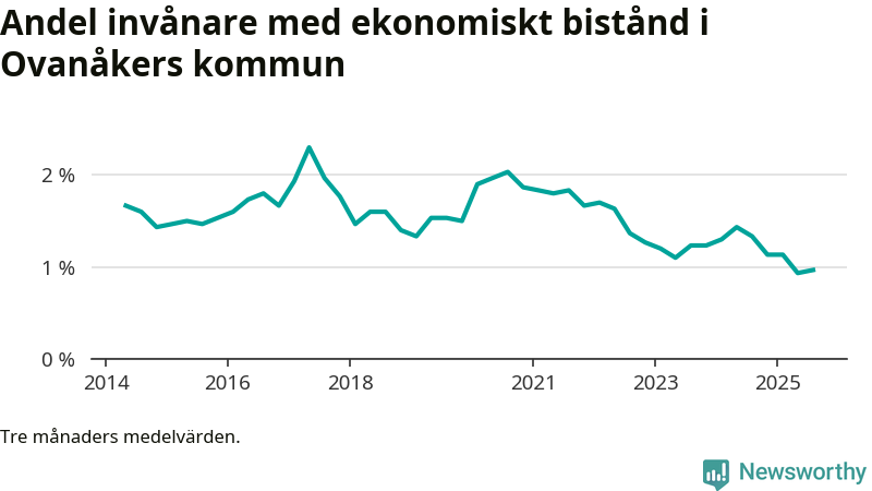 Den högsta andelen biståndstagare under det senaste decenniet hade kommunen under våren 2017 (2,3 procent), och den lägsta andelen under våren 2025 (0,9 procent).