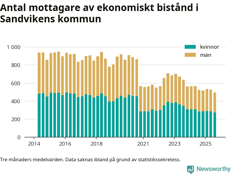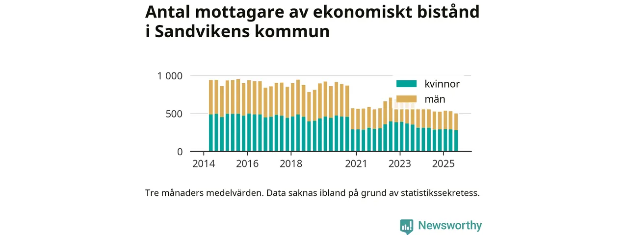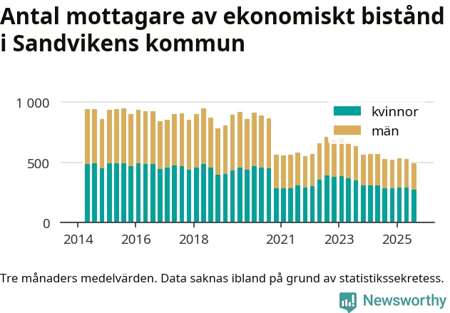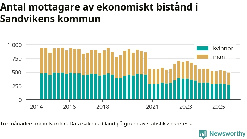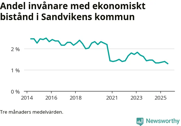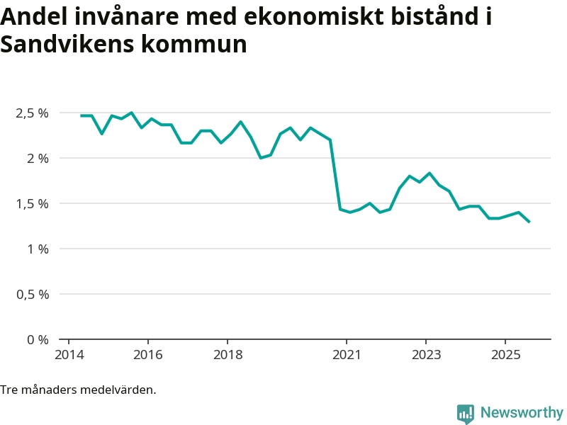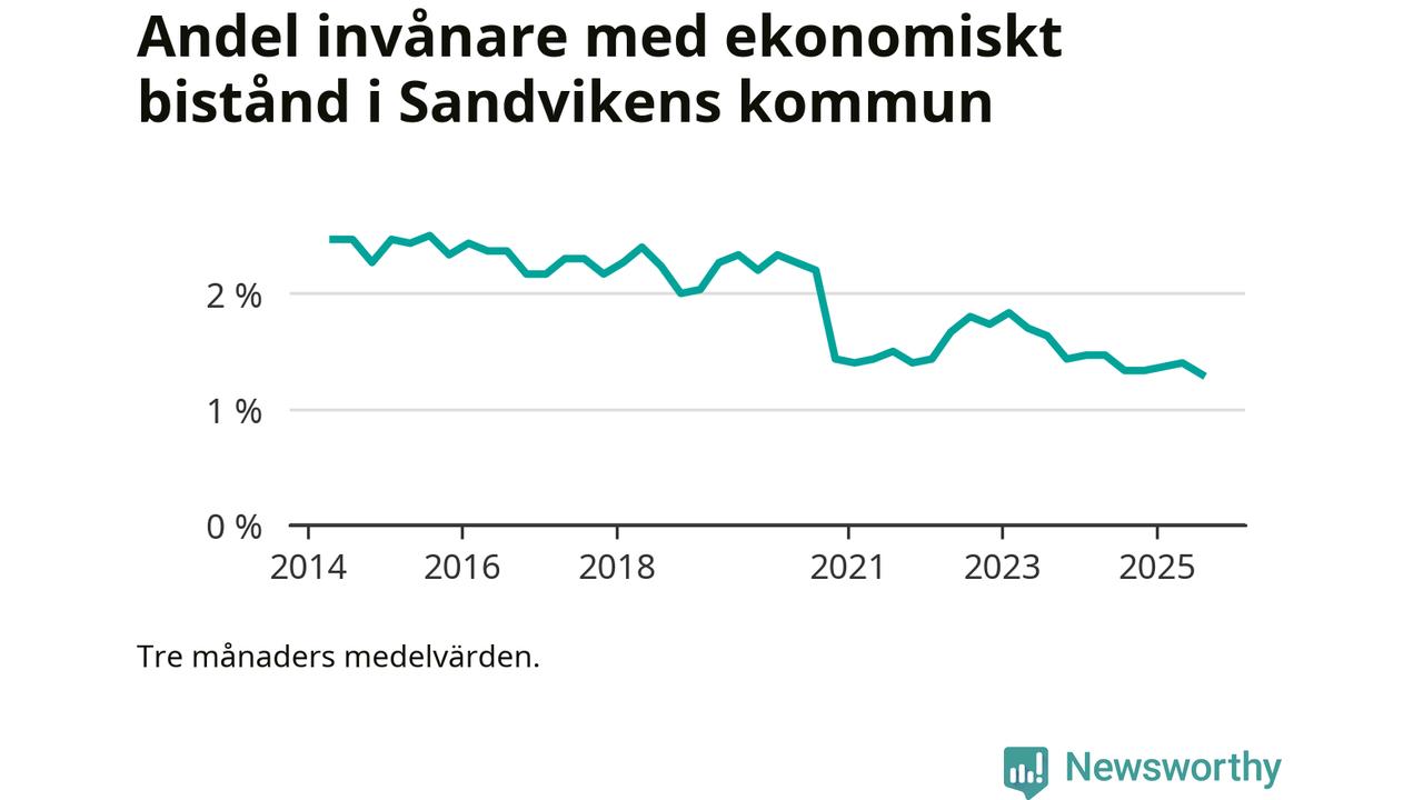 Andelen invånare med ekonomiskt bistånd i Sandvikens kommun var under sommaren den lägsta sedan åtminstone 2014. Det visar den senaste, preliminära statistiken från Socialstyrelsen.