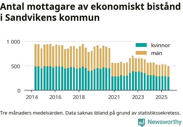 I genomsnitt 494 personer per månad fick ekonomiskt bistånd i Sandvikens kommun under sommarmånaderna (juni till augusti), vilket motsvarar 1,3 procent av den vuxna befolkningen. Det är marginellt mindre än i våras, och något mindre andel än under sommaren för ett år sedan.