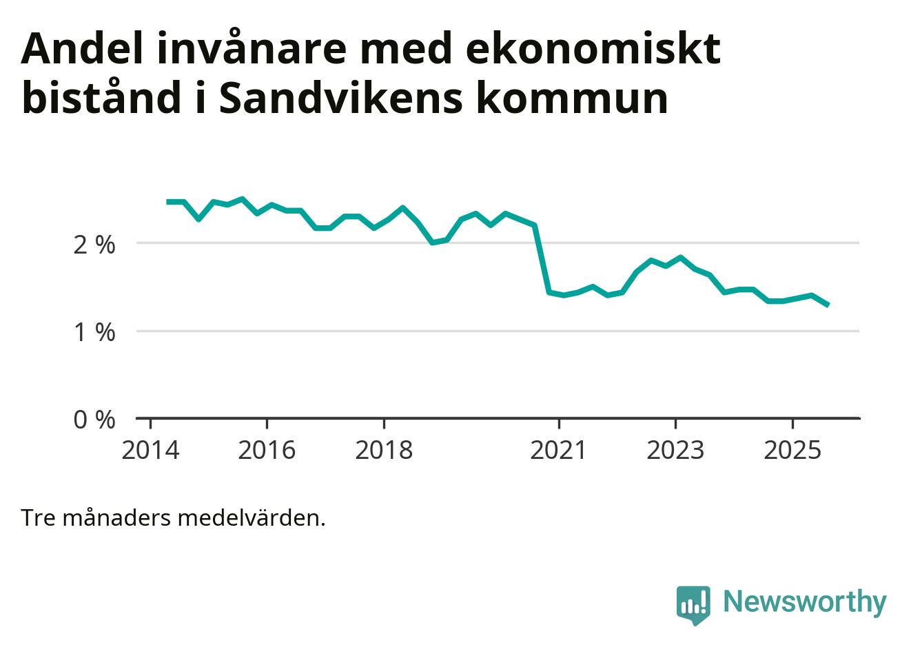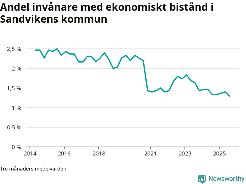 Sommarens 1,3 procent är den lägsta andelen biståndstagare i kommunen under någon tremånadersperiod sedan åtminstone 2014, vilket är så långt tillbaka Socialstyrelsens statistik sträcker sig.