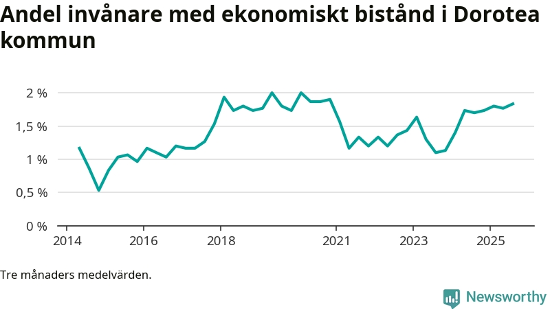 I genomsnitt 42 personer per månad fick ekonomiskt bistånd i Dorotea kommun under sommarmånaderna (juni till augusti), vilket motsvarar 1,8 procent av den vuxna befolkningen. Det är marginellt mer än i våras, och något större andel än under sommaren för ett år sedan.