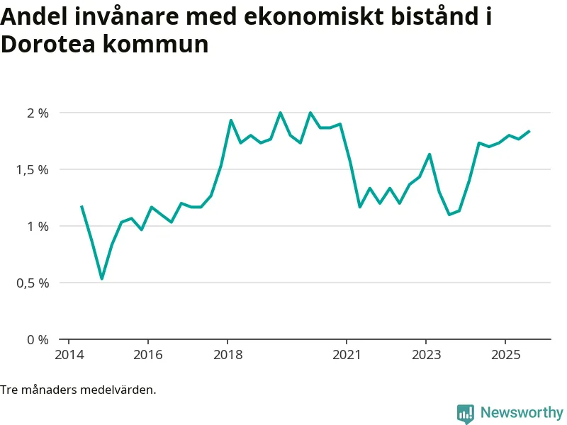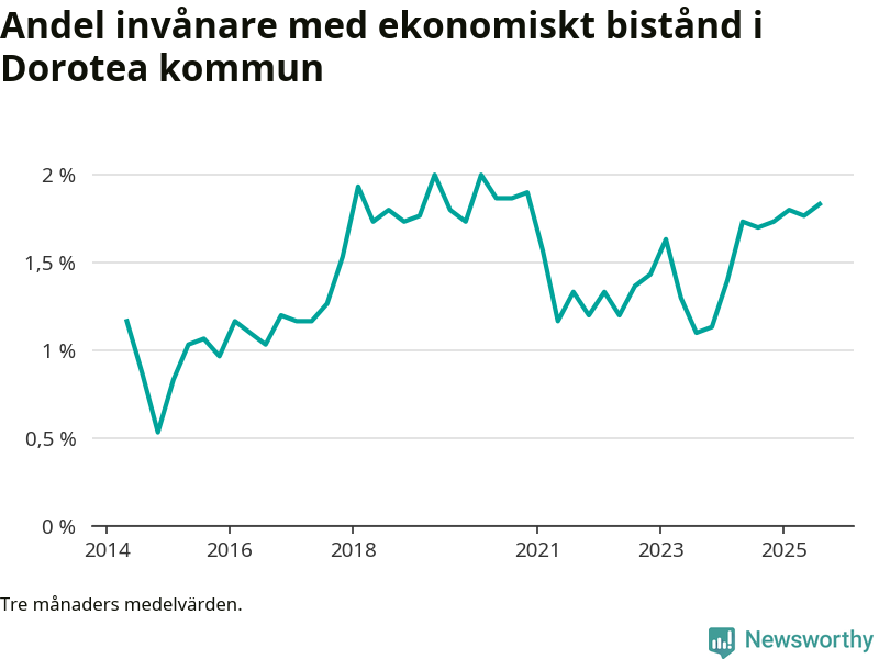Den högsta andelen biståndstagare under det senaste decenniet hade kommunen under våren 2019 (2 procent), och den lägsta andelen under hösten 2014 (0,5 procent).