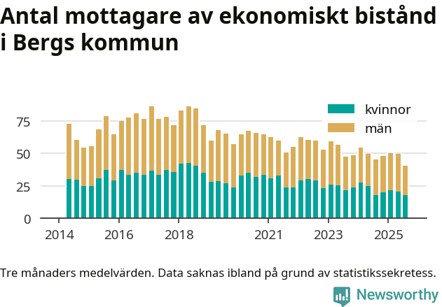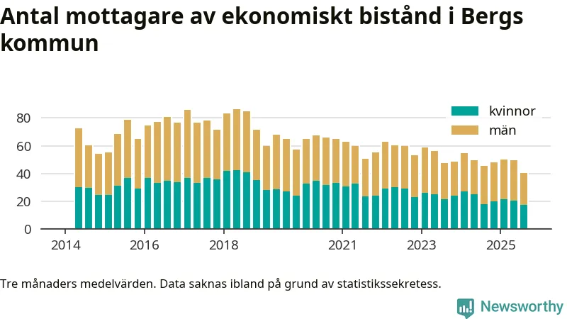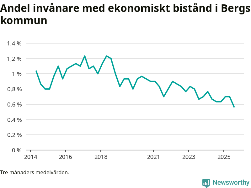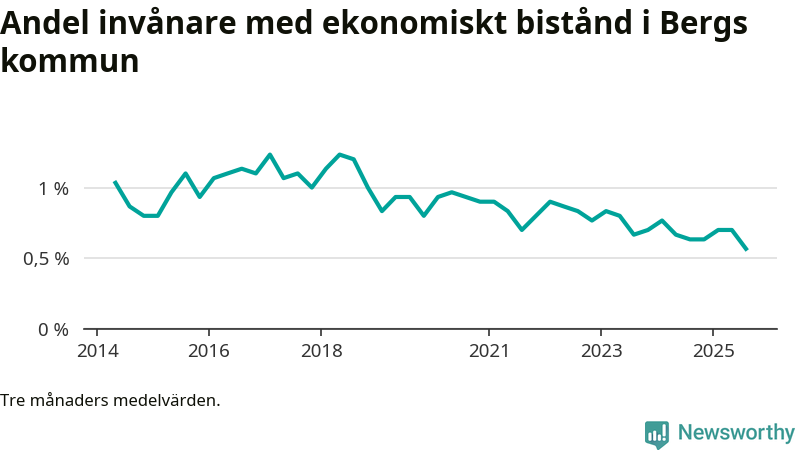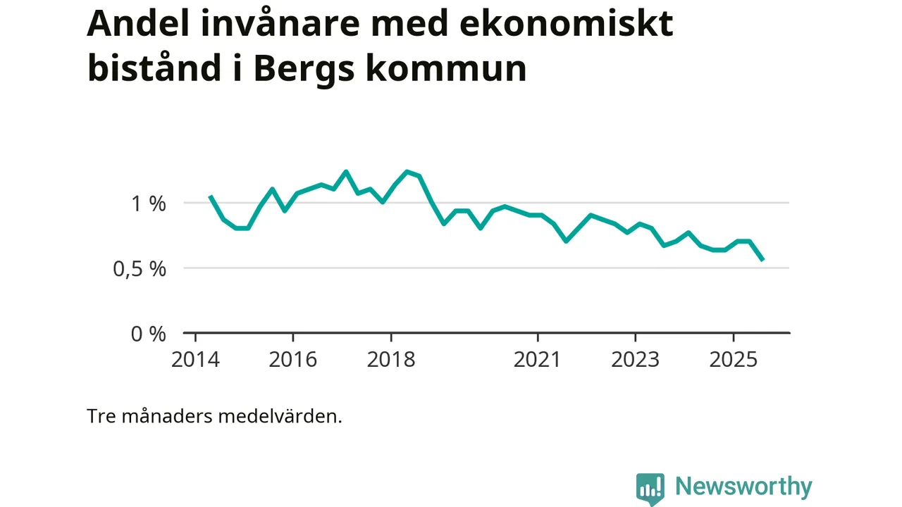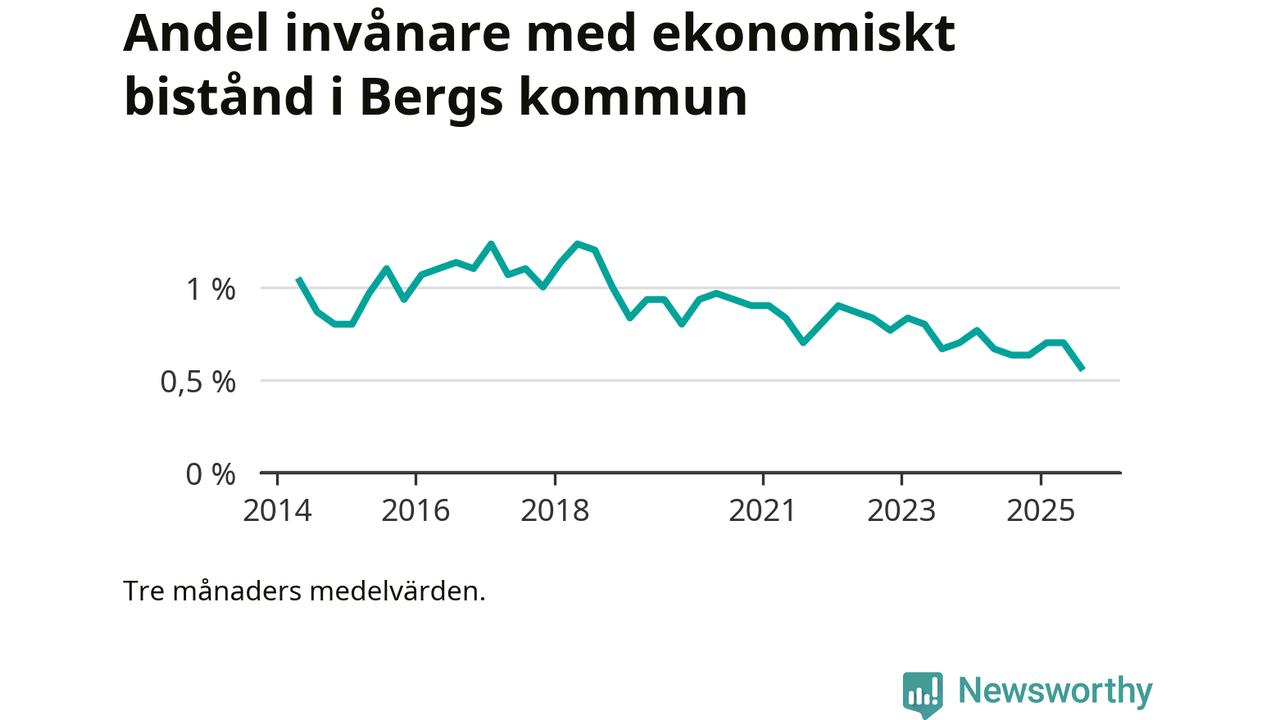 Andelen invånare med ekonomiskt bistånd i Bergs kommun var under sommaren den lägsta sedan åtminstone 2014. Det visar den senaste, preliminära statistiken från Socialstyrelsen.
