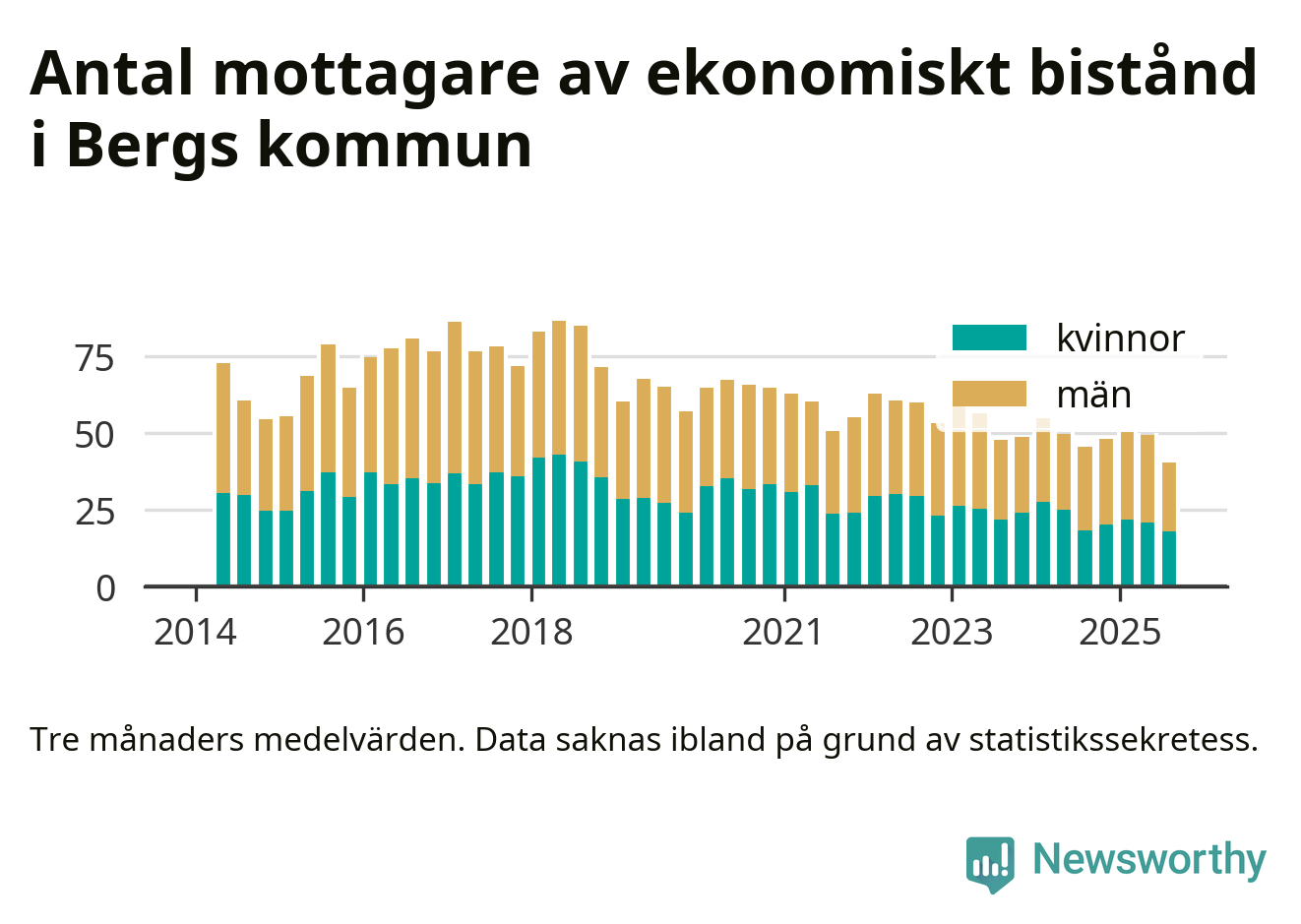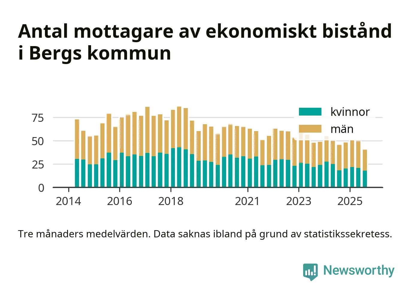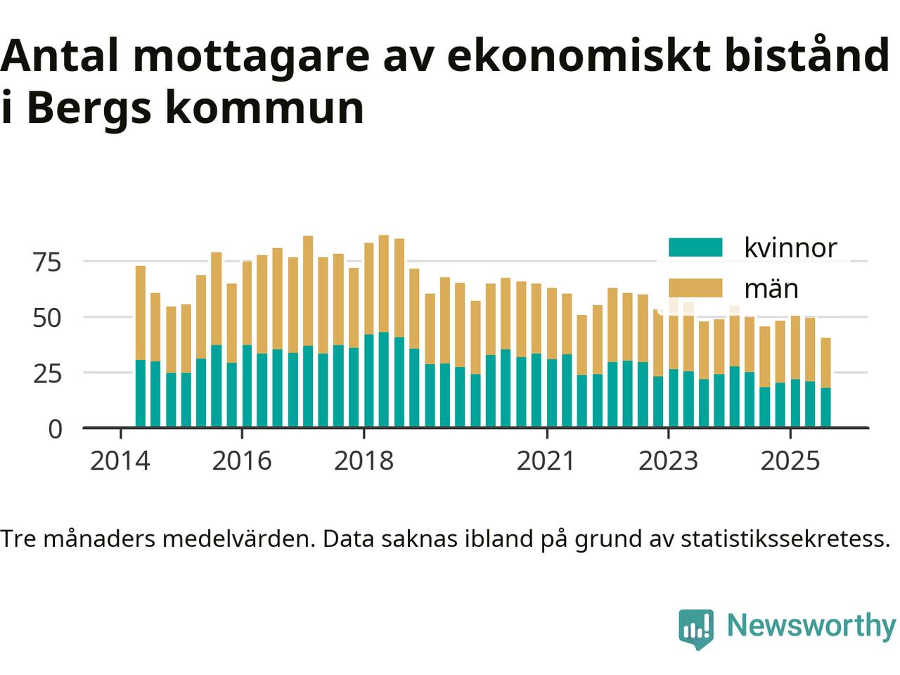 Andelen invånare med ekonomiskt bistånd i Bergs kommun var under sommaren den lägsta sedan åtminstone 2014. Det visar den senaste, preliminära statistiken från Socialstyrelsen.
