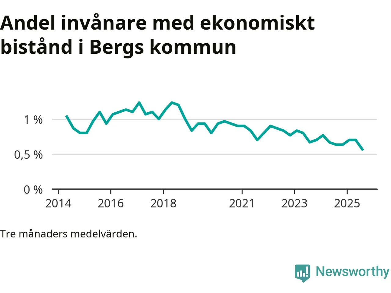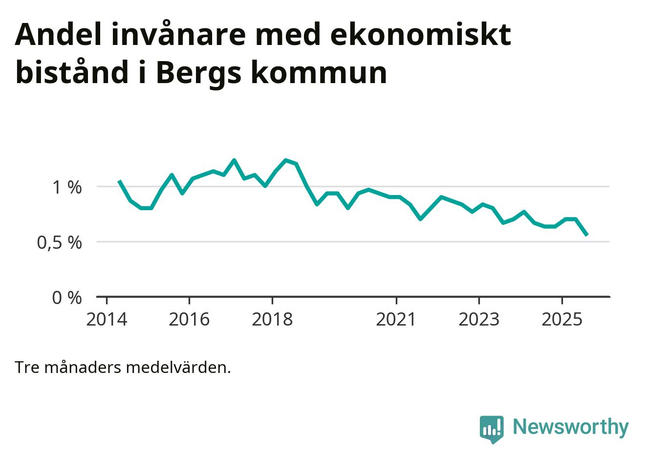 Sommarens 0,6 procent är den lägsta andelen biståndstagare i kommunen under någon tremånadersperiod sedan åtminstone 2014, vilket är så långt tillbaka Socialstyrelsens statistik sträcker sig.