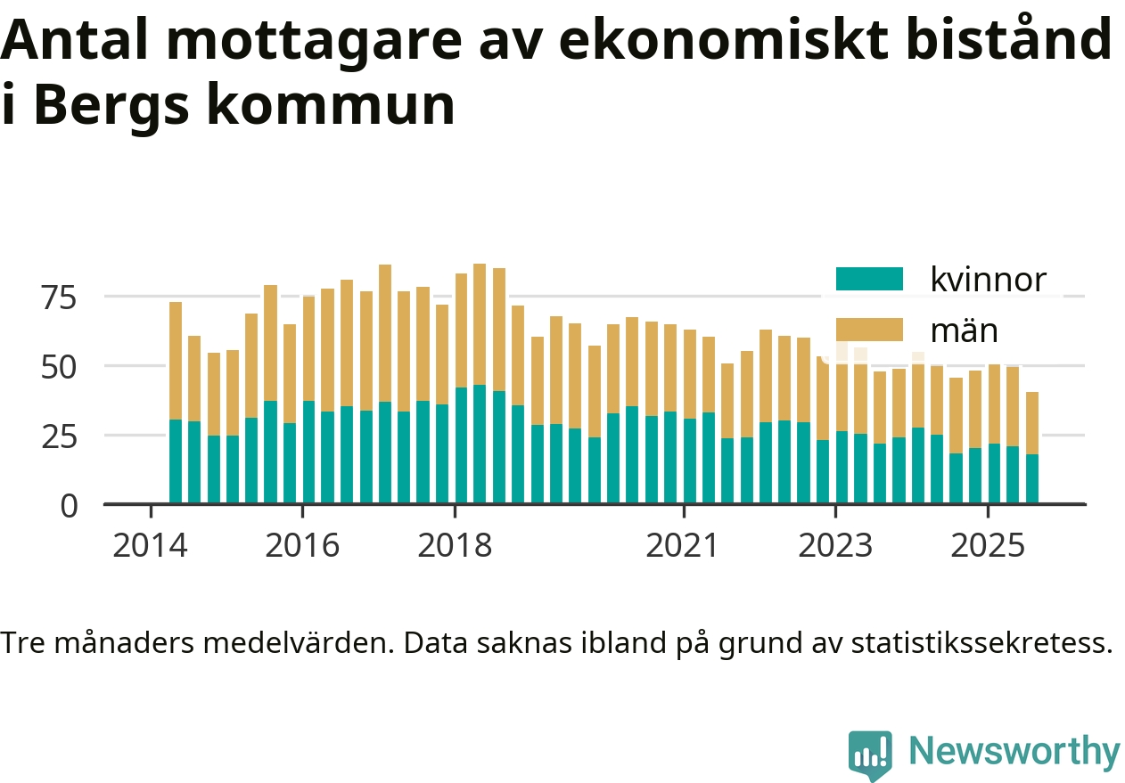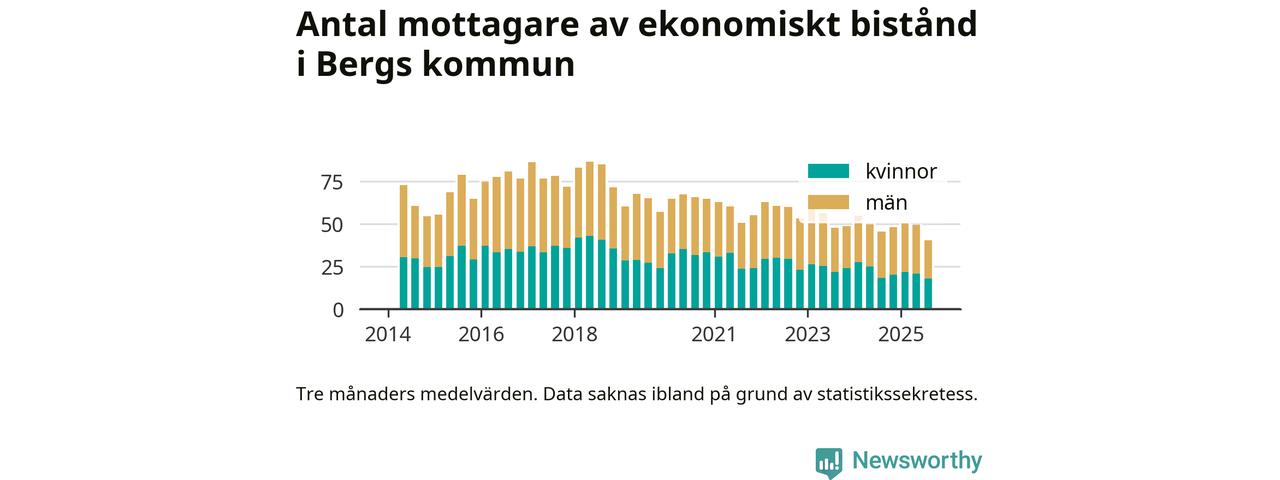 I genomsnitt 40 personer per månad fick ekonomiskt bistånd i Bergs kommun under sommarmånaderna (juni till augusti), vilket motsvarar 0,6 procent av den vuxna befolkningen. Det är en minskning med 0,1 procentenheter eller nio personer jämfört med i våras, och något mindre andel än under sommaren för ett år sedan.