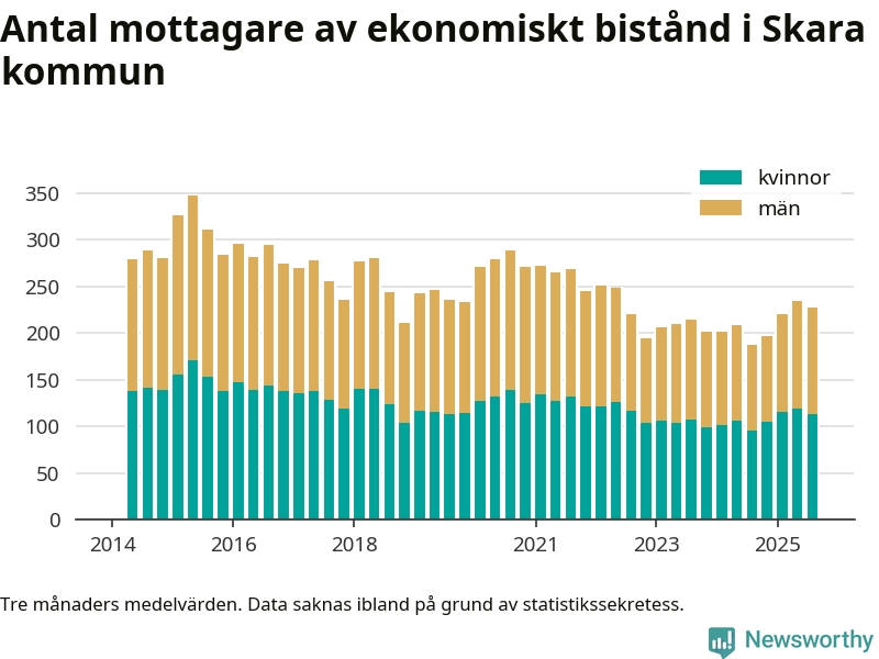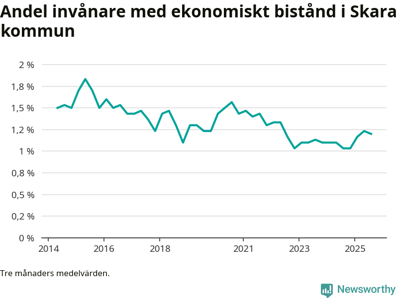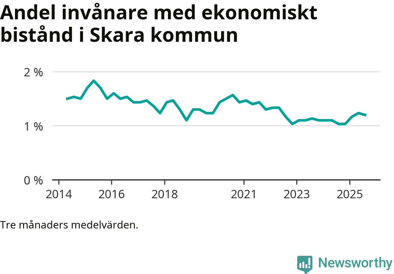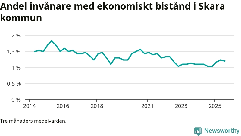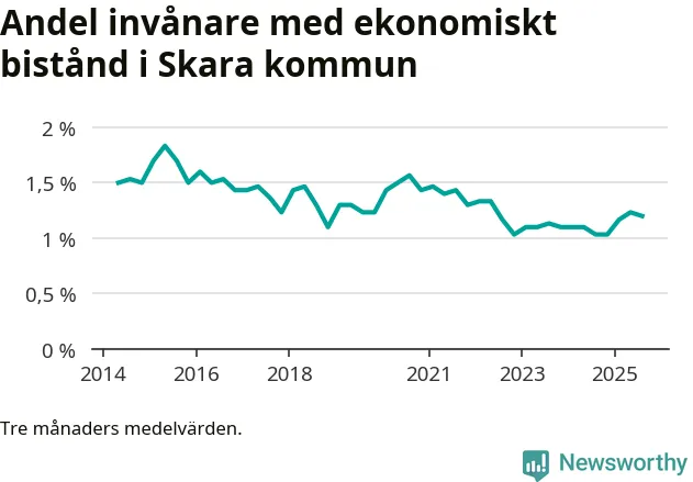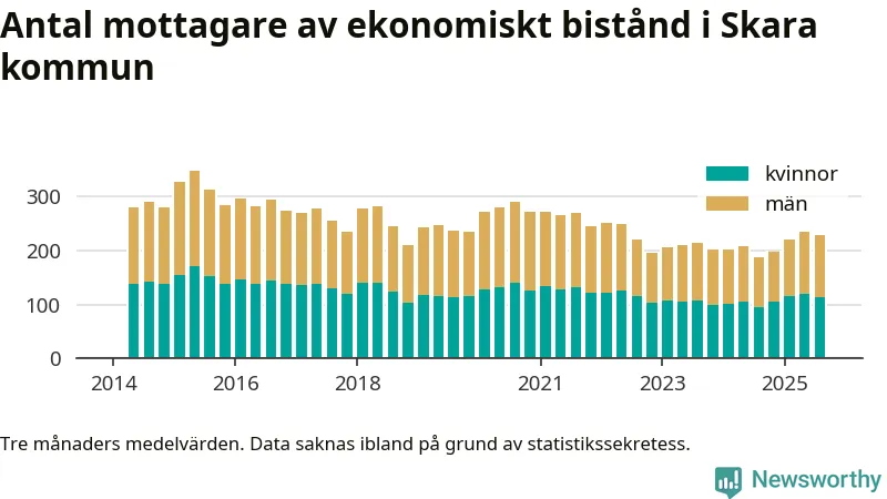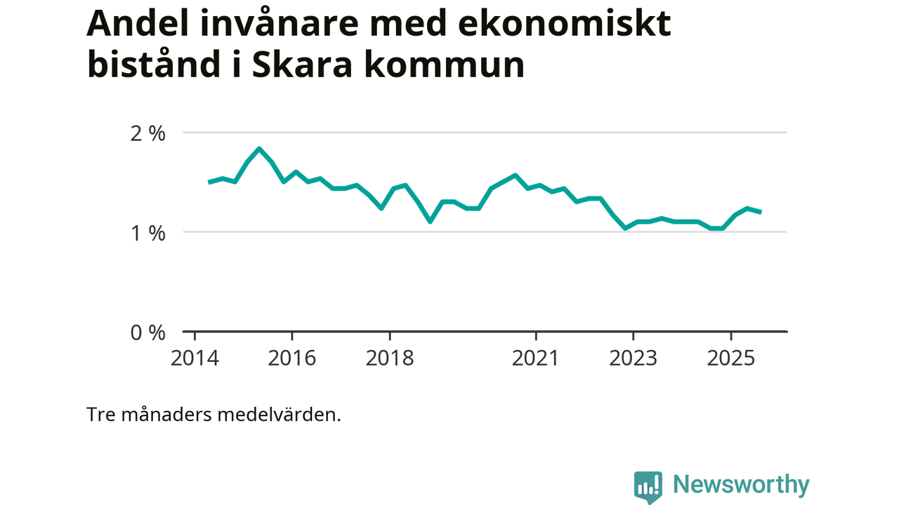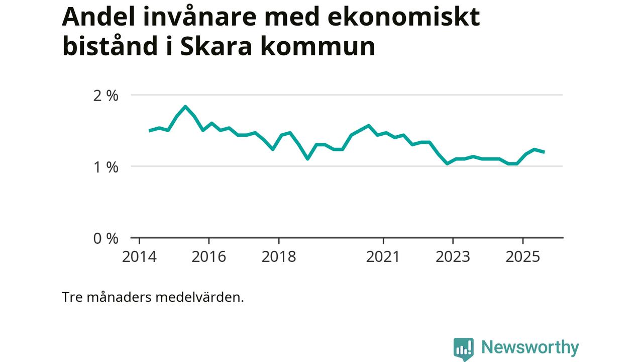I genomsnitt 227 personer per månad fick ekonomiskt bistånd i Skara kommun under sommarmånaderna (juni till augusti), vilket motsvarar 1,2 procent av den vuxna befolkningen. Det är marginellt mindre än i våras, och något större andel än under sommaren för ett år sedan.