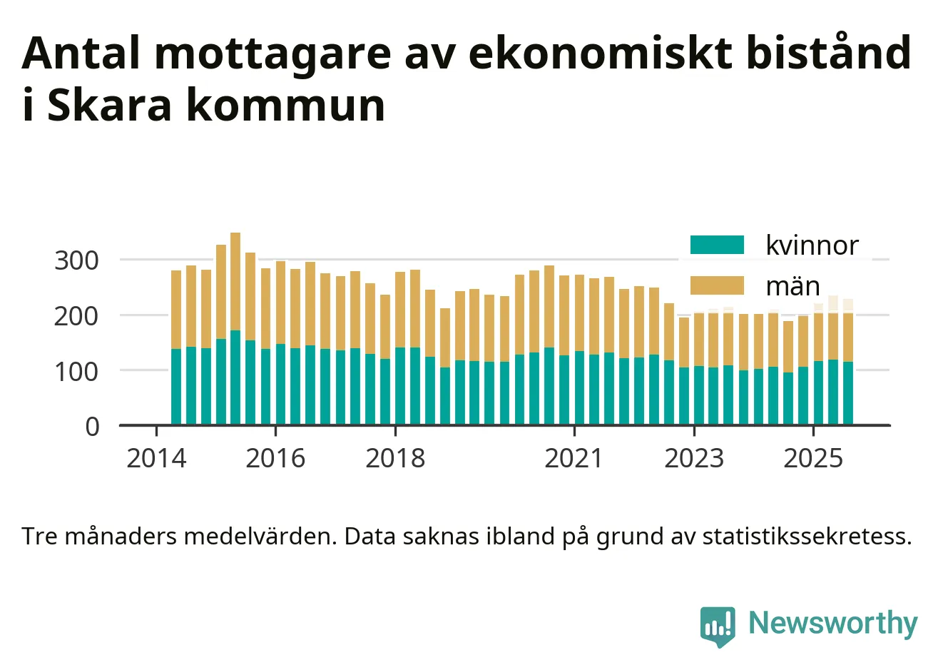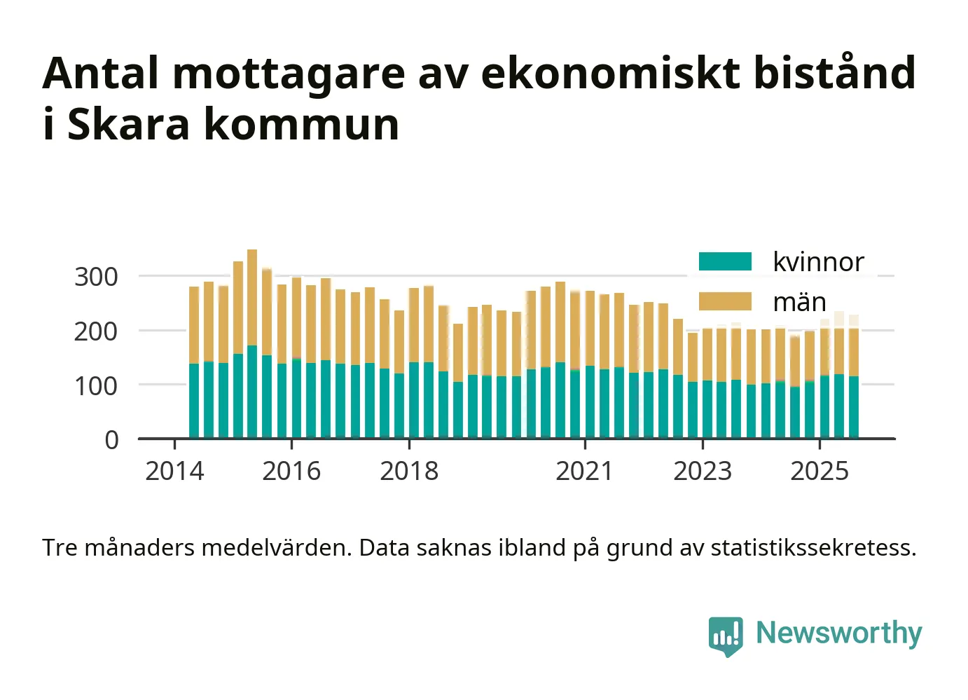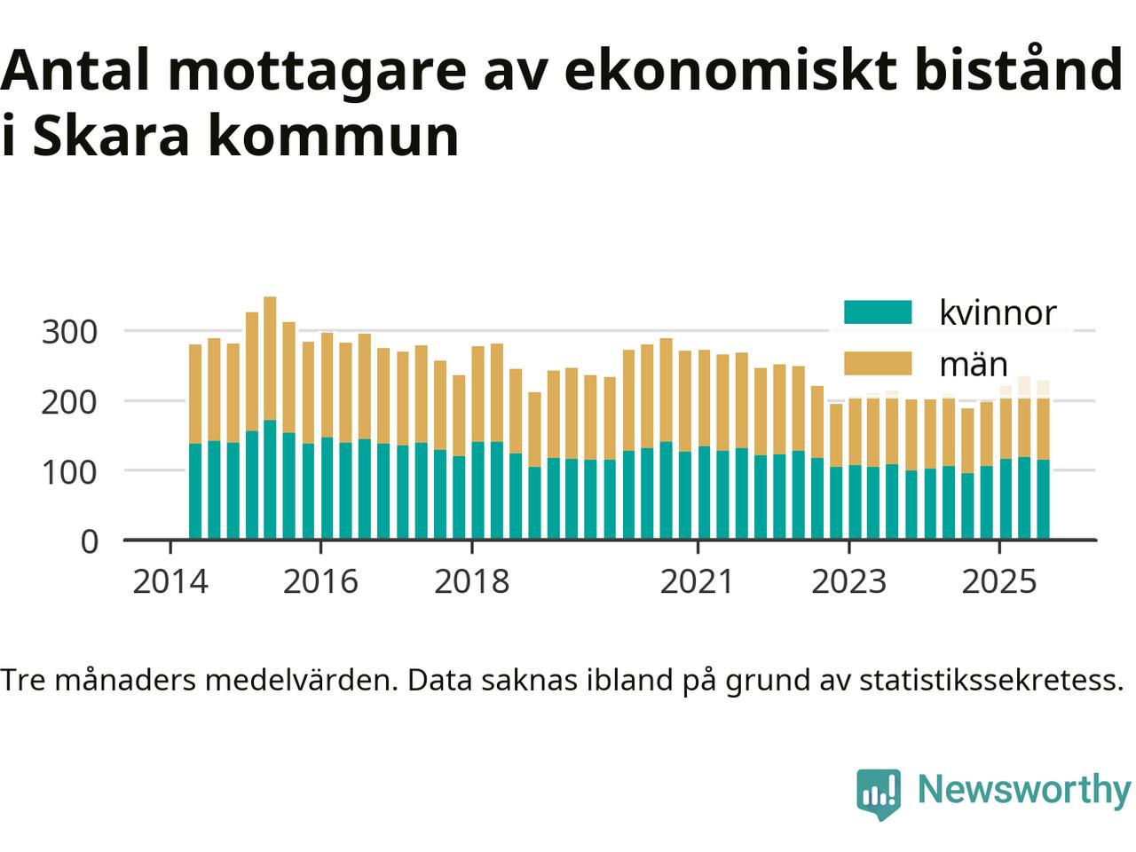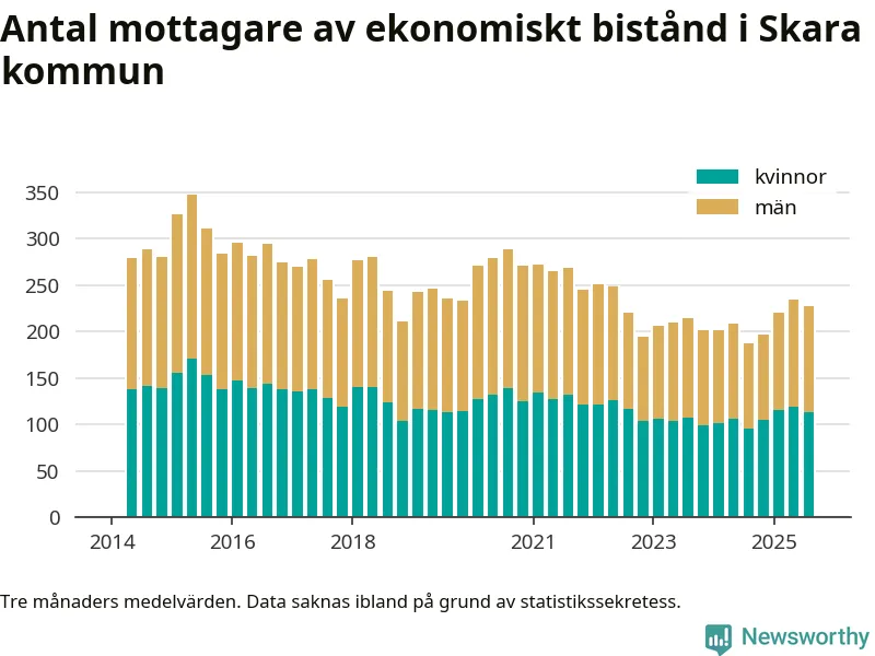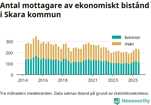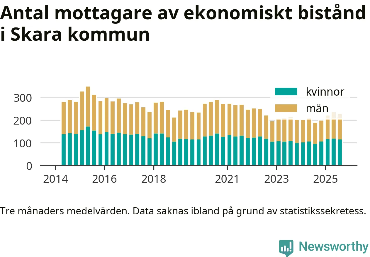 I genomsnitt 227 personer per månad fick ekonomiskt bistånd i Skara kommun under sommarmånaderna (juni till augusti), vilket motsvarar 1,2 procent av den vuxna befolkningen. Det är marginellt mindre än i våras, och något större andel än under sommaren för ett år sedan.