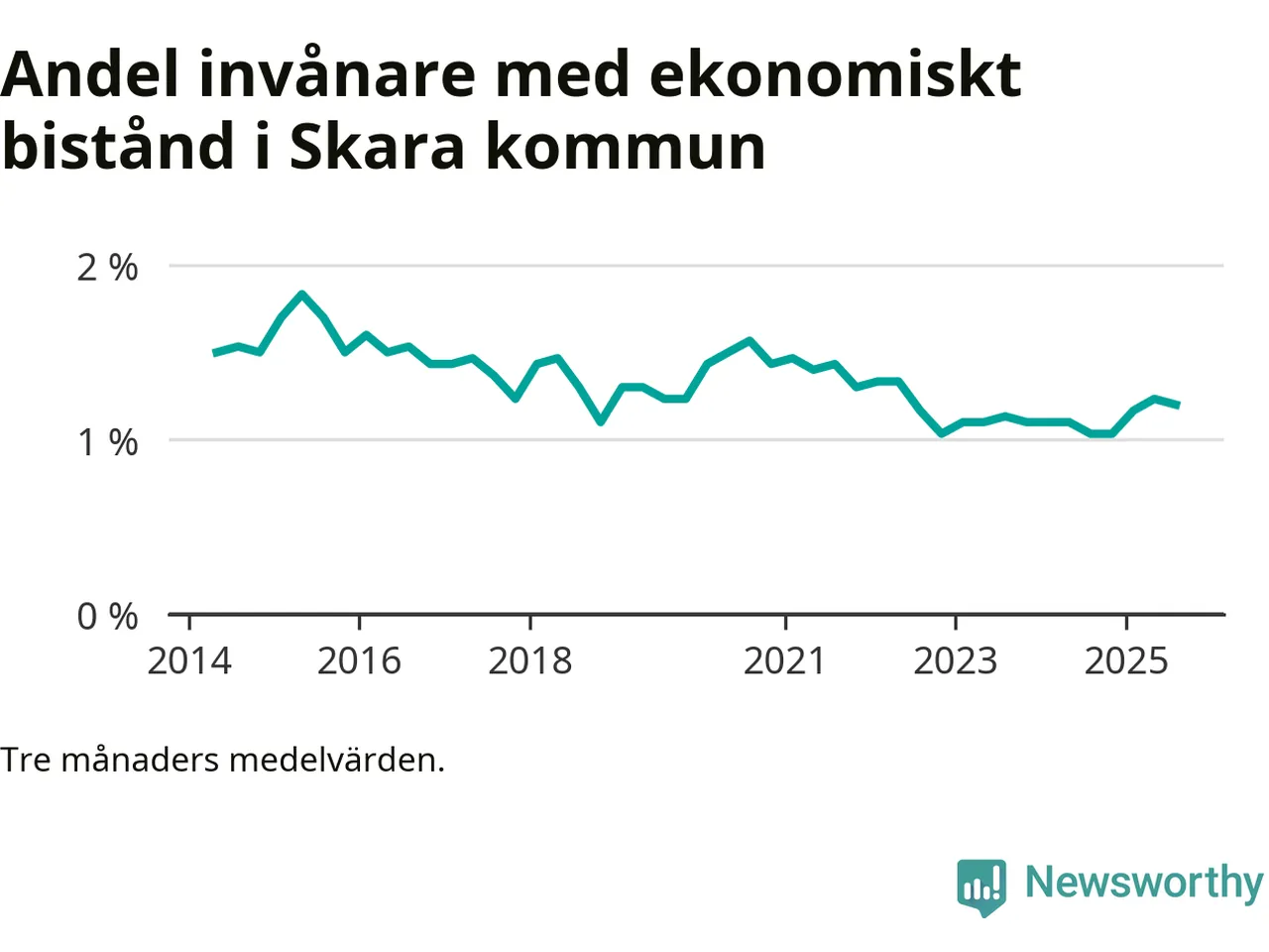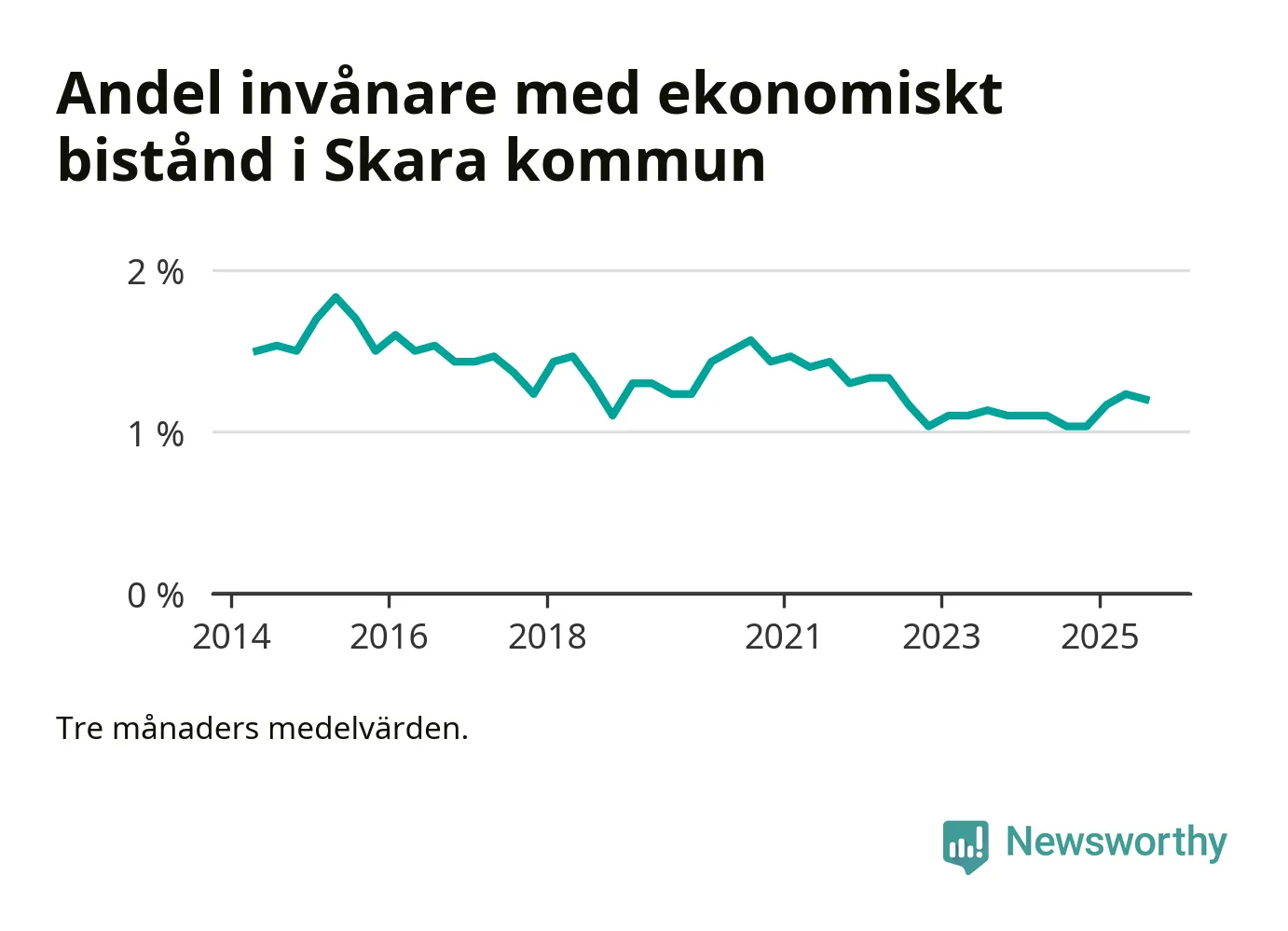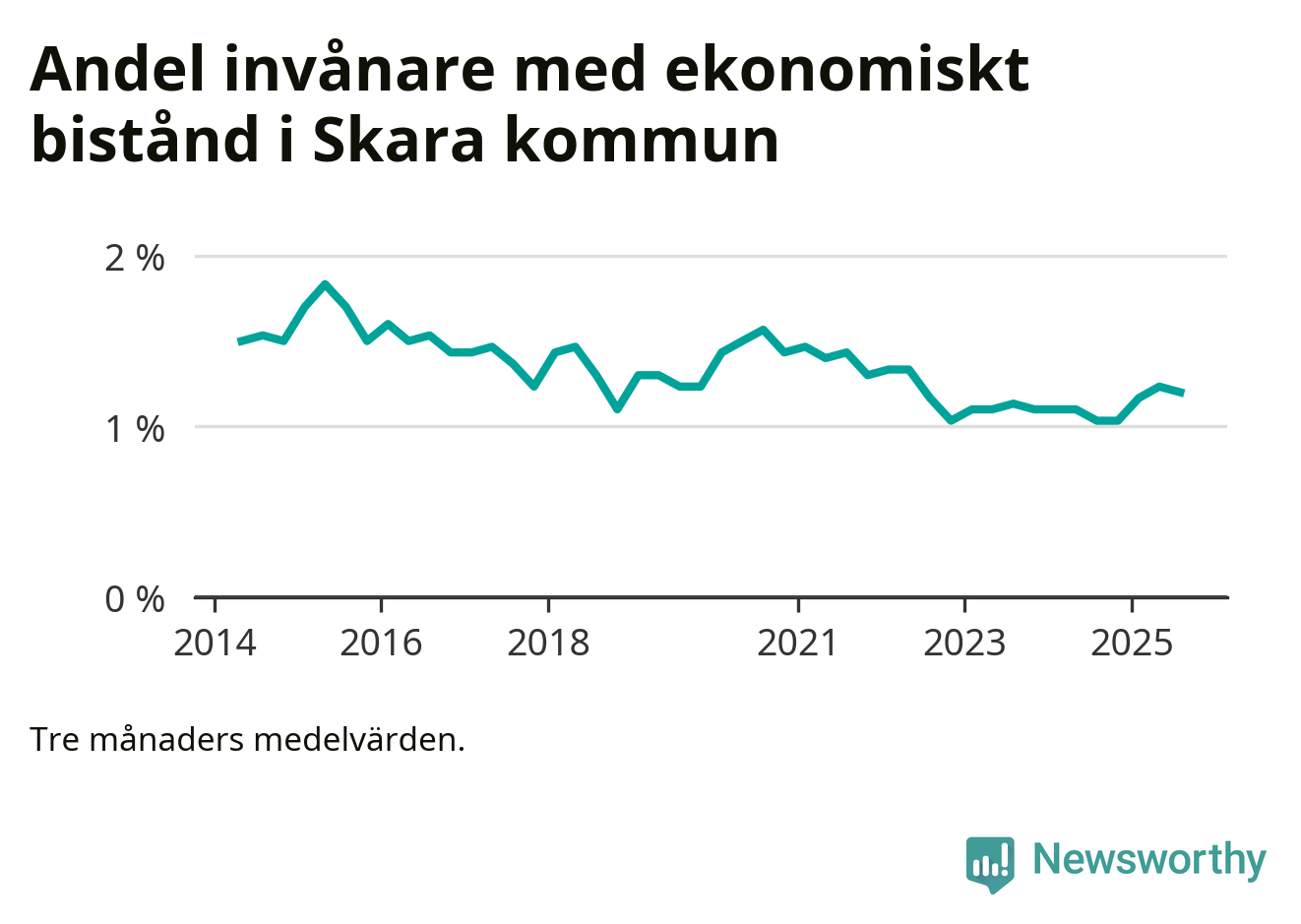 Den högsta andelen biståndstagare under det senaste decenniet hade kommunen under våren 2015 (1,8 procent), och den lägsta andelen under hösten 2022 (1 procent).