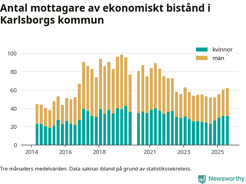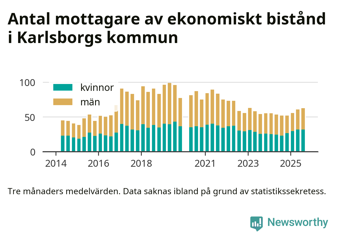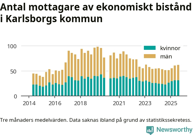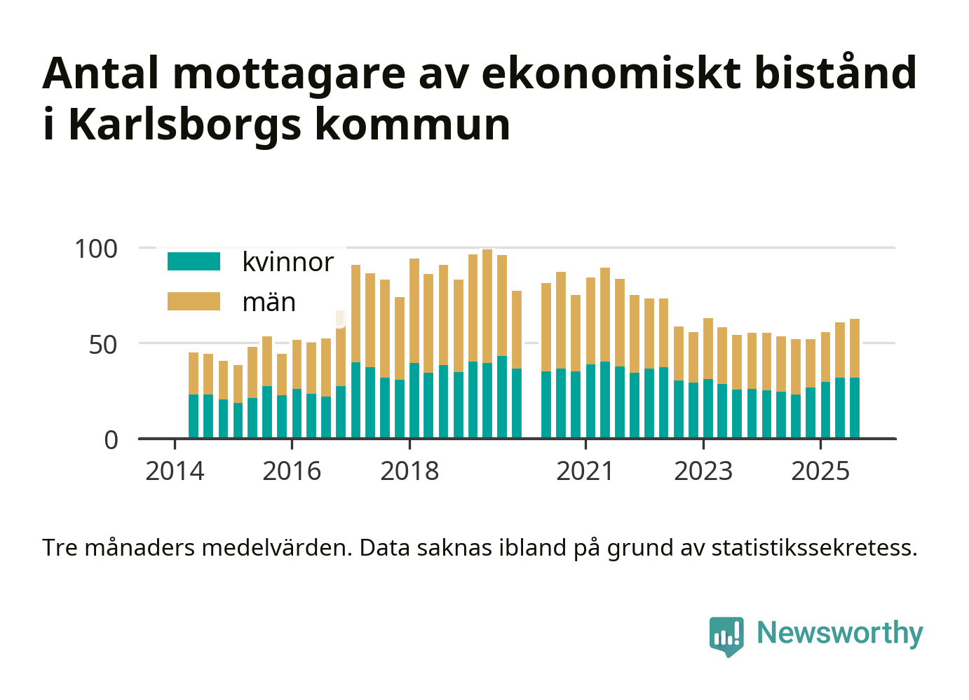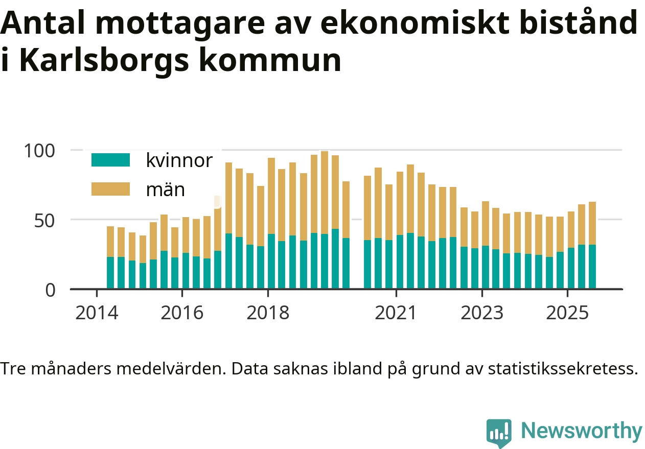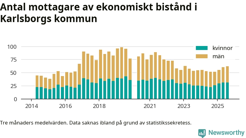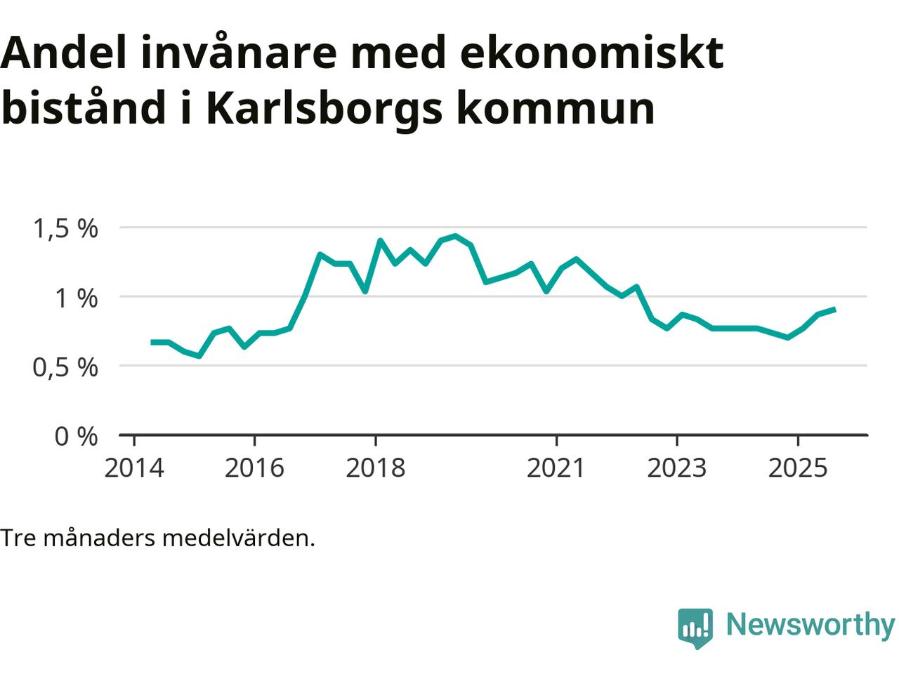 I genomsnitt 62 personer per månad fick ekonomiskt bistånd i Karlsborgs kommun under sommarmånaderna (juni till augusti), vilket motsvarar 0,9 procent av den vuxna befolkningen. Det är marginellt mer än i våras, och något större andel än under sommaren för ett år sedan.