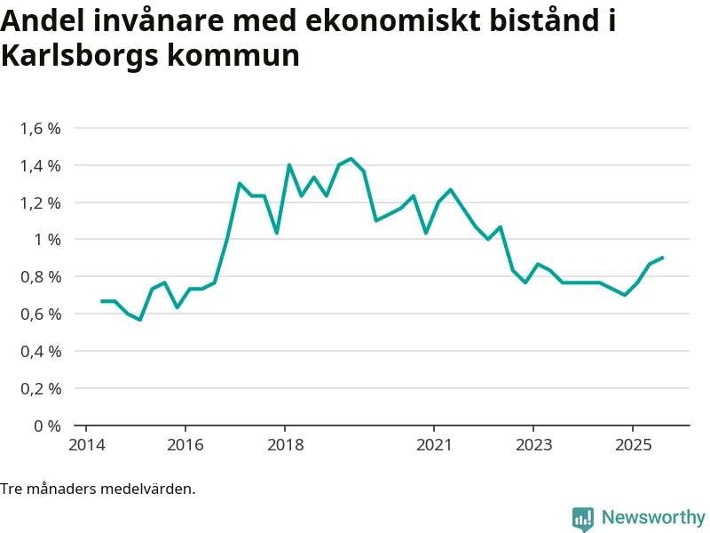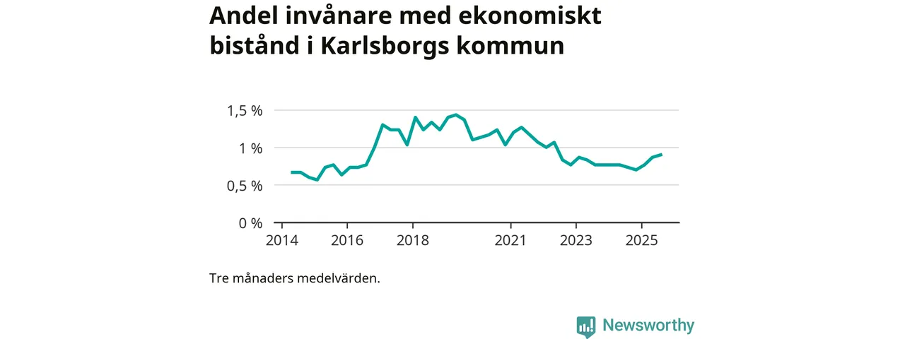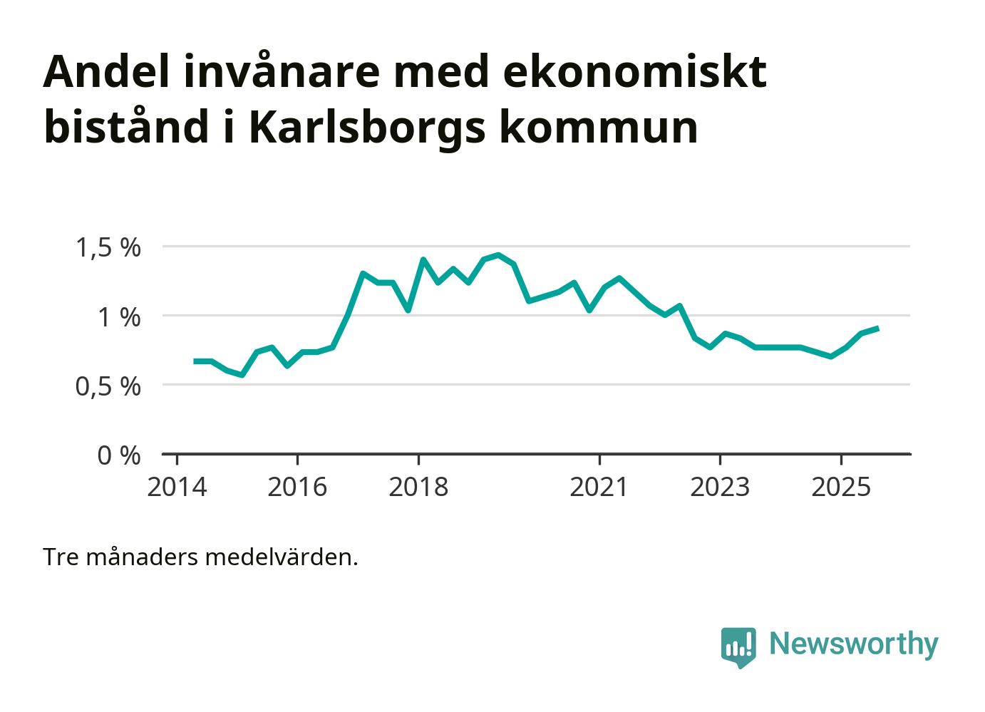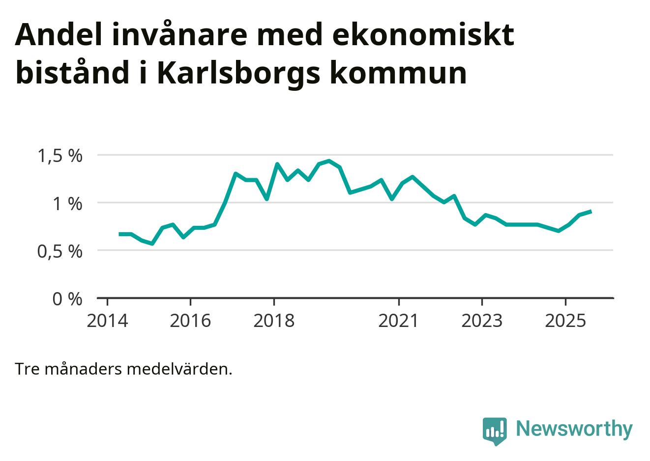 Den högsta andelen biståndstagare under det senaste decenniet hade kommunen under våren 2019 (1,4 procent), och den lägsta andelen under vintern 2015 (0,6 procent).