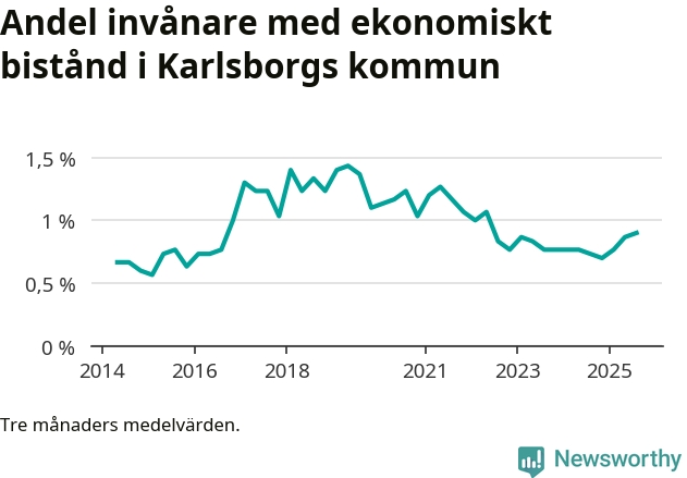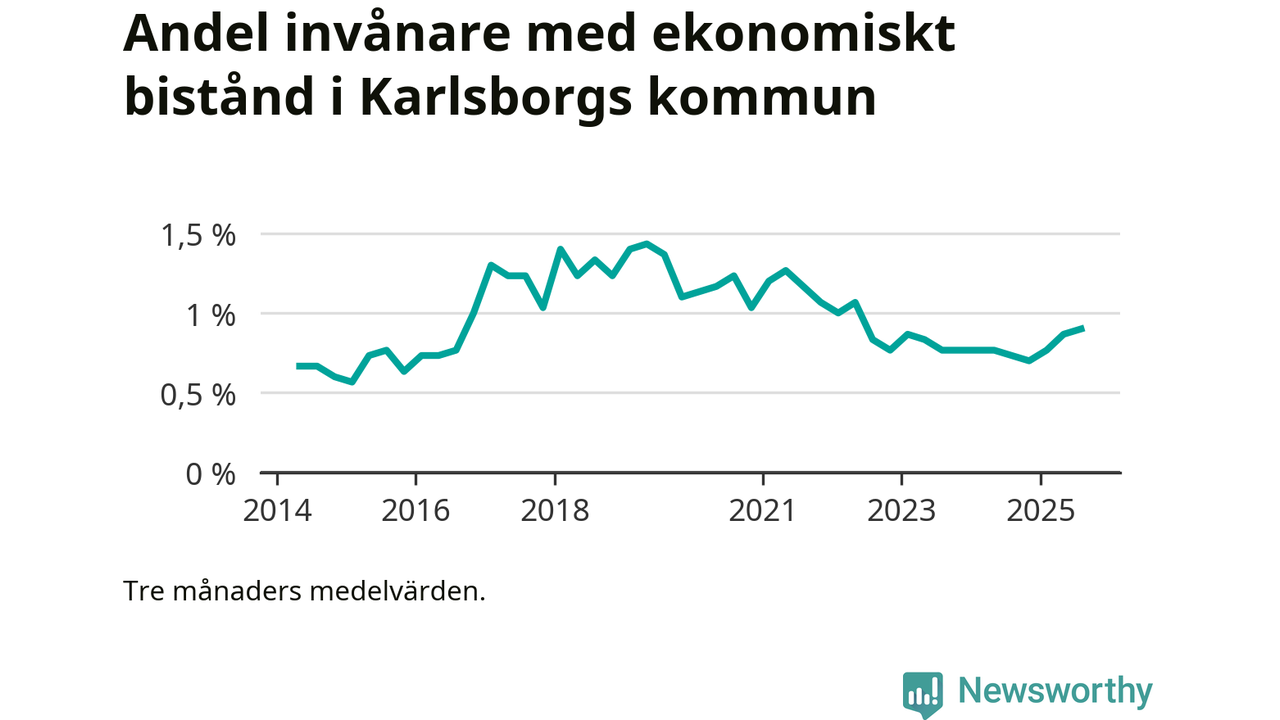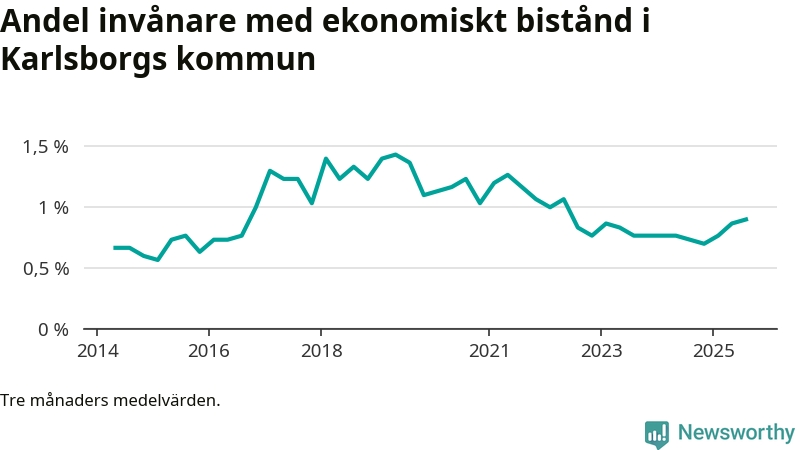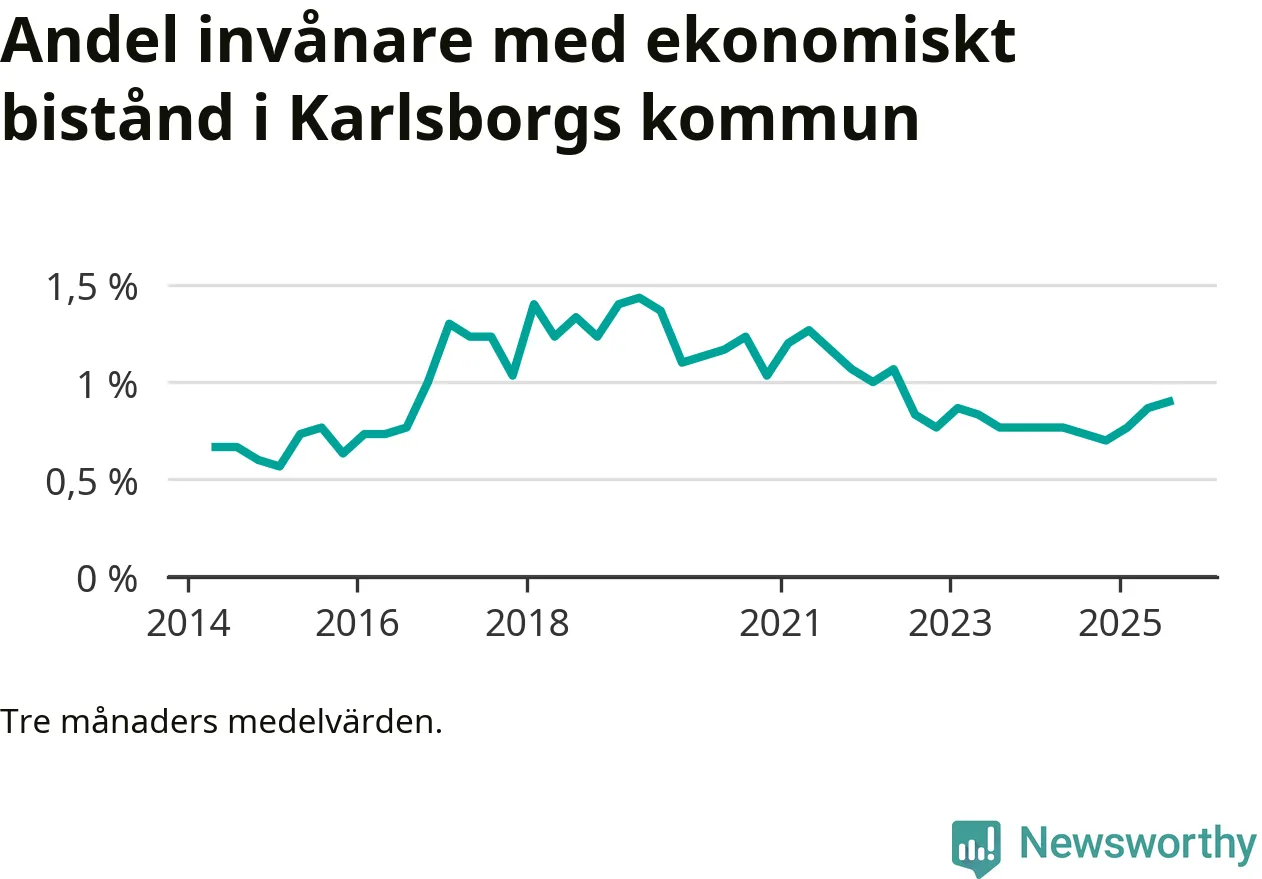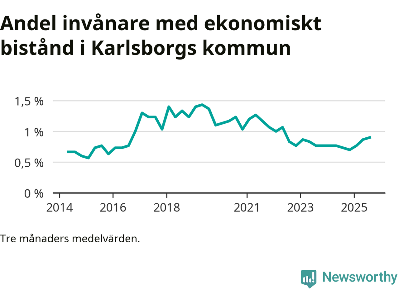 Den högsta andelen biståndstagare under det senaste decenniet hade kommunen under våren 2019 (1,4 procent), och den lägsta andelen under vintern 2015 (0,6 procent).