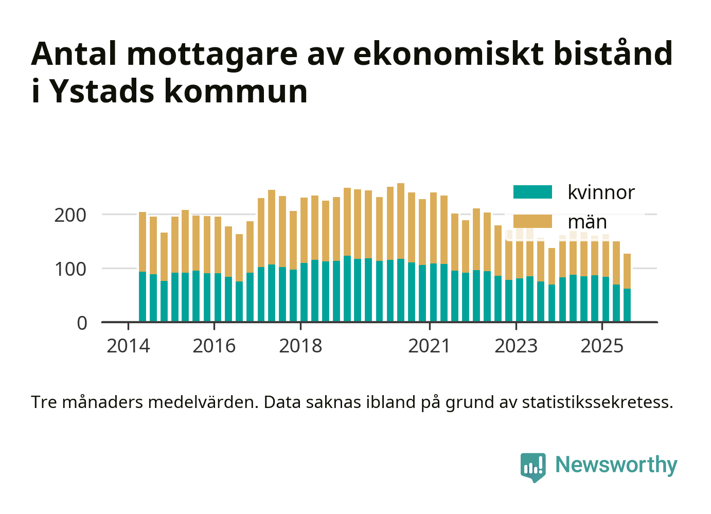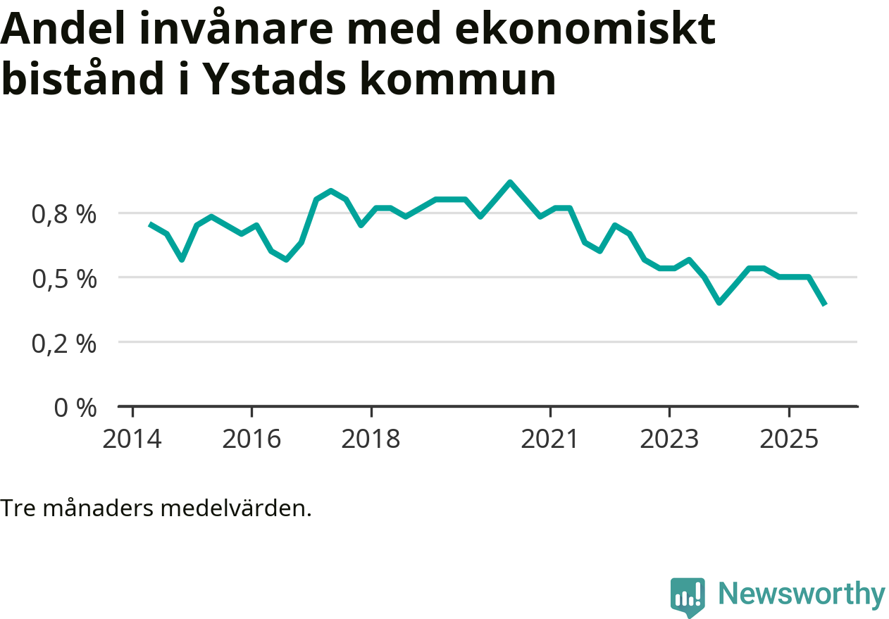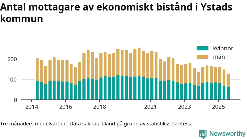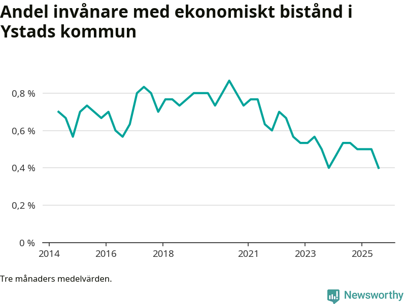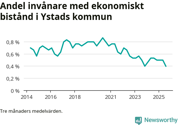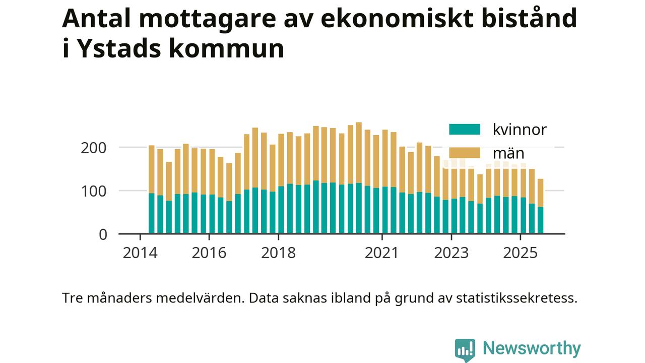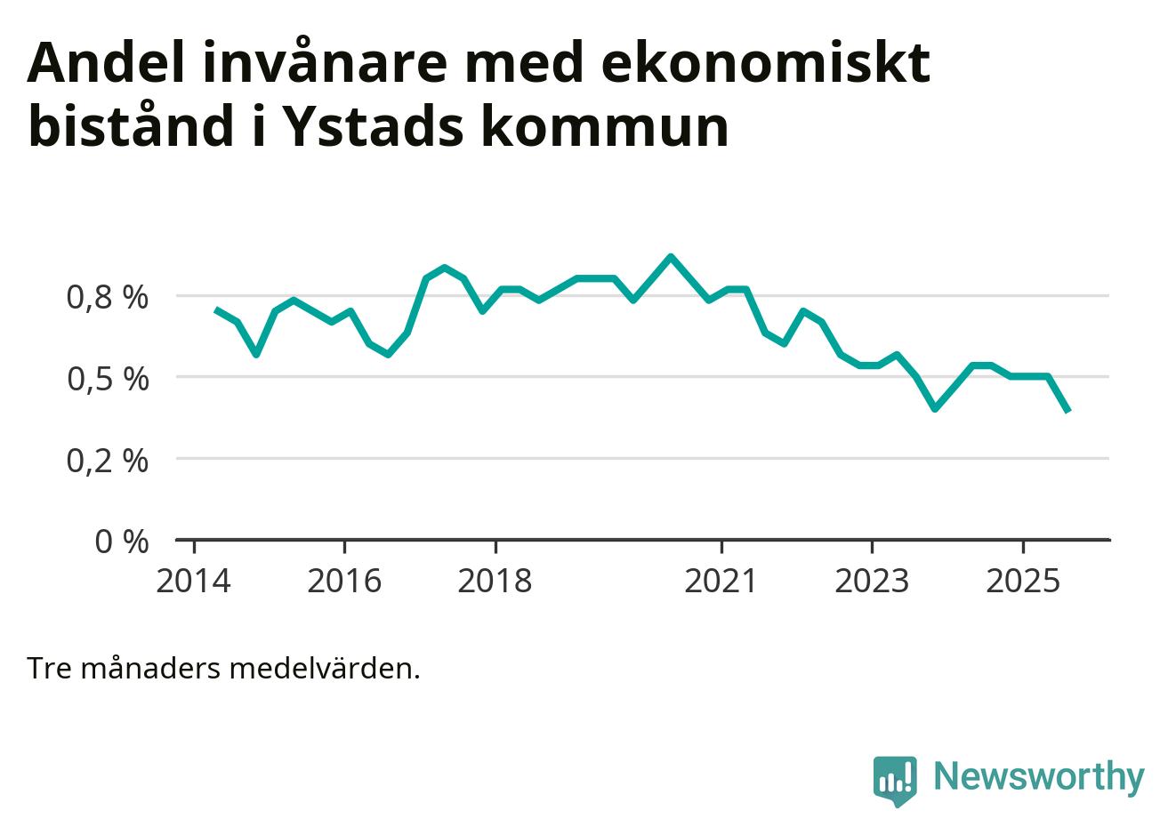 I genomsnitt 126 personer per månad fick ekonomiskt bistånd i Ystads kommun under sommarmånaderna (juni till augusti), vilket motsvarar 0,4 procent av den vuxna befolkningen. Det är marginellt mindre än i våras, och något mindre andel än under sommaren för ett år sedan.
