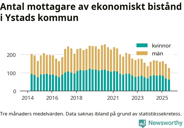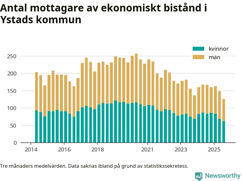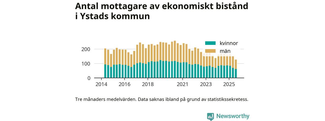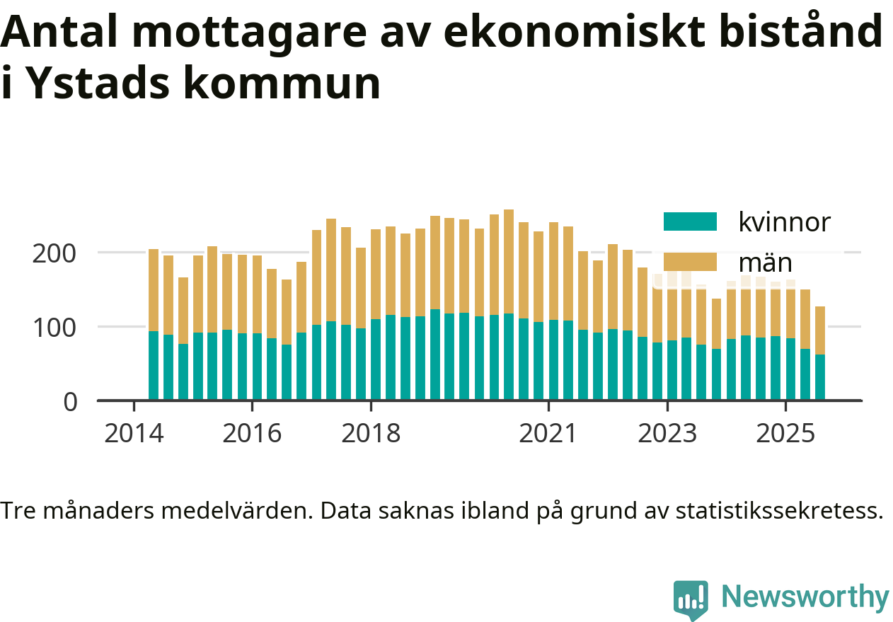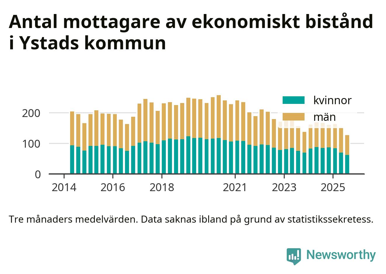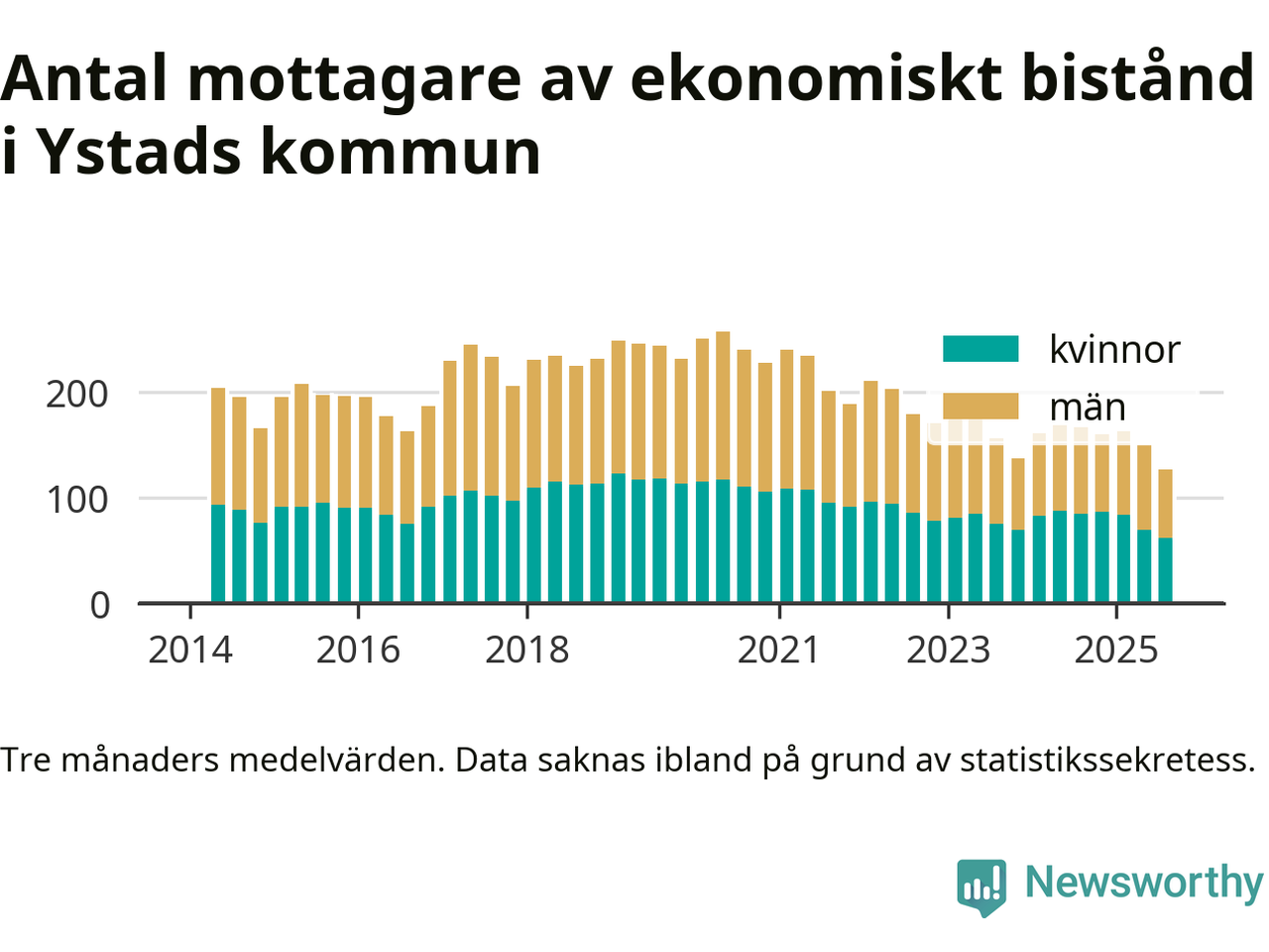 I genomsnitt 126 personer per månad fick ekonomiskt bistånd i Ystads kommun under sommarmånaderna (juni till augusti), vilket motsvarar 0,4 procent av den vuxna befolkningen. Det är marginellt mindre än i våras, och något mindre andel än under sommaren för ett år sedan.