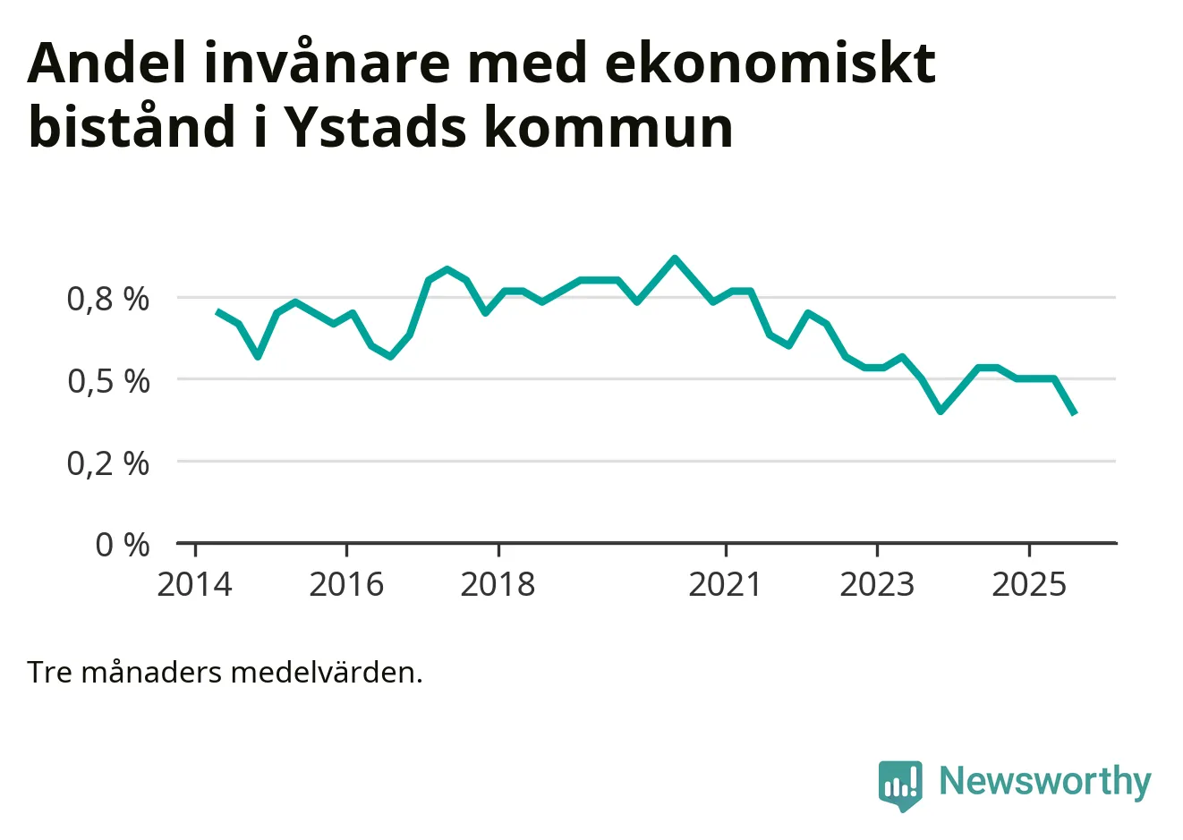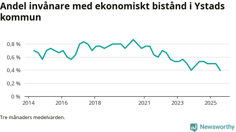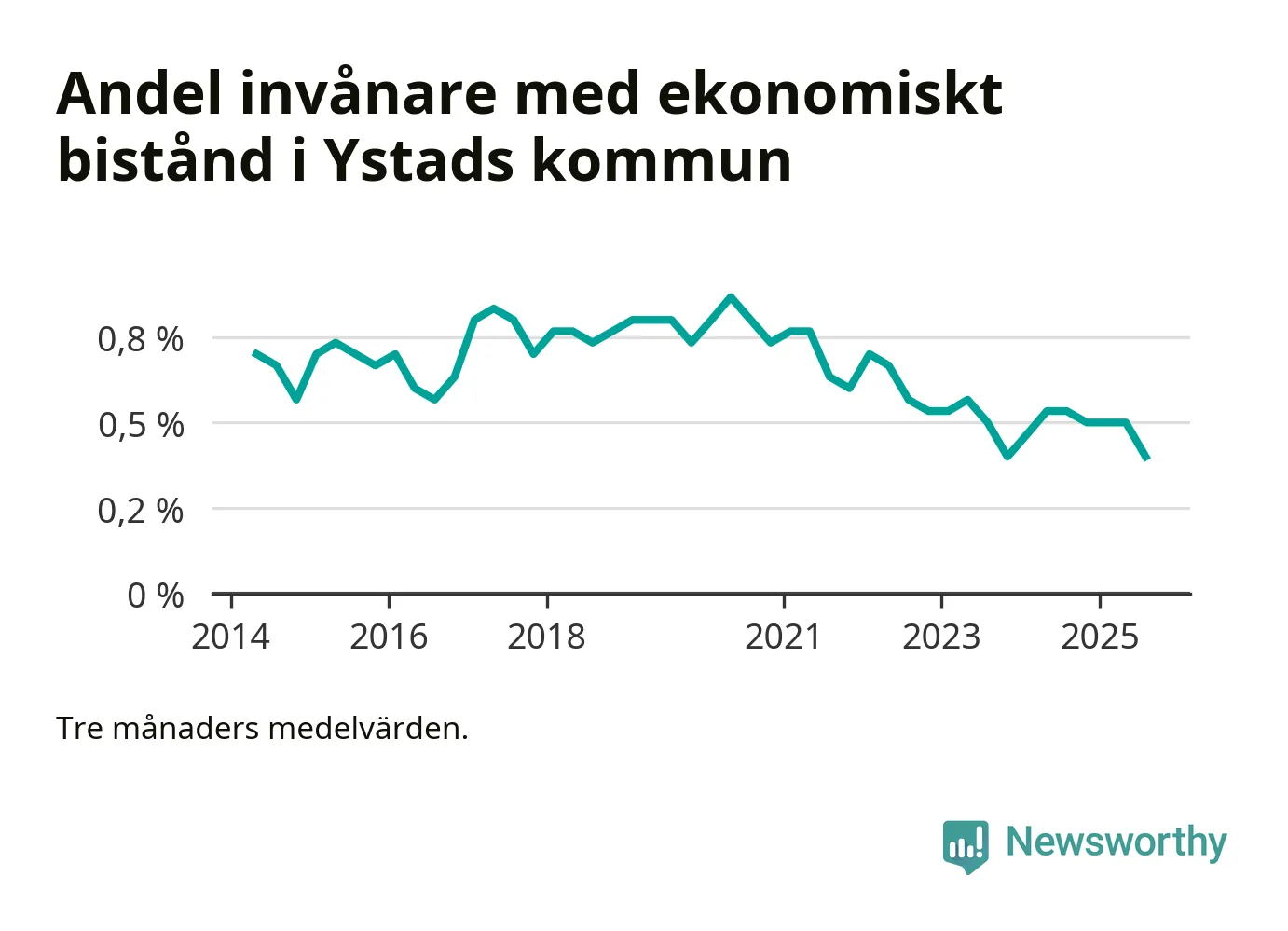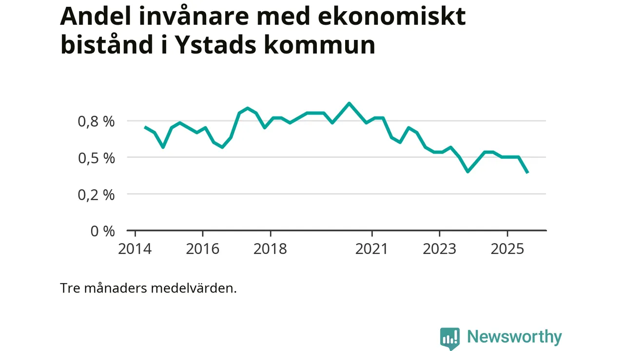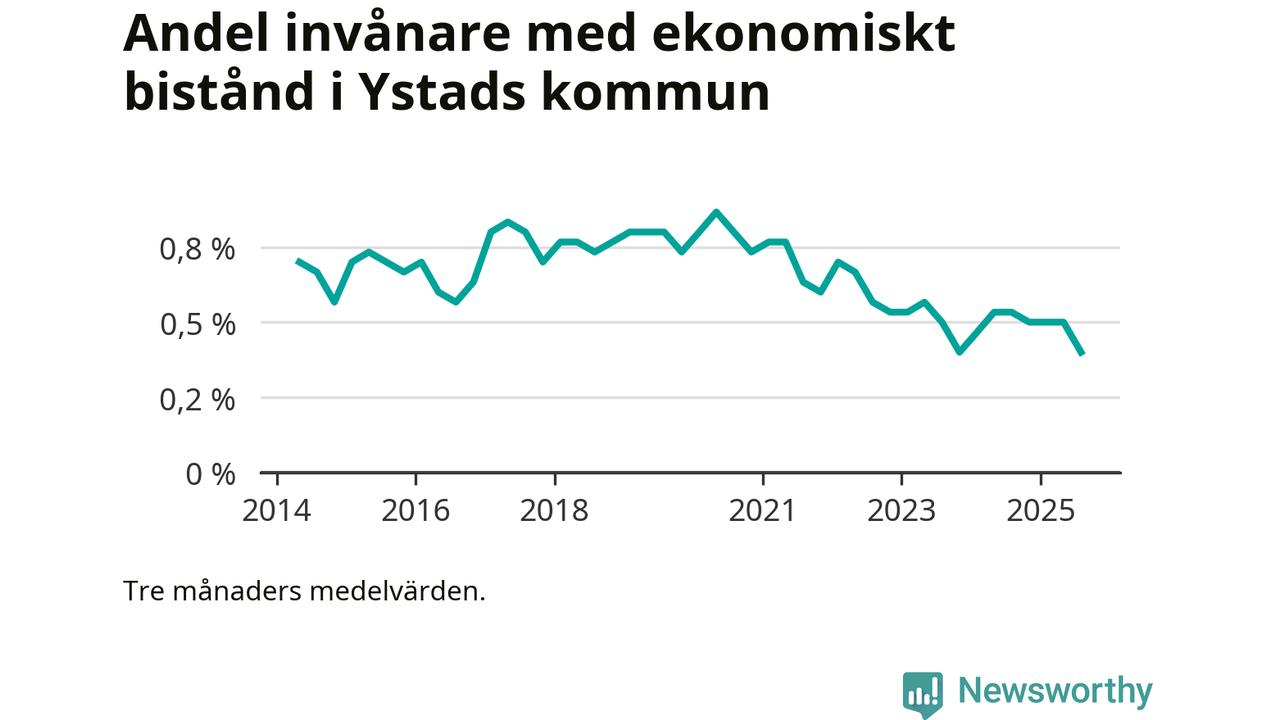 Andelen invånare med ekonomiskt bistånd i Ystads kommun var lägre under sommaren jämfört med motsvarande period året innan. Det visar den senaste, preliminära statistiken från Socialstyrelsen.