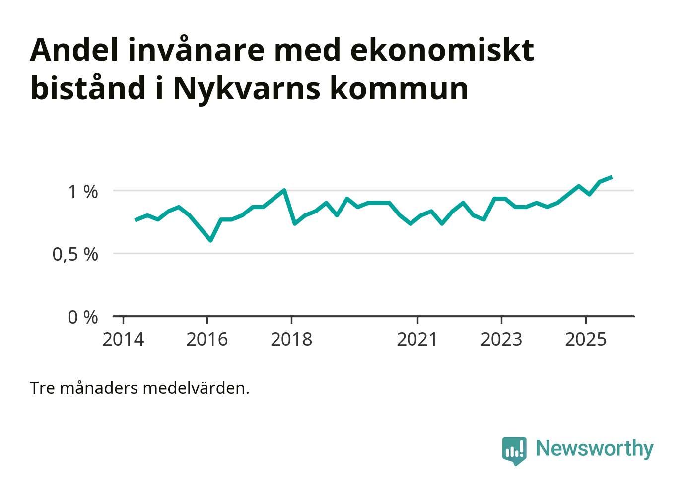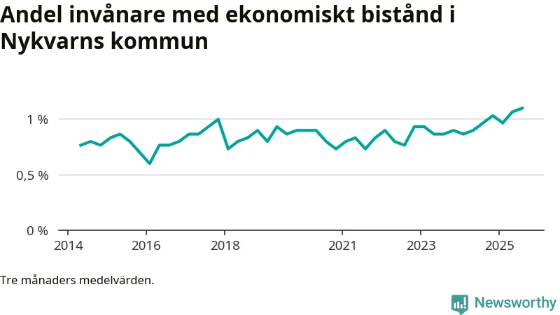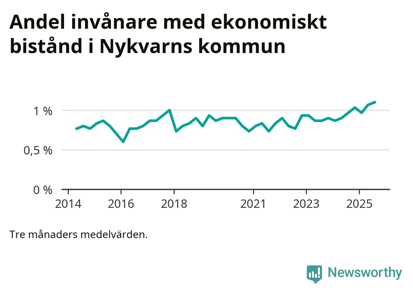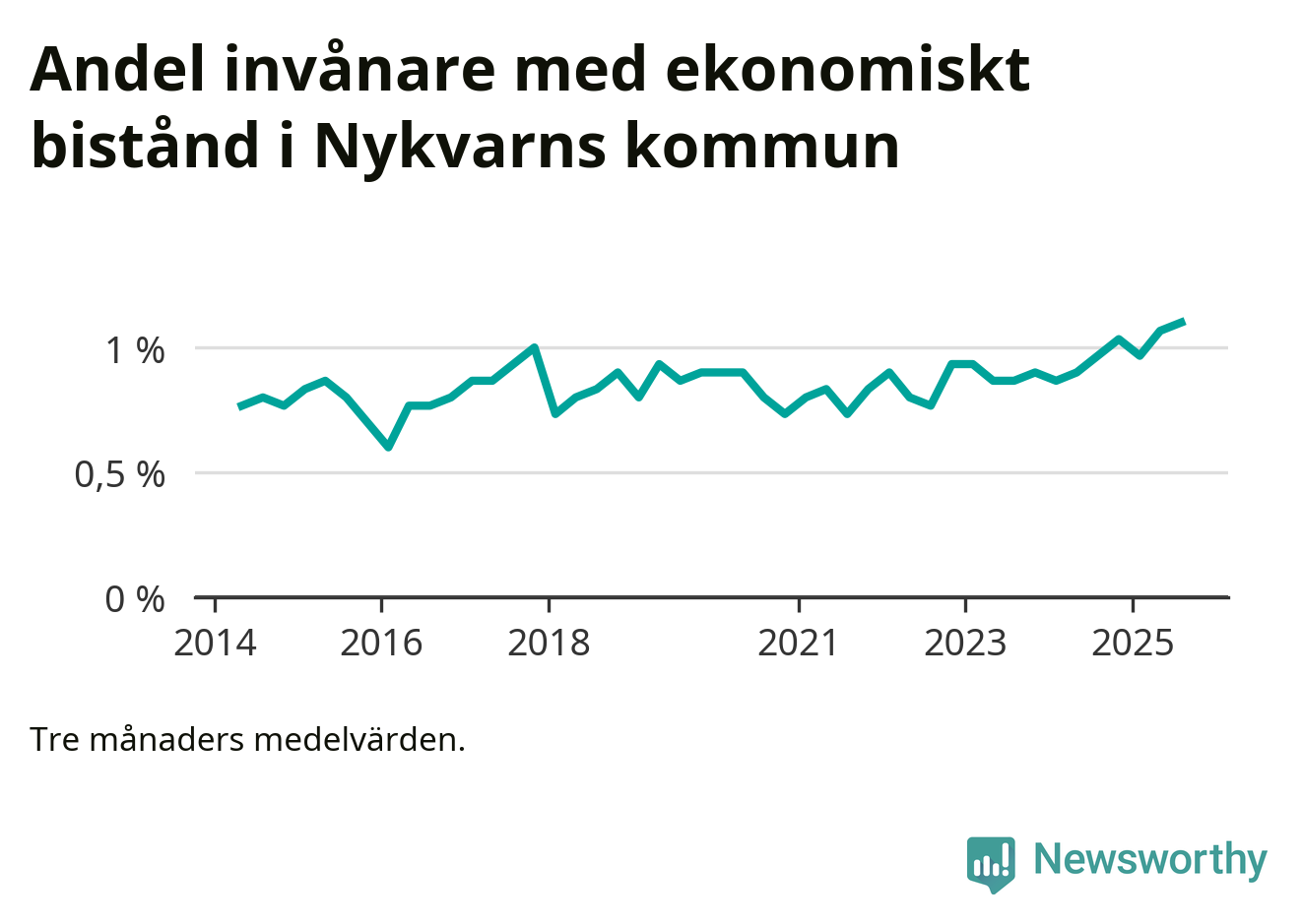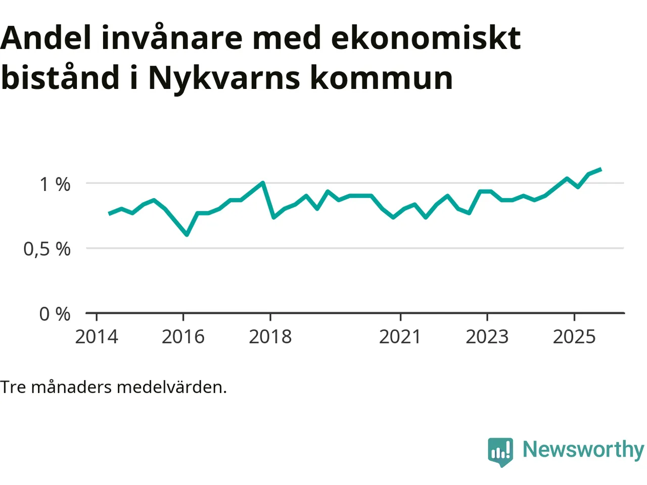 Andelen invånare med ekonomiskt bistånd i Nykvarns kommun var under sommaren den högsta sedan åtminstone 2014. Det visar den senaste, preliminära statistiken från Socialstyrelsen.