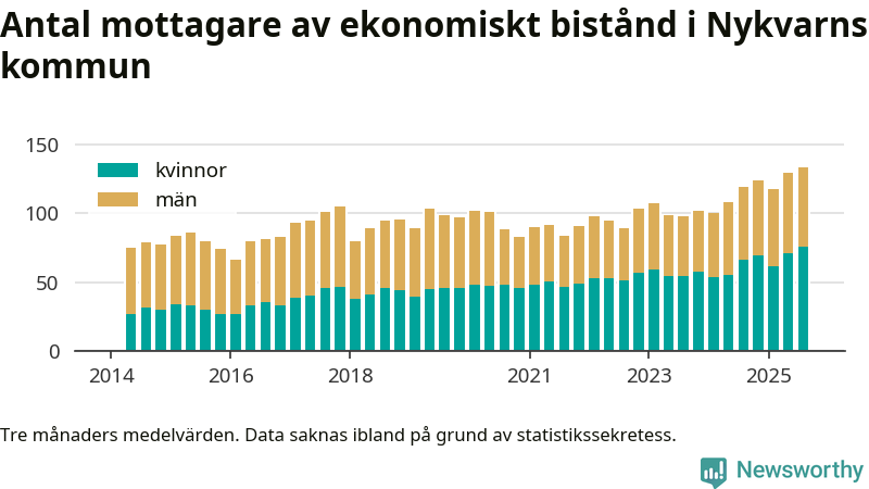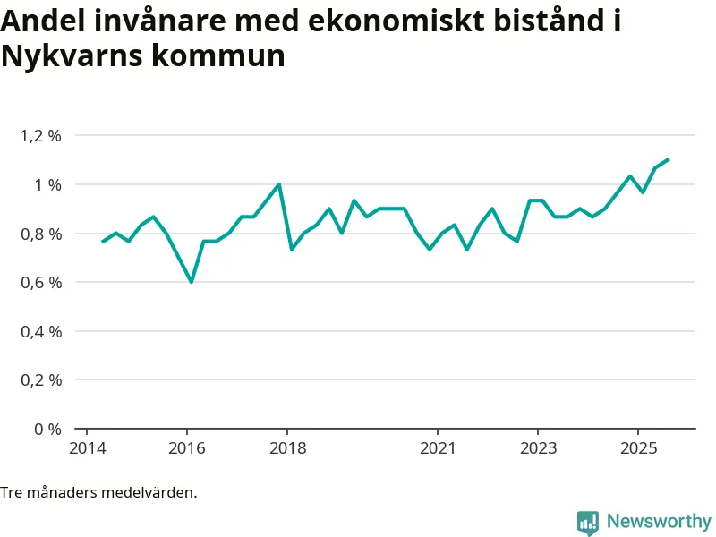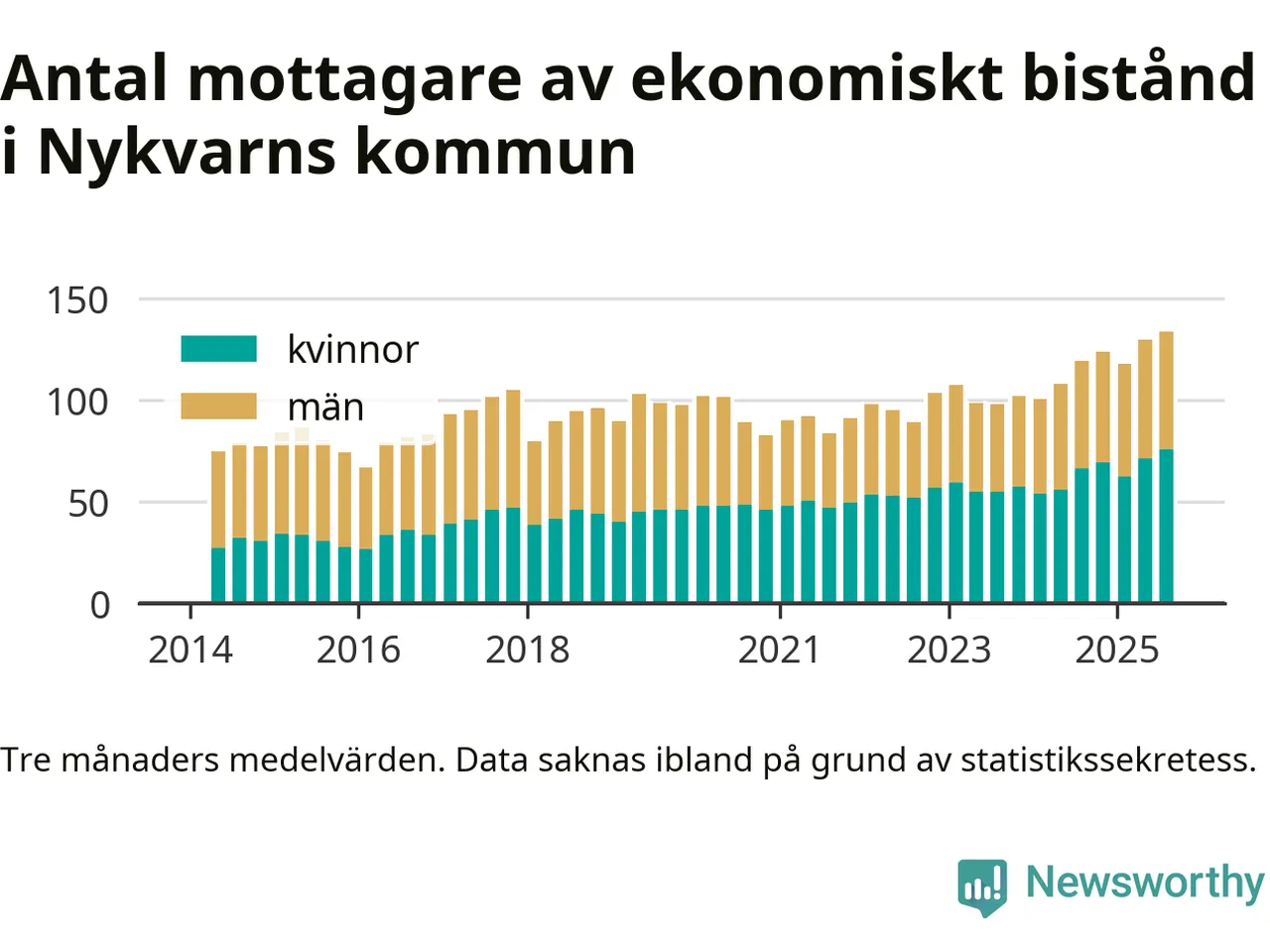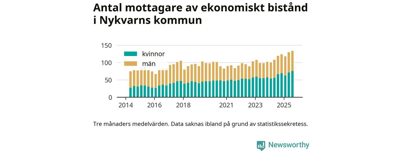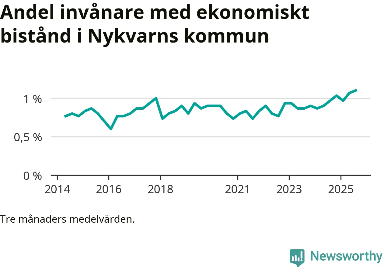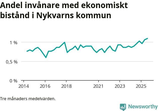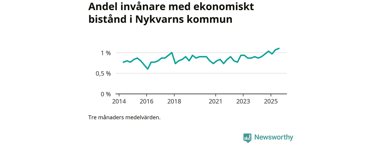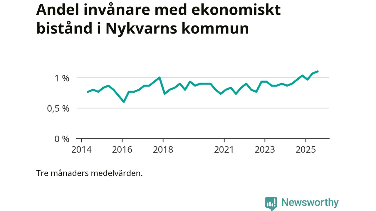 Andelen invånare med ekonomiskt bistånd i Nykvarns kommun var under sommaren den högsta sedan åtminstone 2014. Det visar den senaste, preliminära statistiken från Socialstyrelsen.