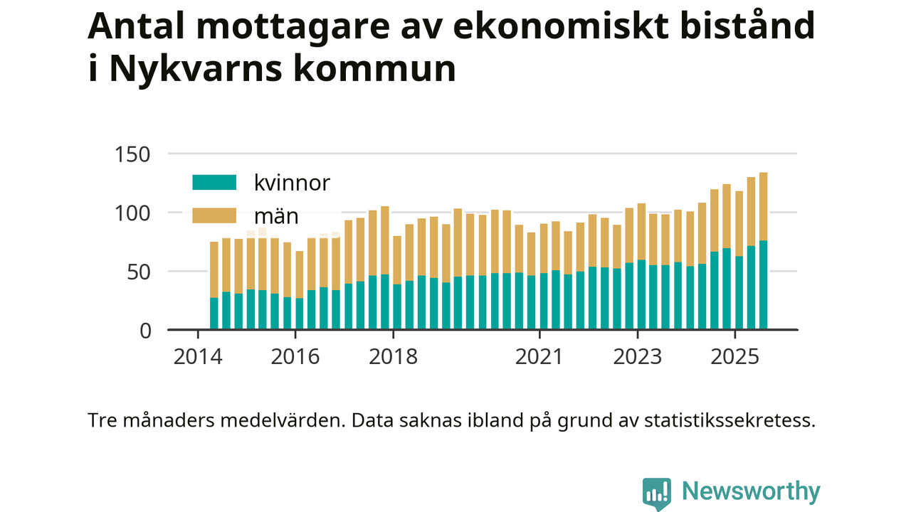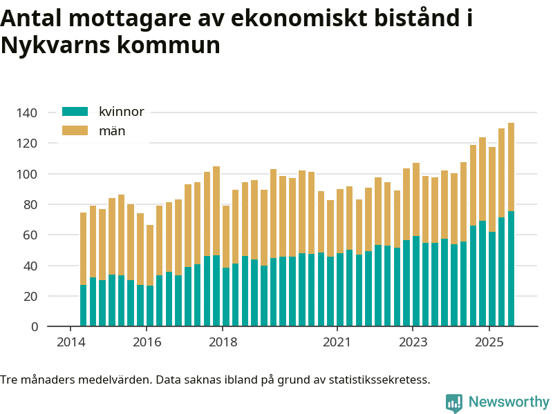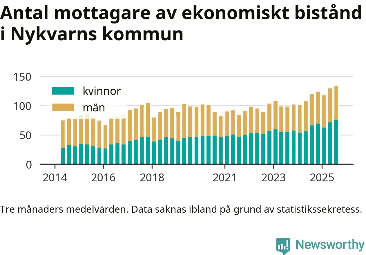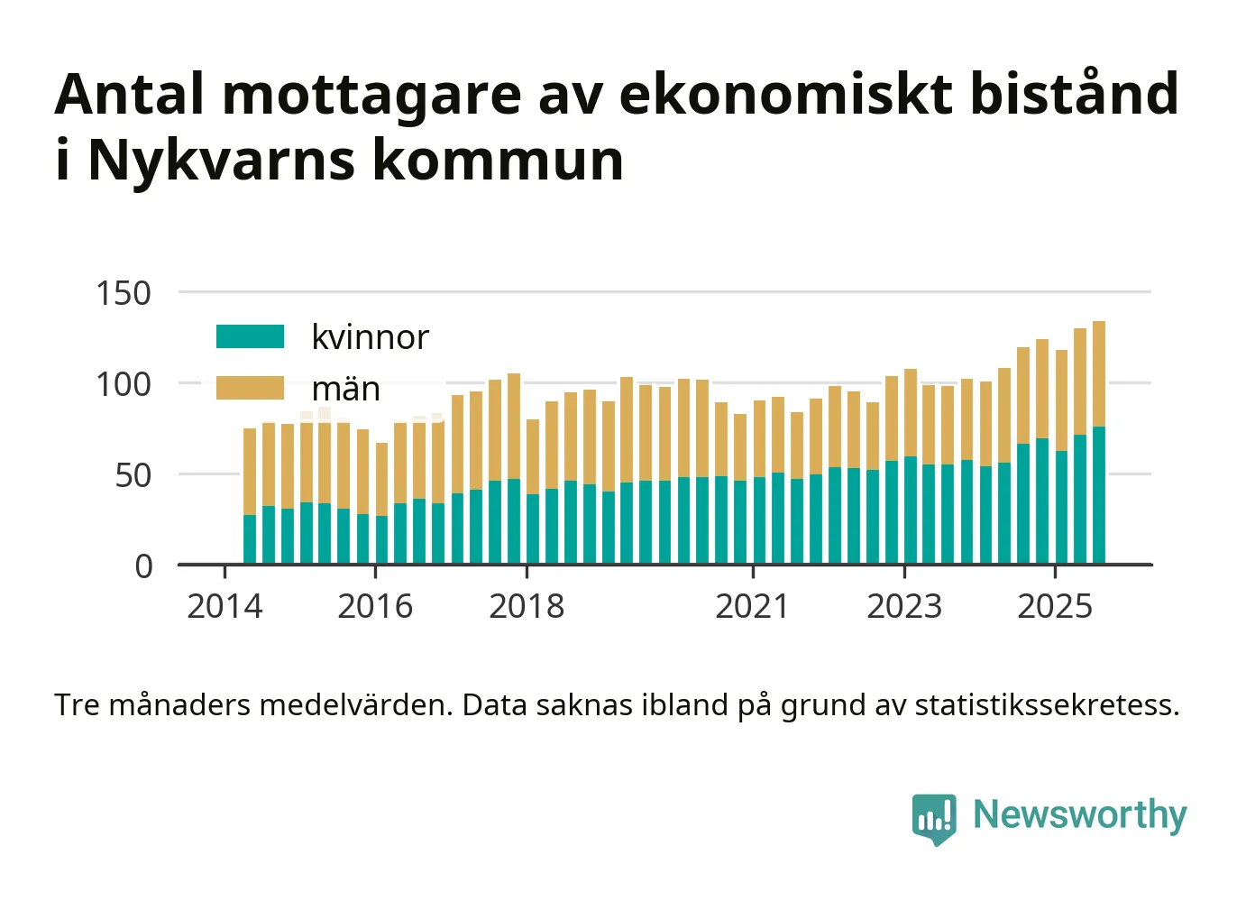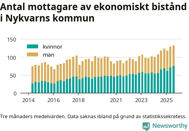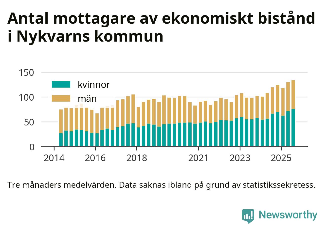 Andelen invånare med ekonomiskt bistånd i Nykvarns kommun var under sommaren den högsta sedan åtminstone 2014. Det visar den senaste, preliminära statistiken från Socialstyrelsen.