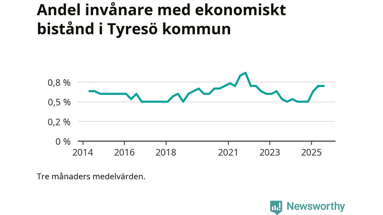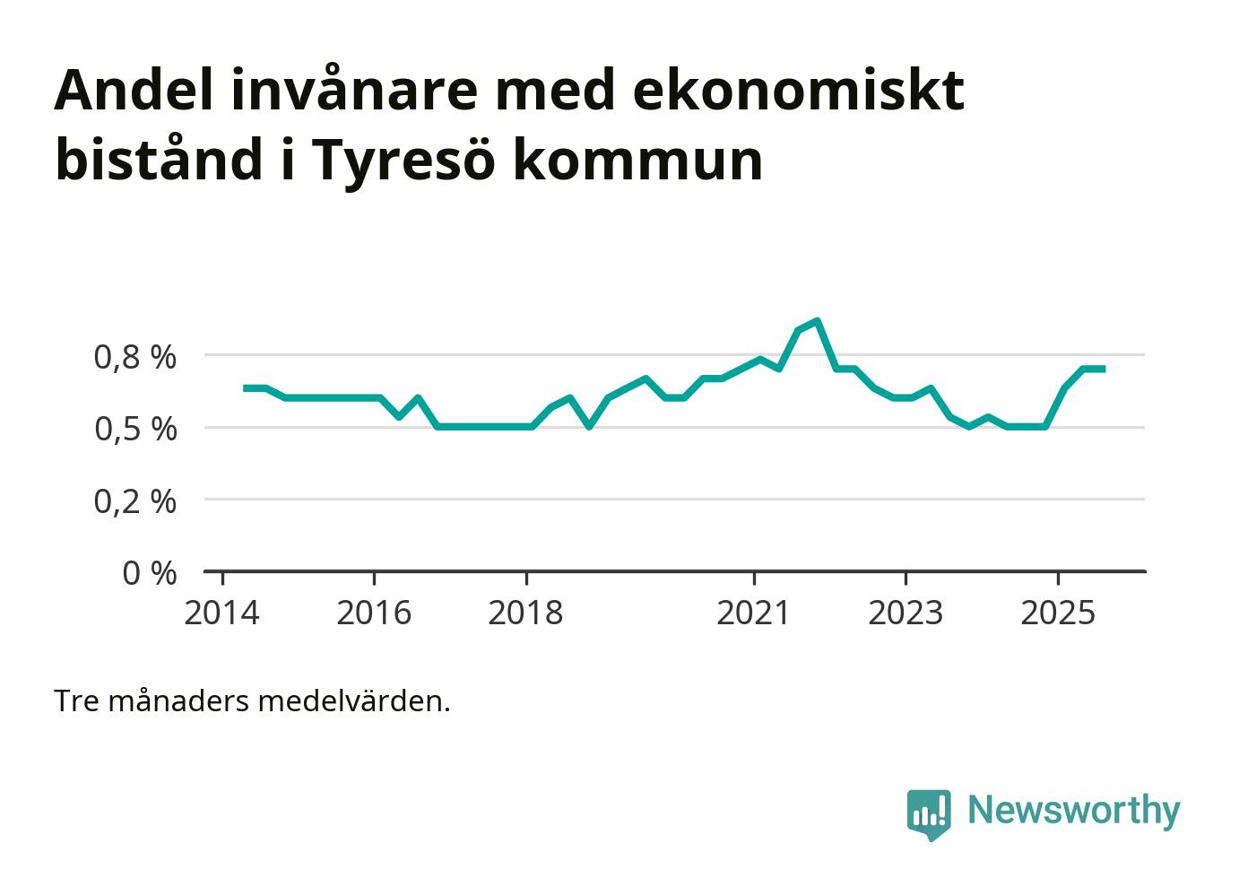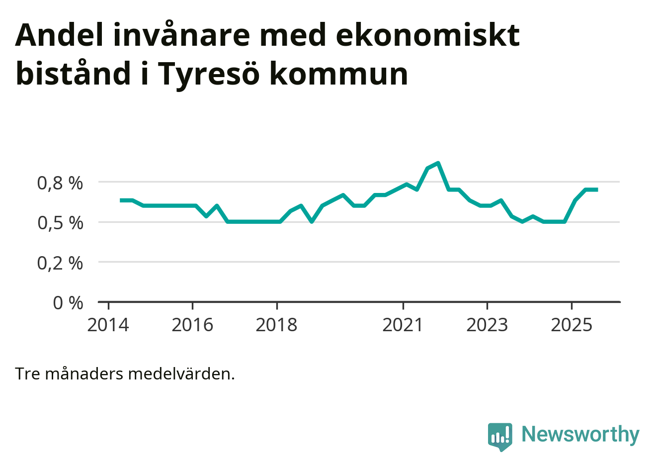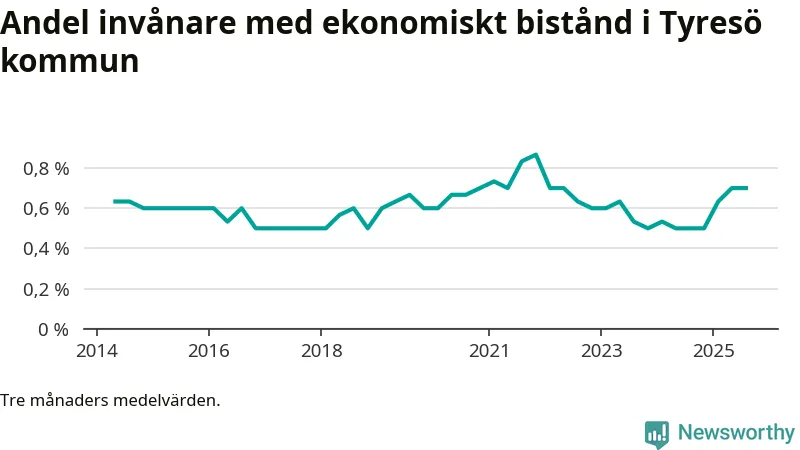 I genomsnitt 335 personer per månad fick ekonomiskt bistånd i Tyresö kommun under sommarmånaderna (juni till augusti), vilket motsvarar 0,7 procent av den vuxna befolkningen. Det är lika stor andel som i våras, och något större andel än under sommaren för ett år sedan.