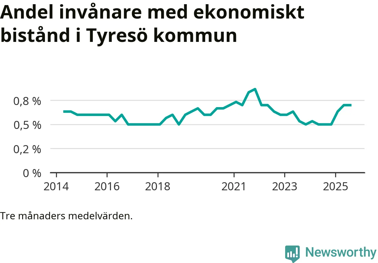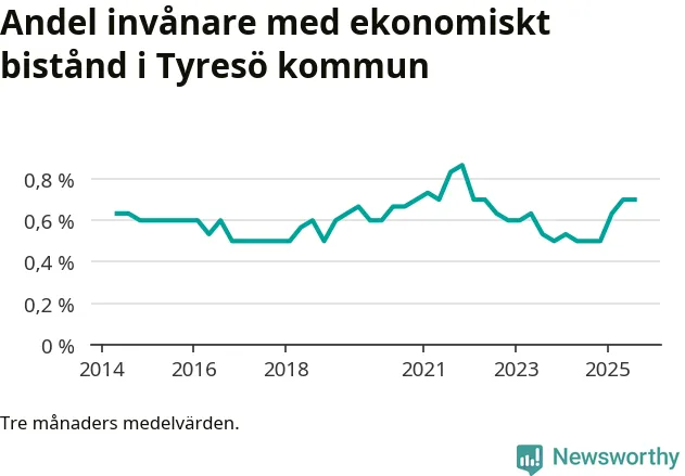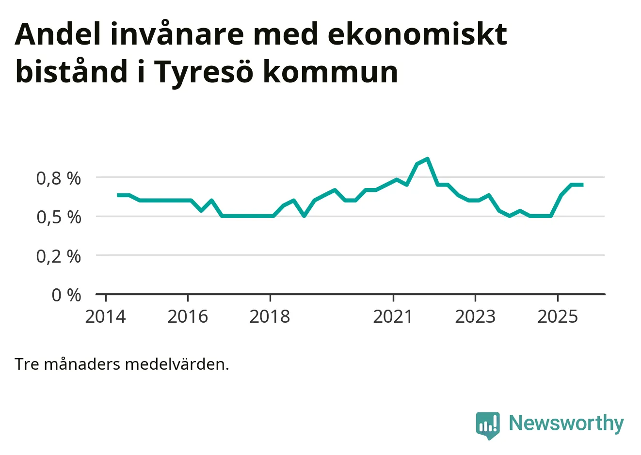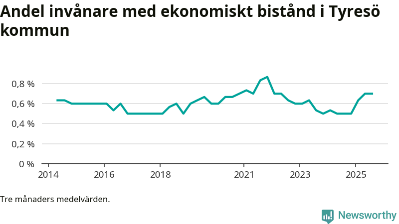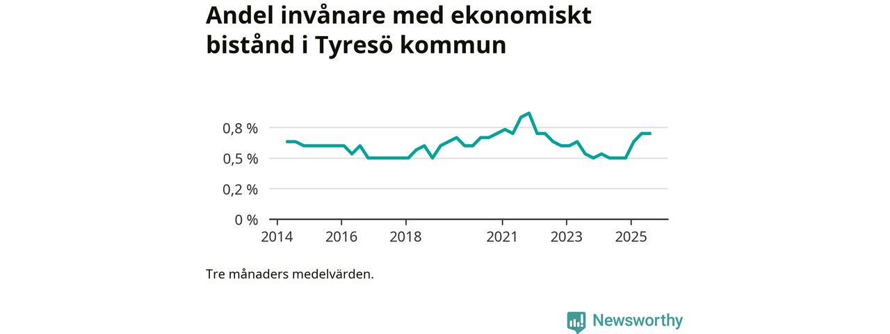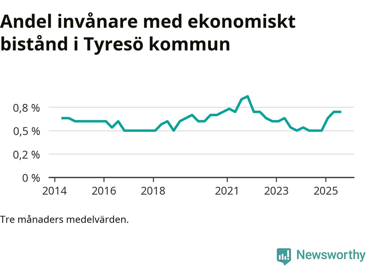 I genomsnitt 335 personer per månad fick ekonomiskt bistånd i Tyresö kommun under sommarmånaderna (juni till augusti), vilket motsvarar 0,7 procent av den vuxna befolkningen. Det är lika stor andel som i våras, och något större andel än under sommaren för ett år sedan.