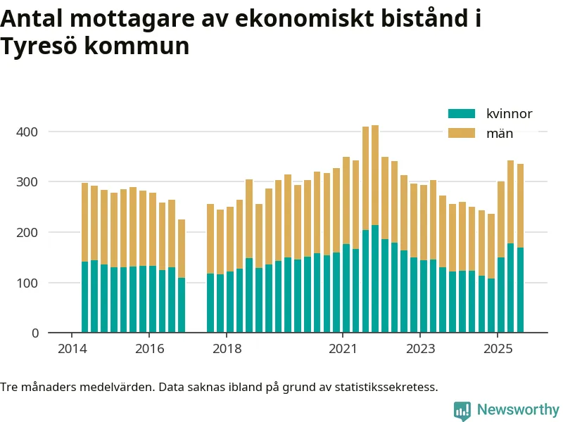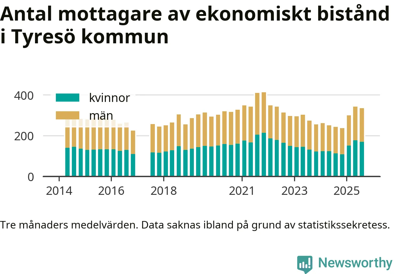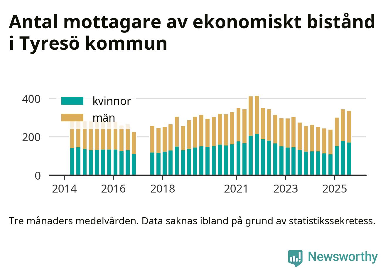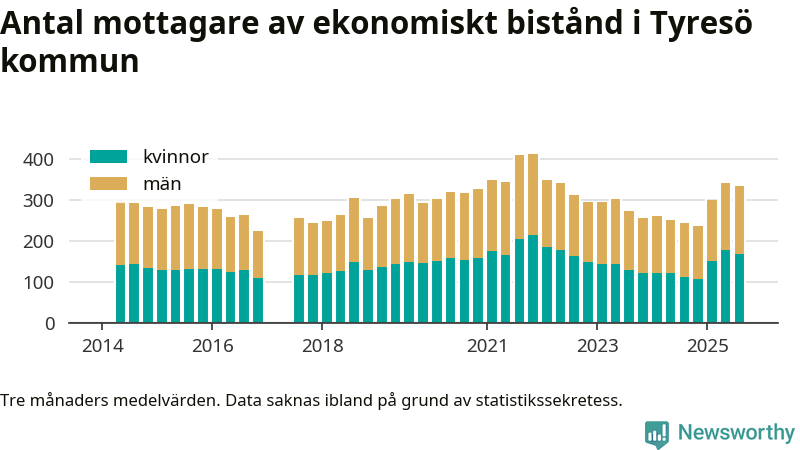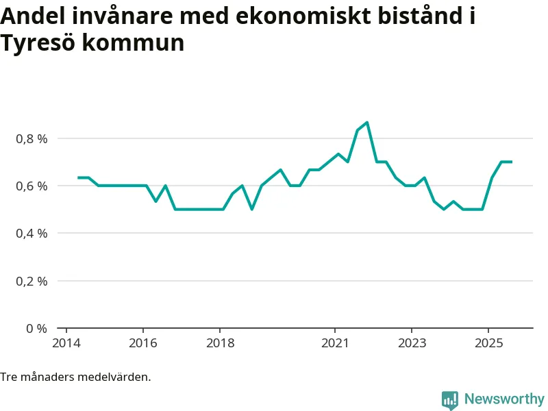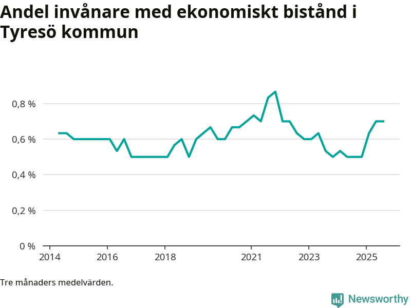 I genomsnitt 335 personer per månad fick ekonomiskt bistånd i Tyresö kommun under sommarmånaderna (juni till augusti), vilket motsvarar 0,7 procent av den vuxna befolkningen. Det är lika stor andel som i våras, och något större andel än under sommaren för ett år sedan.
