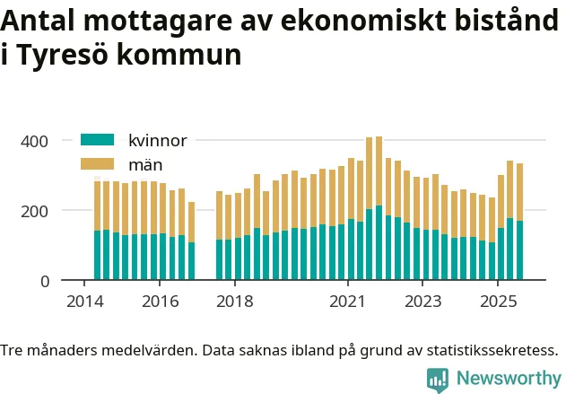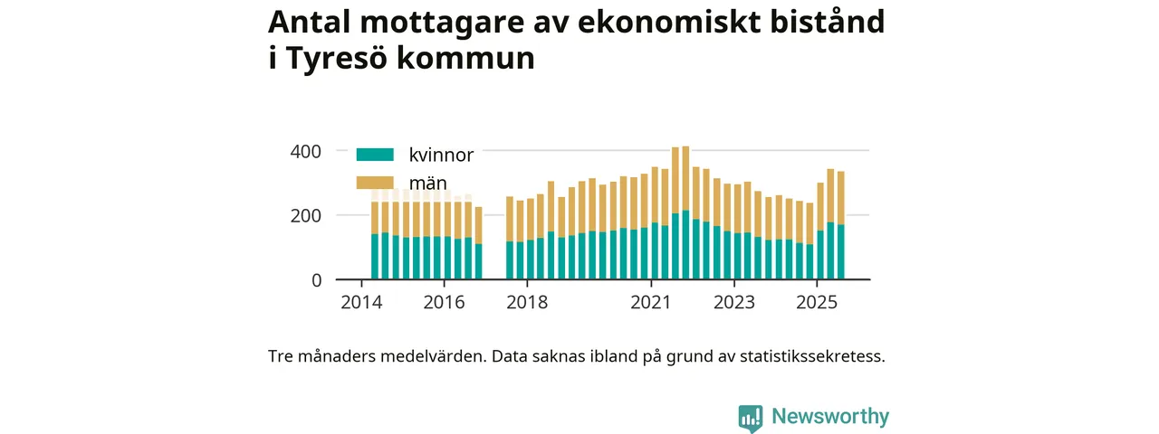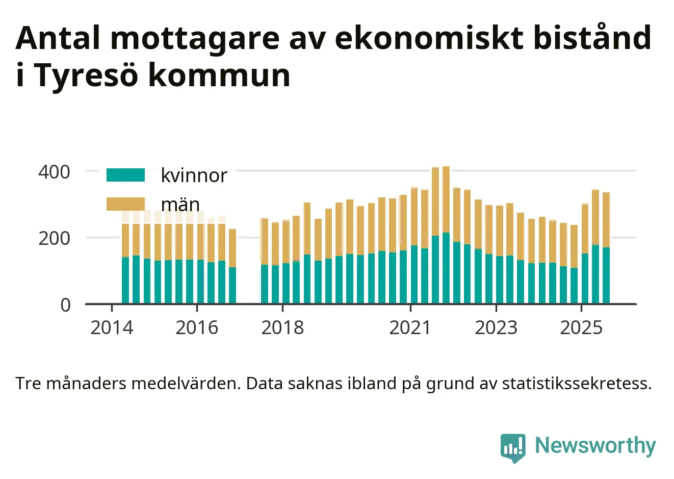 Andelen invånare med ekonomiskt bistånd i Tyresö kommun var högre under sommaren jämfört med motsvarande period året innan. Det visar den senaste, preliminära statistiken från Socialstyrelsen.