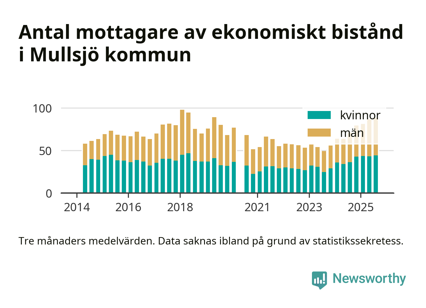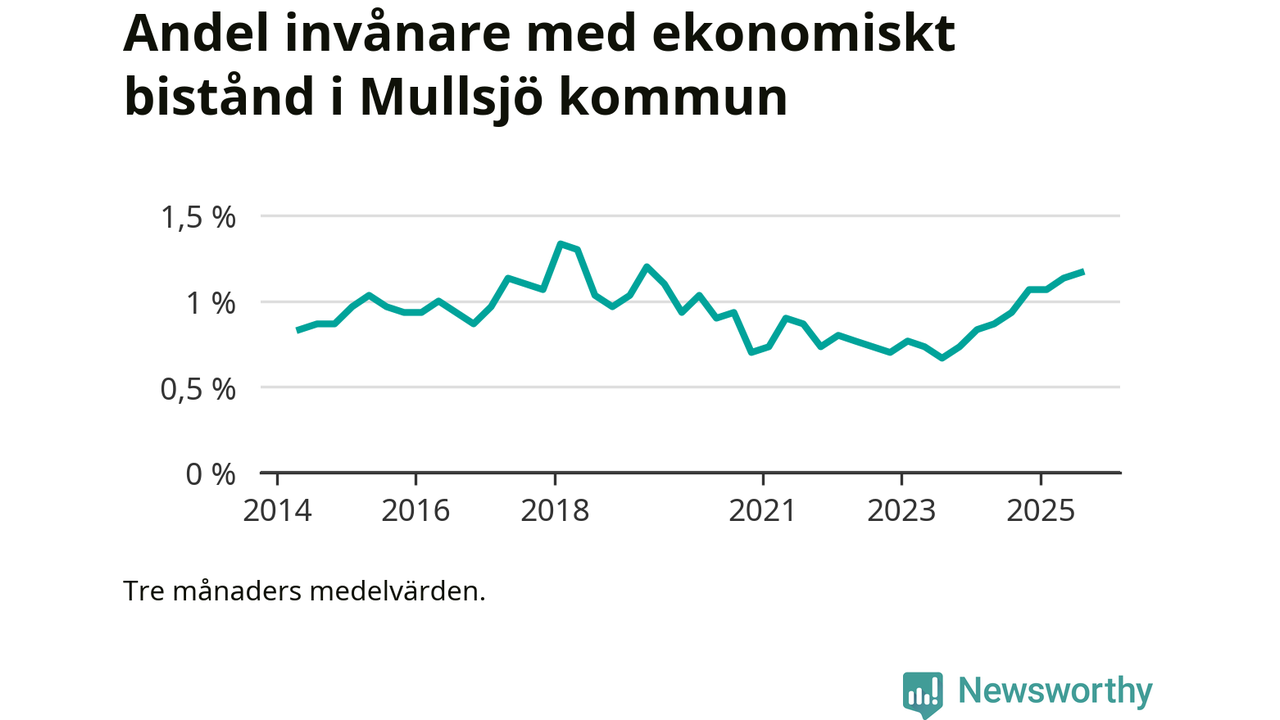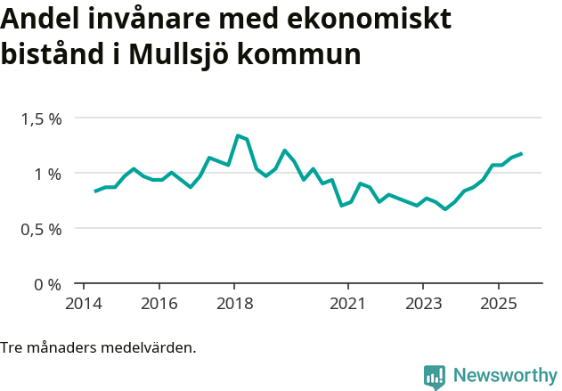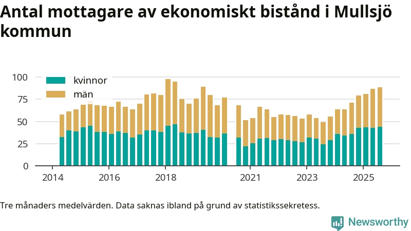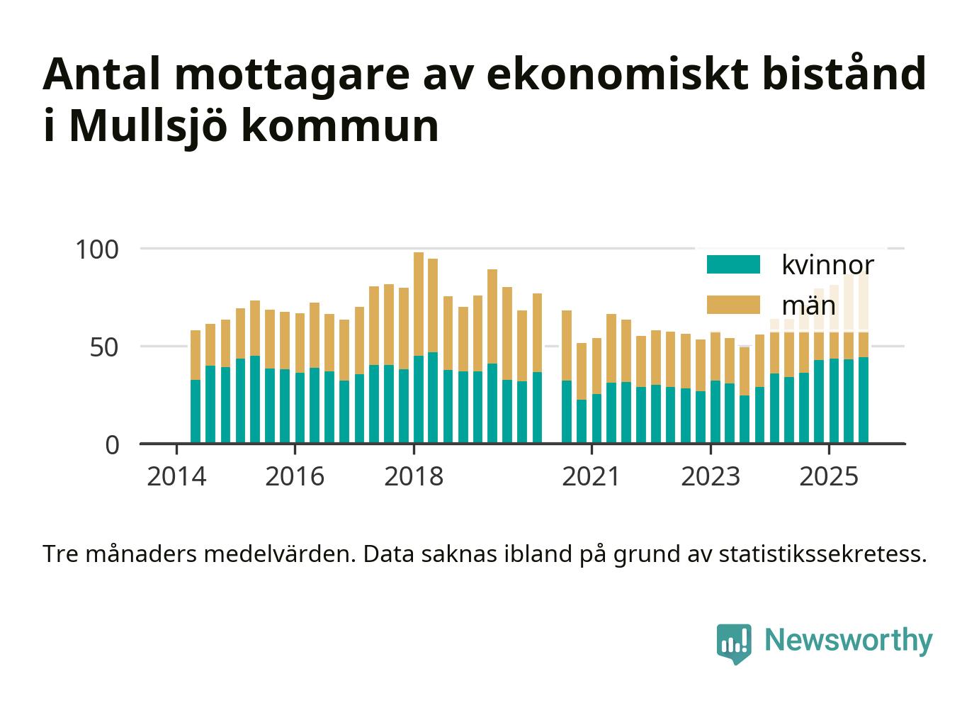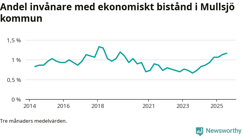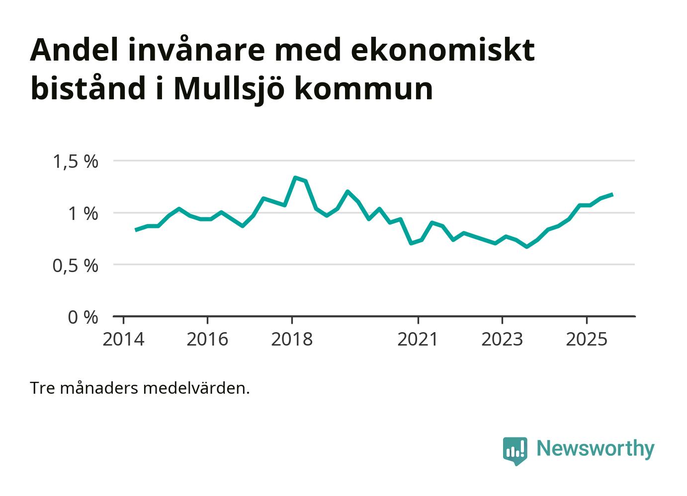 I genomsnitt 88 personer per månad fick ekonomiskt bistånd i Mullsjö kommun under sommarmånaderna (juni till augusti), vilket motsvarar 1,2 procent av den vuxna befolkningen. Det är marginellt mer än i våras, och något större andel än under sommaren för ett år sedan.
