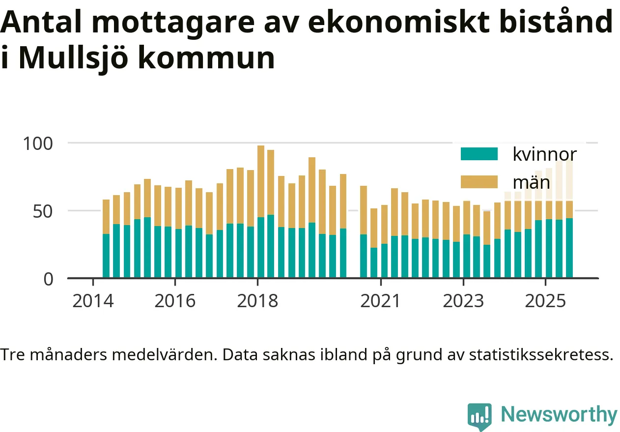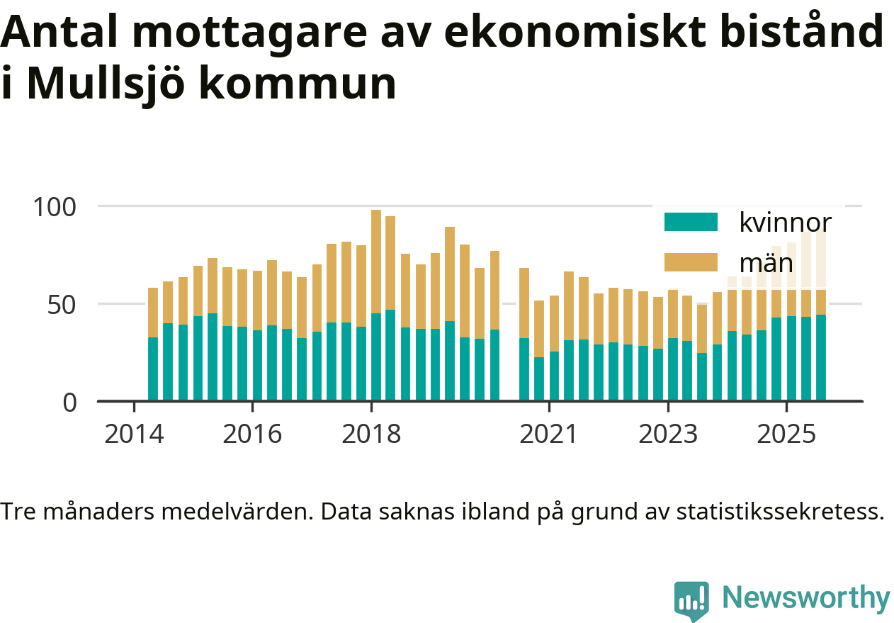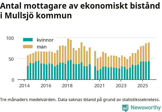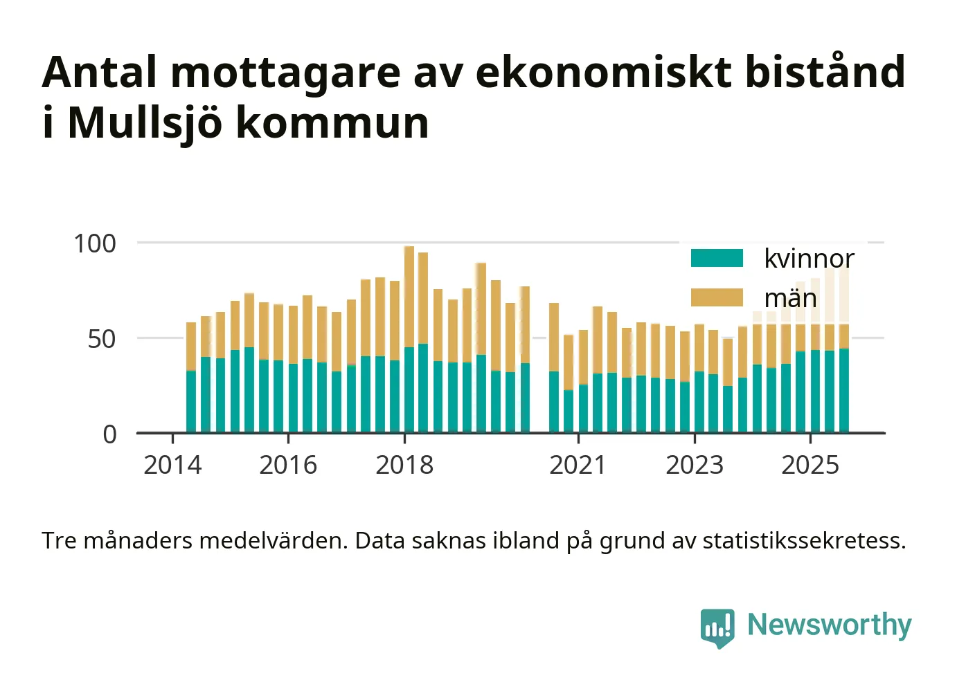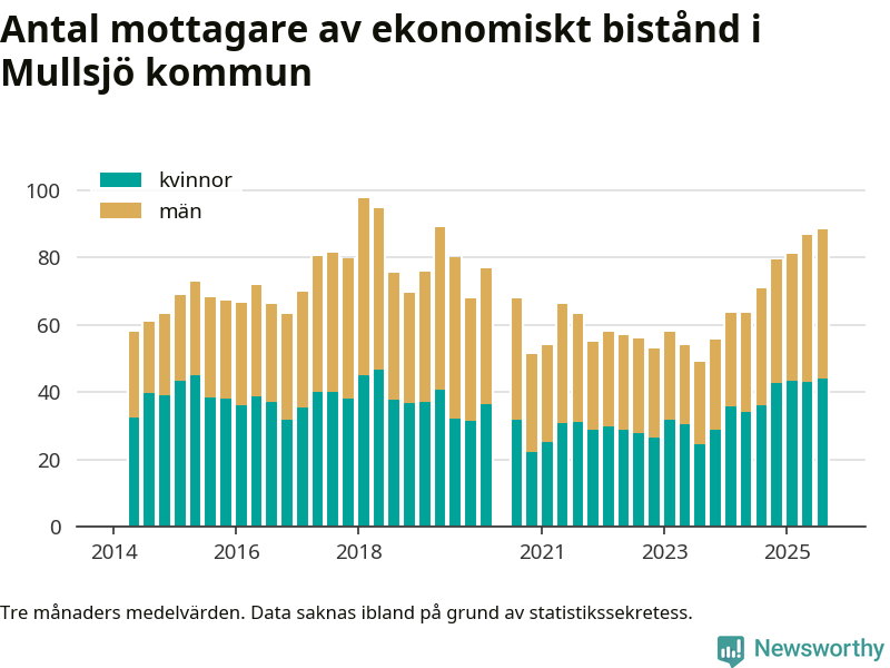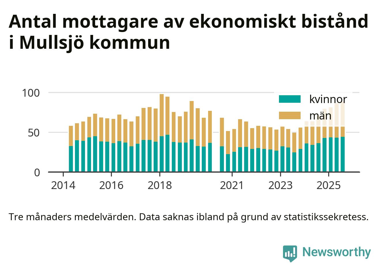 I genomsnitt 88 personer per månad fick ekonomiskt bistånd i Mullsjö kommun under sommarmånaderna (juni till augusti), vilket motsvarar 1,2 procent av den vuxna befolkningen. Det är marginellt mer än i våras, och något större andel än under sommaren för ett år sedan.