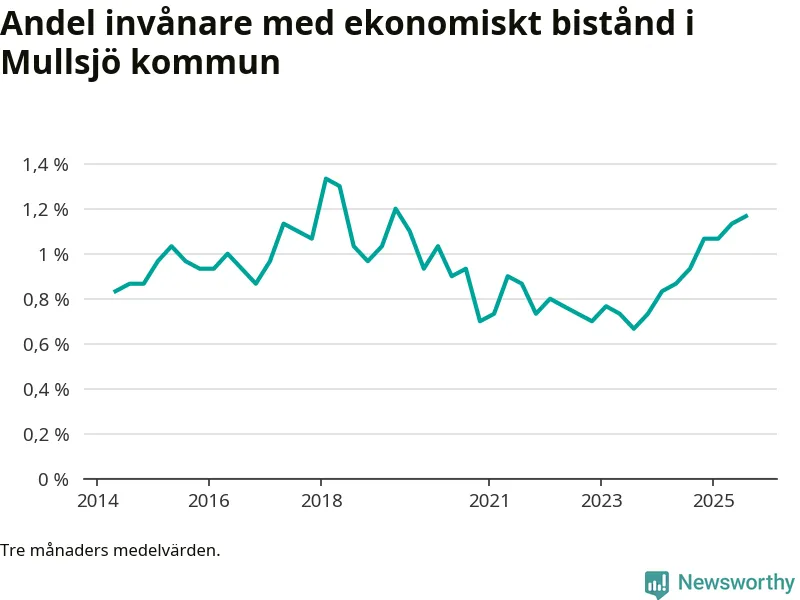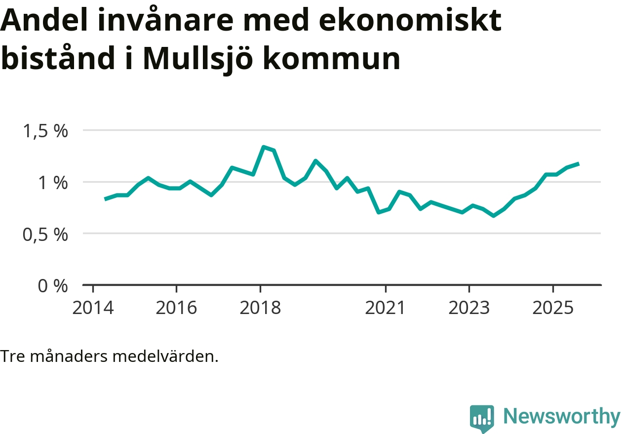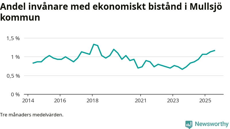Den högsta andelen biståndstagare under det senaste decenniet hade kommunen under vintern 2018 (1,3 procent), och den lägsta andelen under sommaren 2023 (0,7 procent).