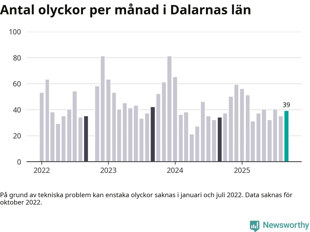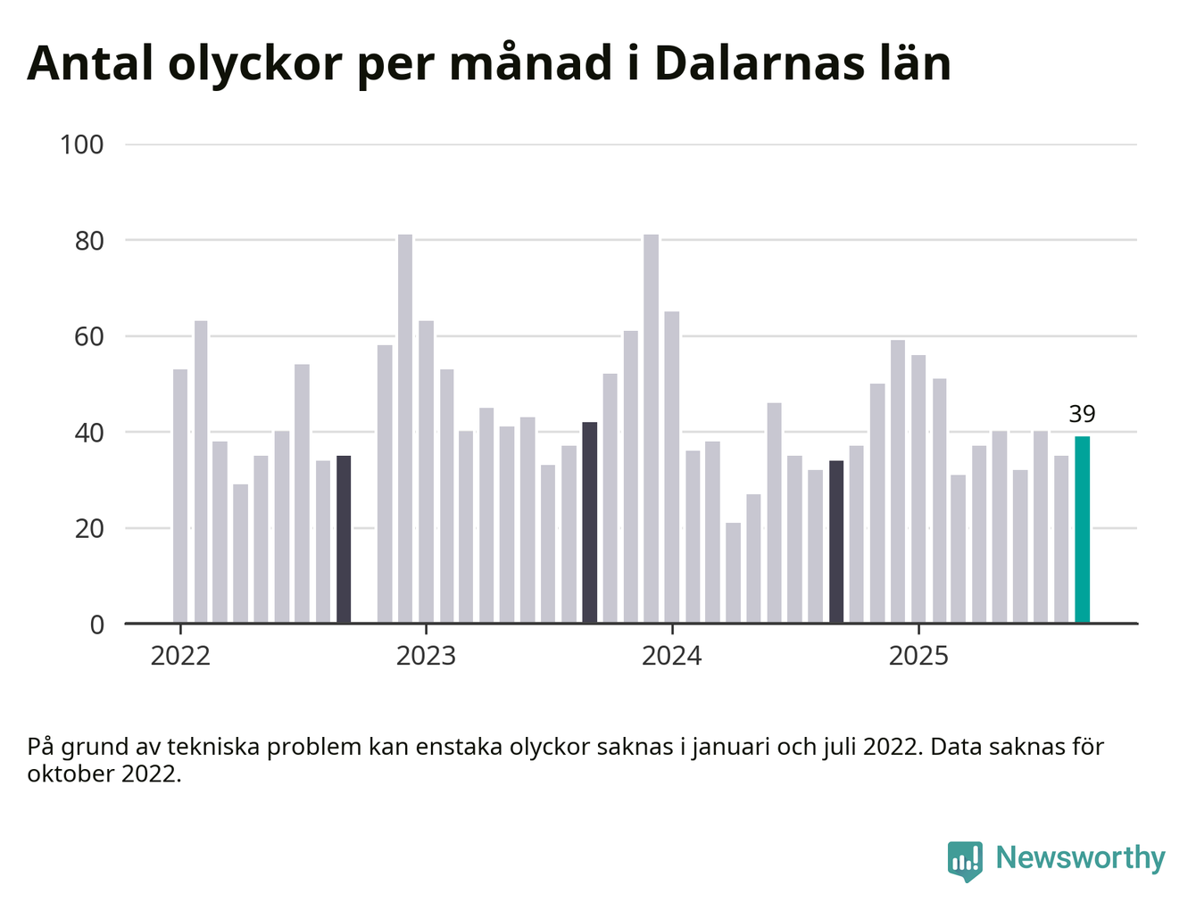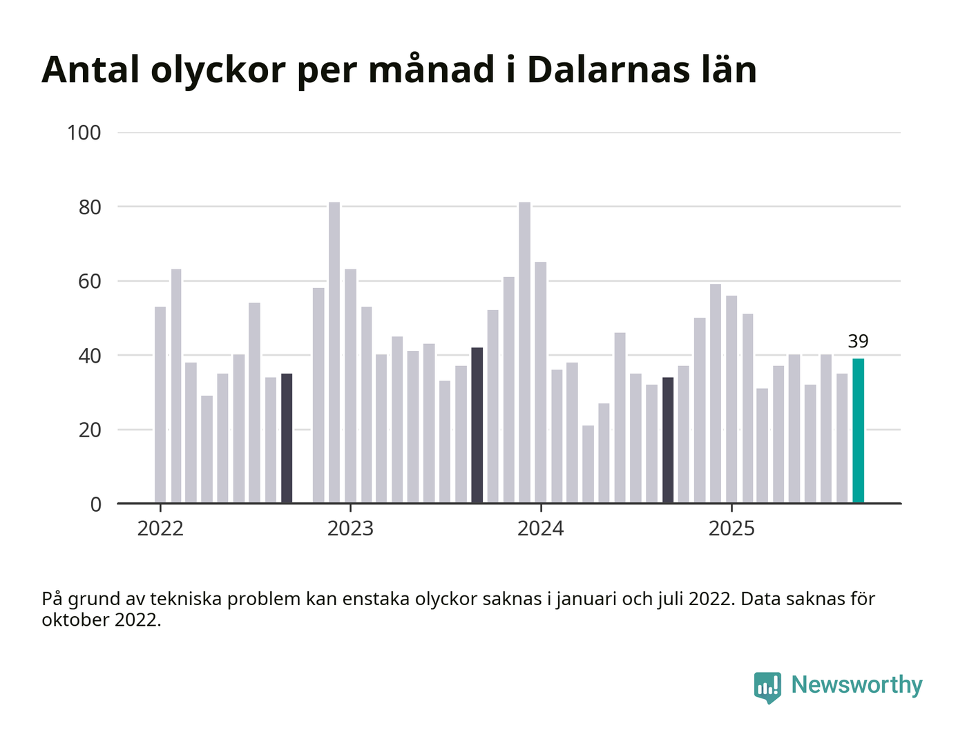 I Dalarnas län var trafikolyckorna färre än genomsnittligt i september: 39 olyckor längs de stora vägarna i länet. Det visar data från Trafikverket som Newsworthy sammanställt.