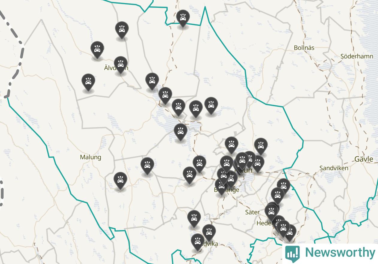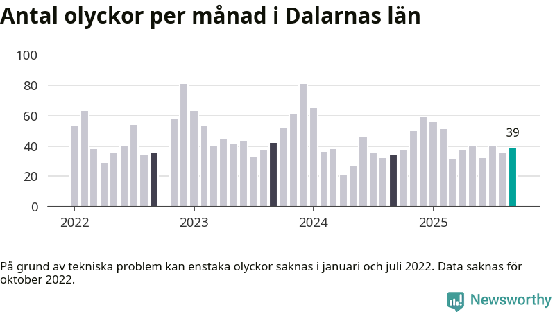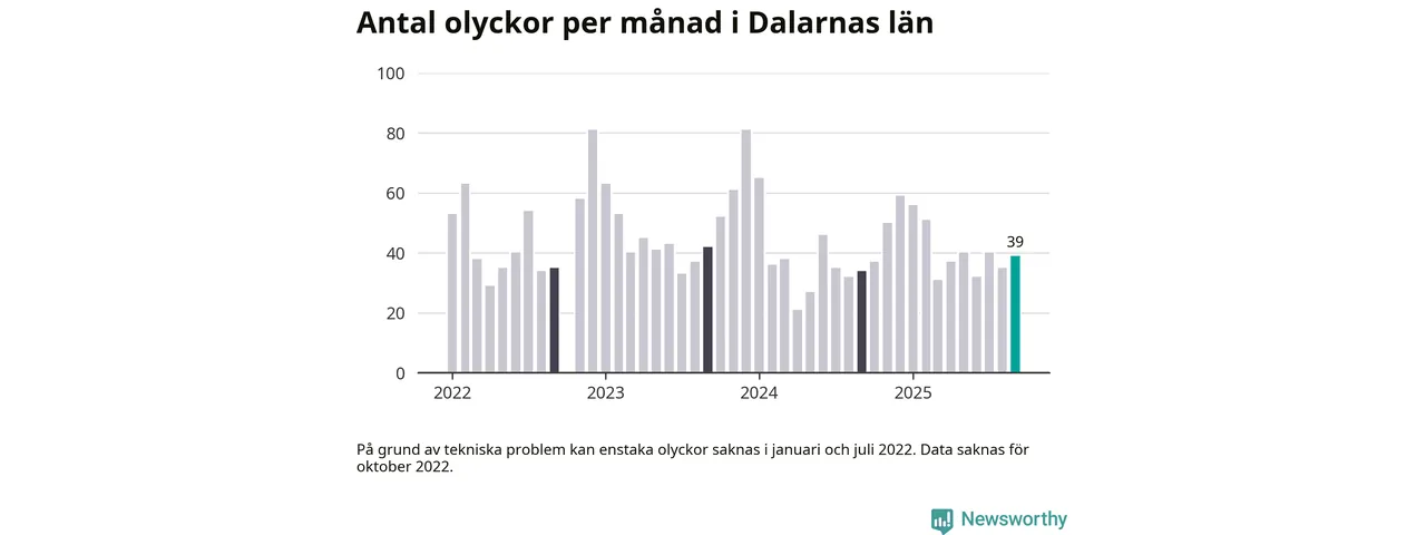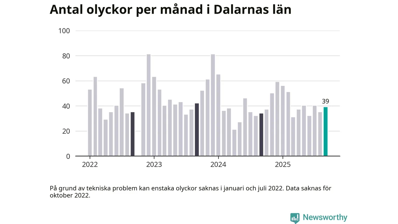 I Dalarnas län var trafikolyckorna färre än genomsnittligt i september: 39 olyckor längs de stora vägarna i länet. Det visar data från Trafikverket som Newsworthy sammanställt.