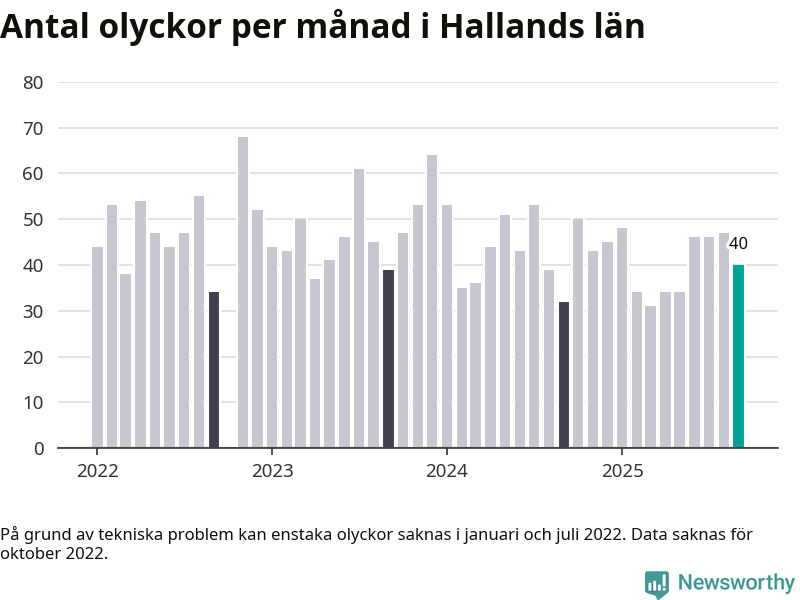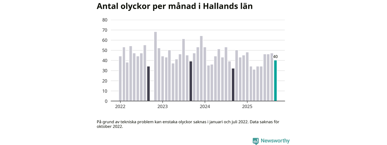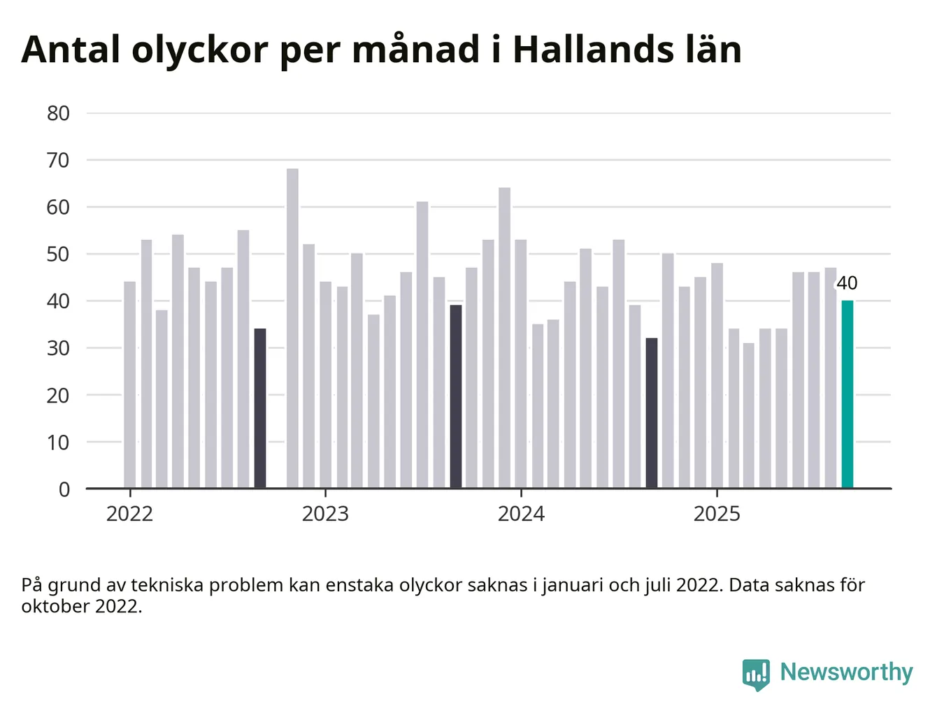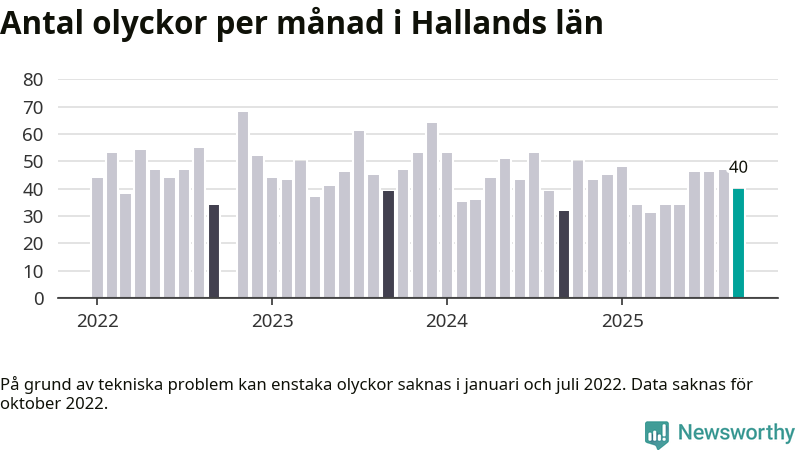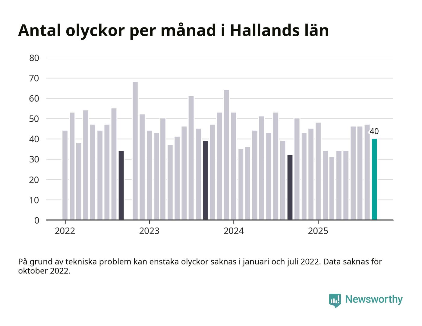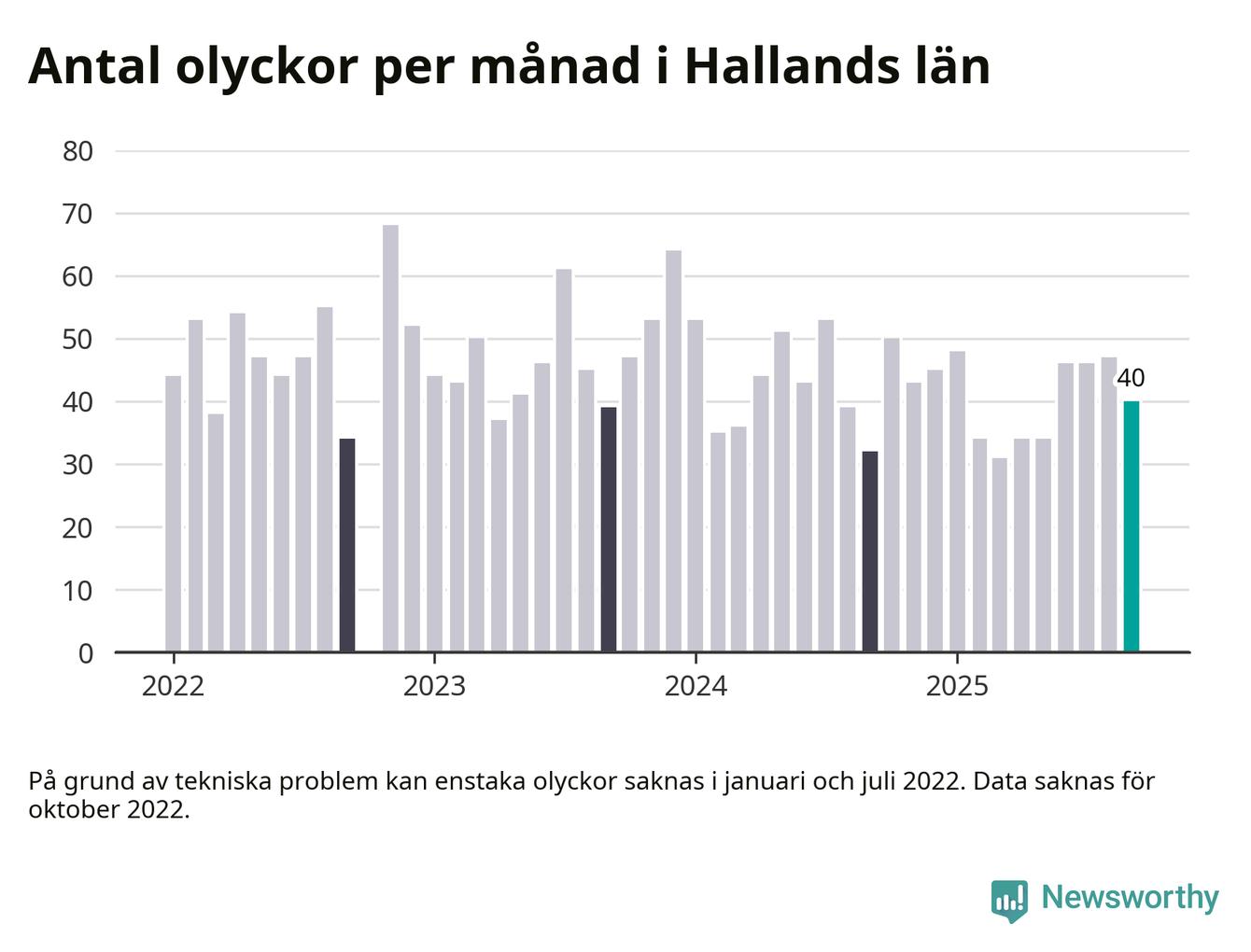 I Hallands län var trafikolyckorna fler än under samma månad i fjol: 40 olyckor längs de stora vägarna i länet. Det visar data från Trafikverket som Newsworthy sammanställt.