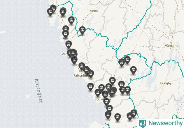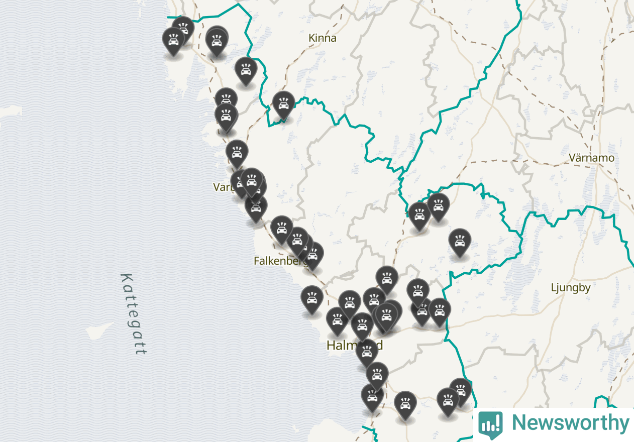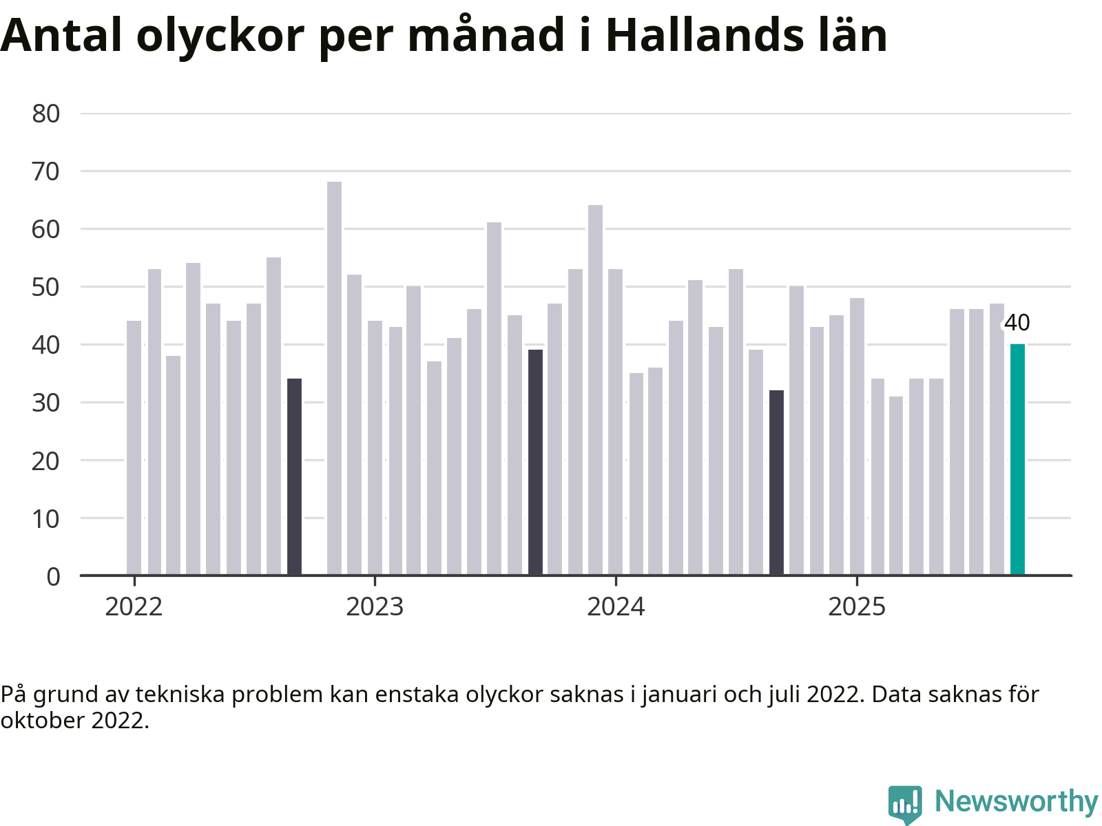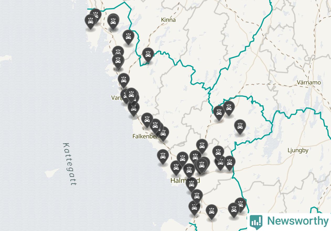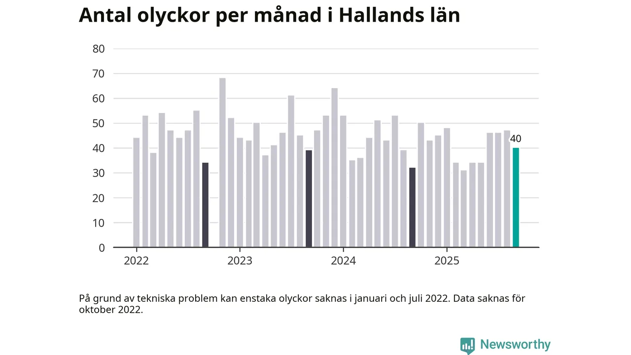 I Hallands län var trafikolyckorna fler än under samma månad i fjol: 40 olyckor längs de stora vägarna i länet. Det visar data från Trafikverket som Newsworthy sammanställt.