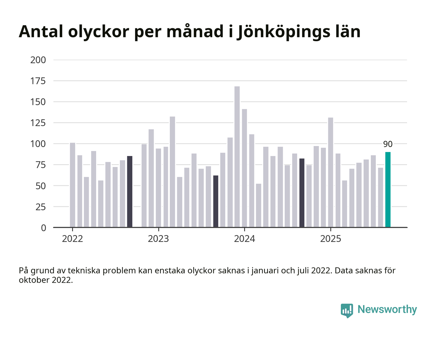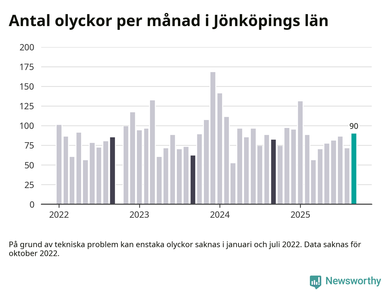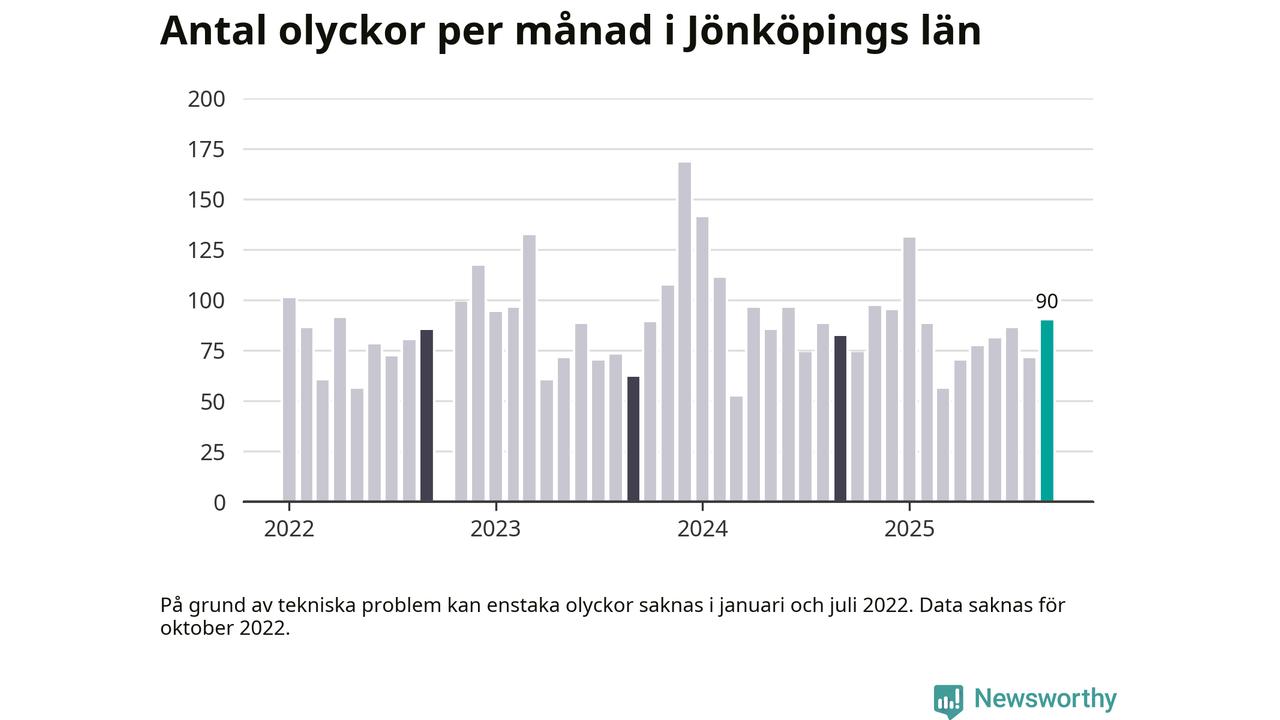 Under september 2025 rapporterades 90 trafikolyckor längs eller i anslutning till de stora, statliga vägarna i Jönköpings län. Nerbrutet per kommun rapporterades flest olyckor, 14 stycken, längs E4 genom Jönköpings kommun. Det är samma mönster som under tidigare månader de senaste åren.