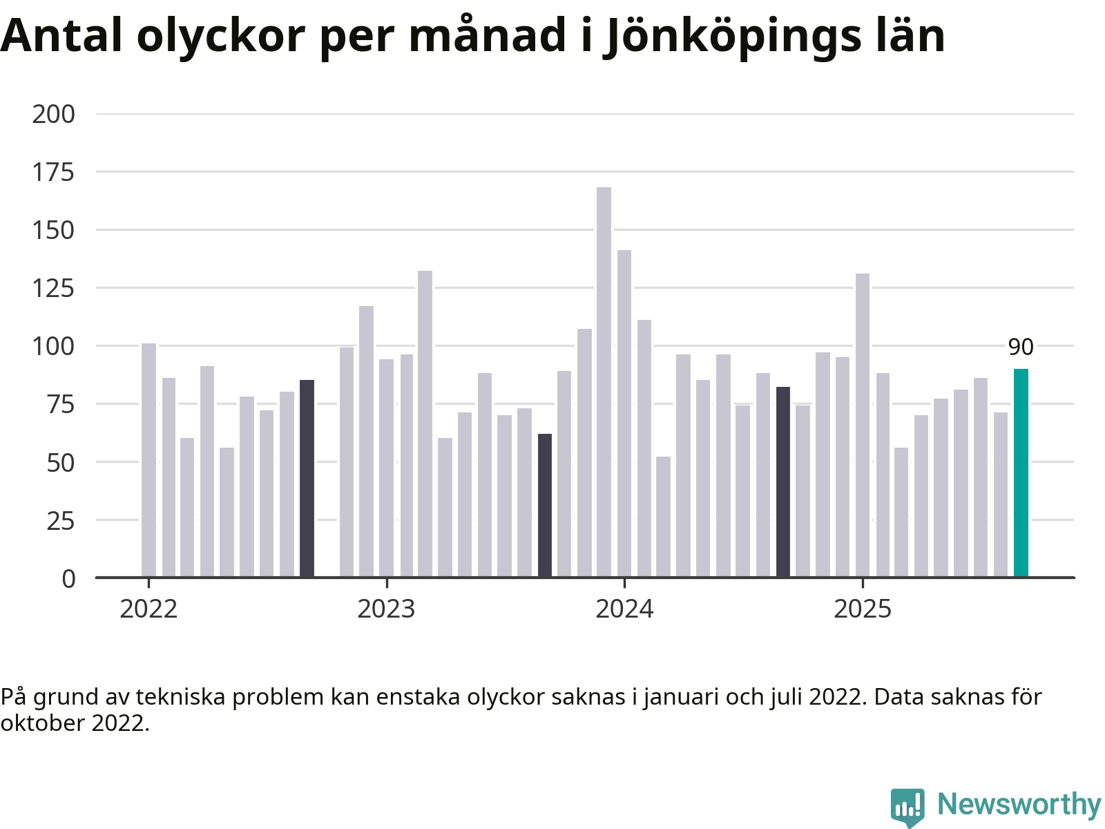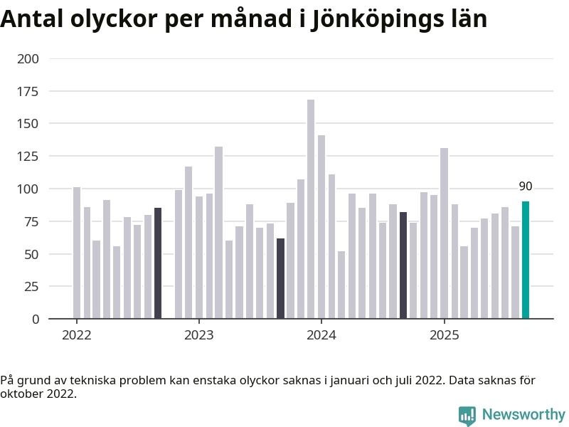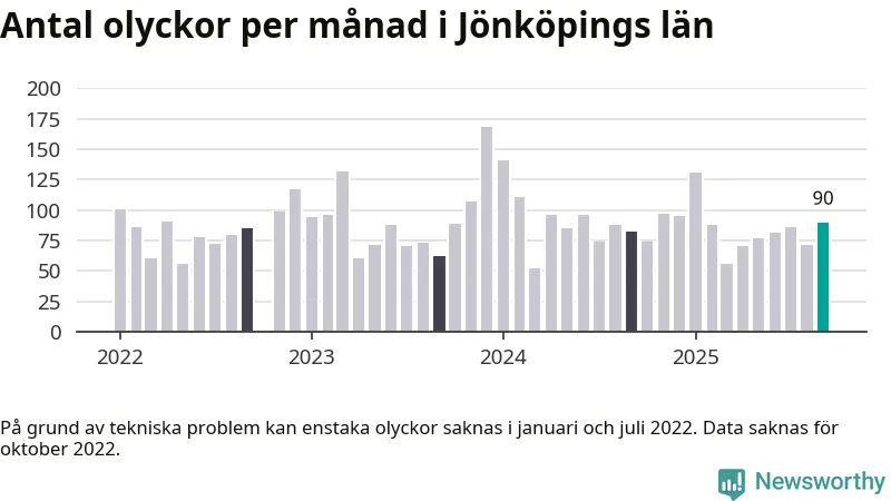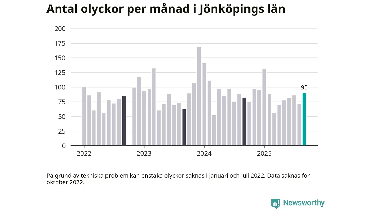 Under september 2025 rapporterades 90 trafikolyckor längs eller i anslutning till de stora, statliga vägarna i Jönköpings län. Nerbrutet per kommun rapporterades flest olyckor, 14 stycken, längs E4 genom Jönköpings kommun. Det är samma mönster som under tidigare månader de senaste åren.