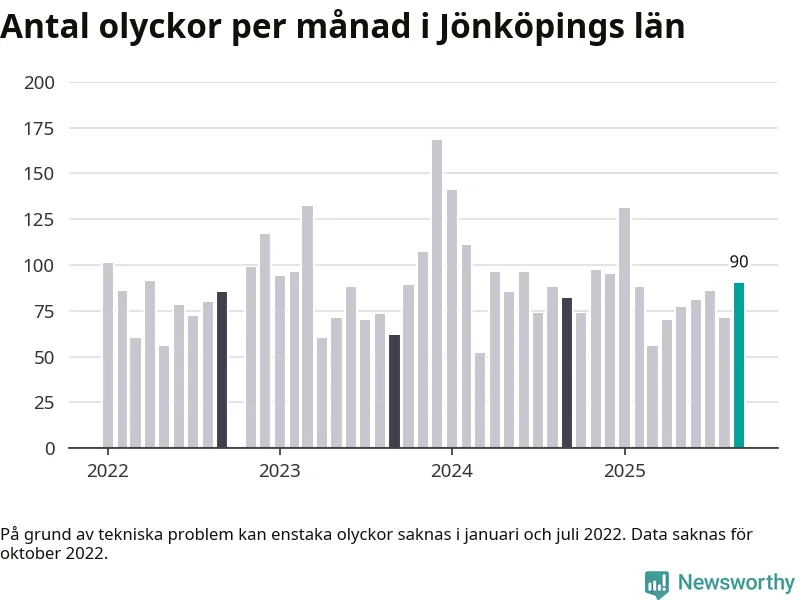 De senaste årens mest olycksdrabbade månad var december för två år sedan, med 168 olyckor. I genomsnitt rapporteras omkring 91 olyckor per månad i länet, sedan början av 2022.