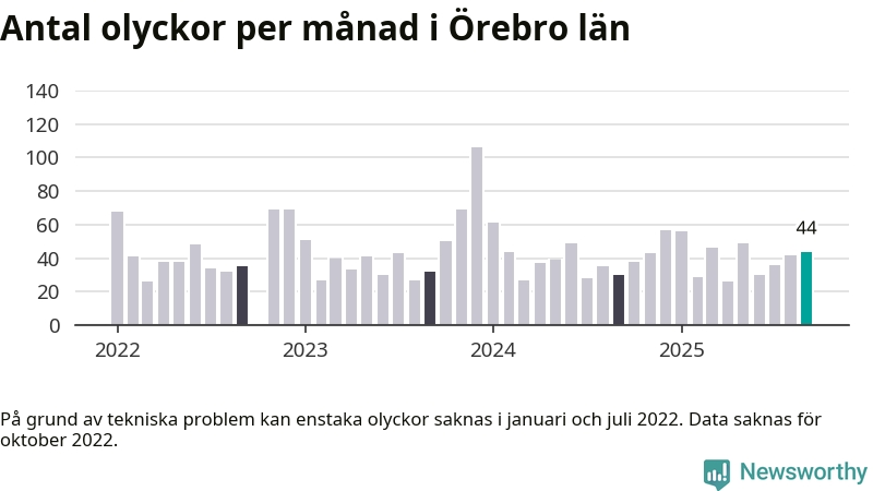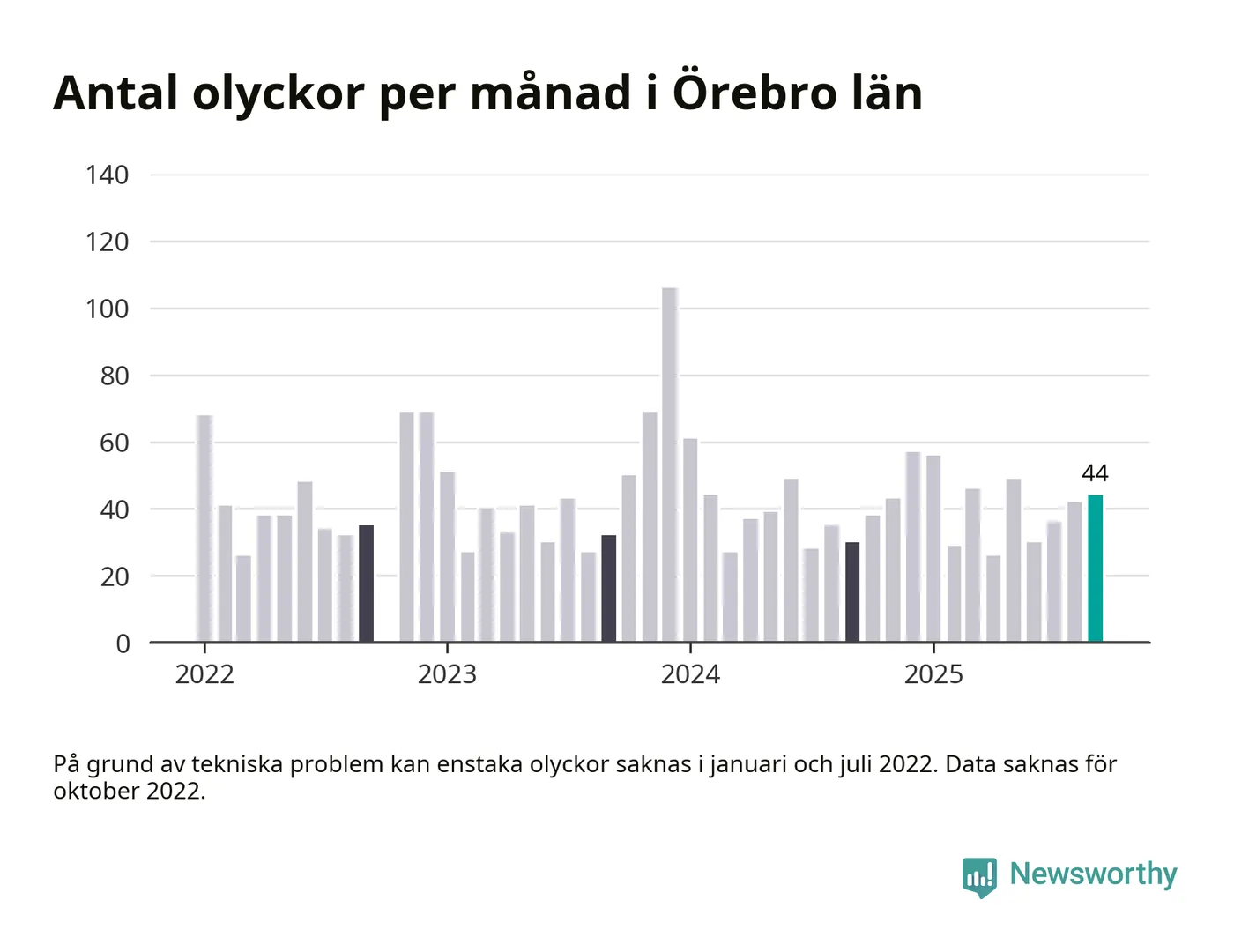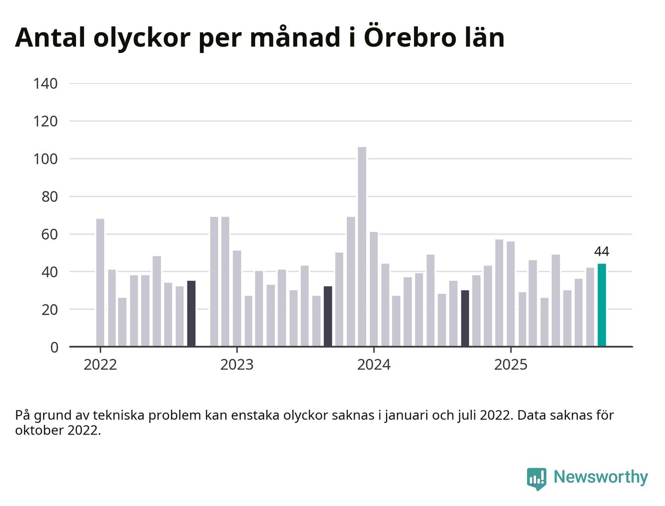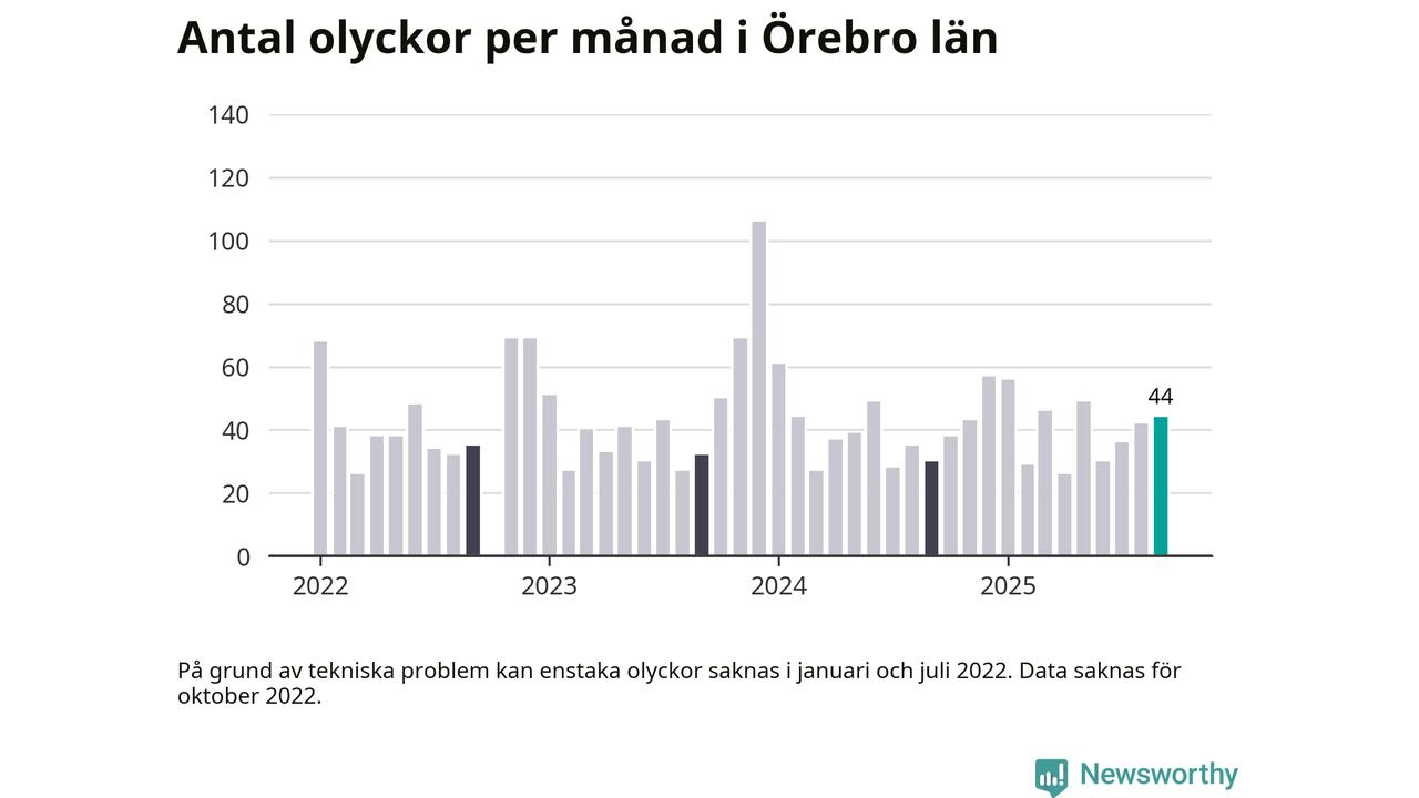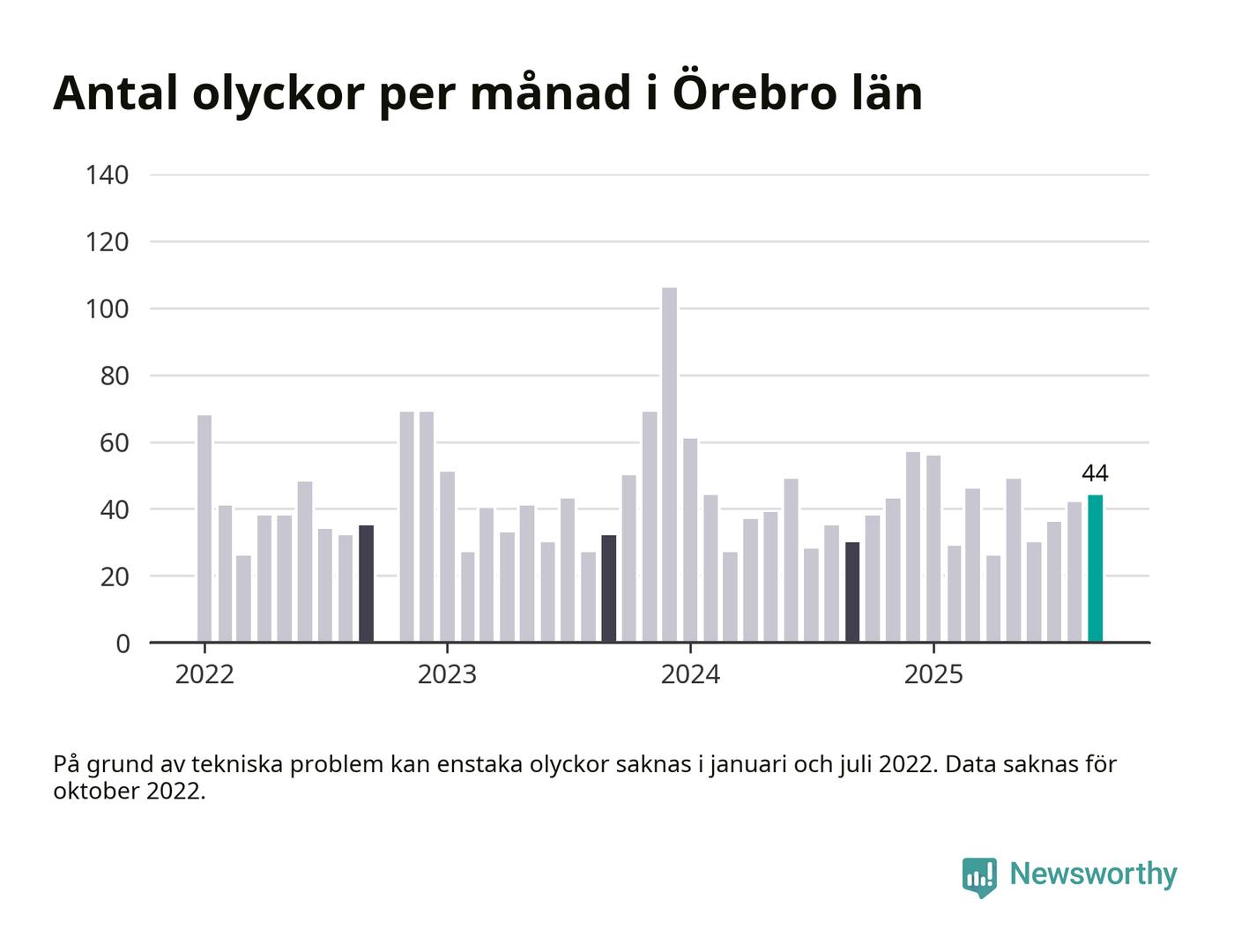 I Örebro län var trafikolyckorna fler än under samma månad i fjol: 44 olyckor längs de stora vägarna i länet. Det visar data från Trafikverket som Newsworthy sammanställt.