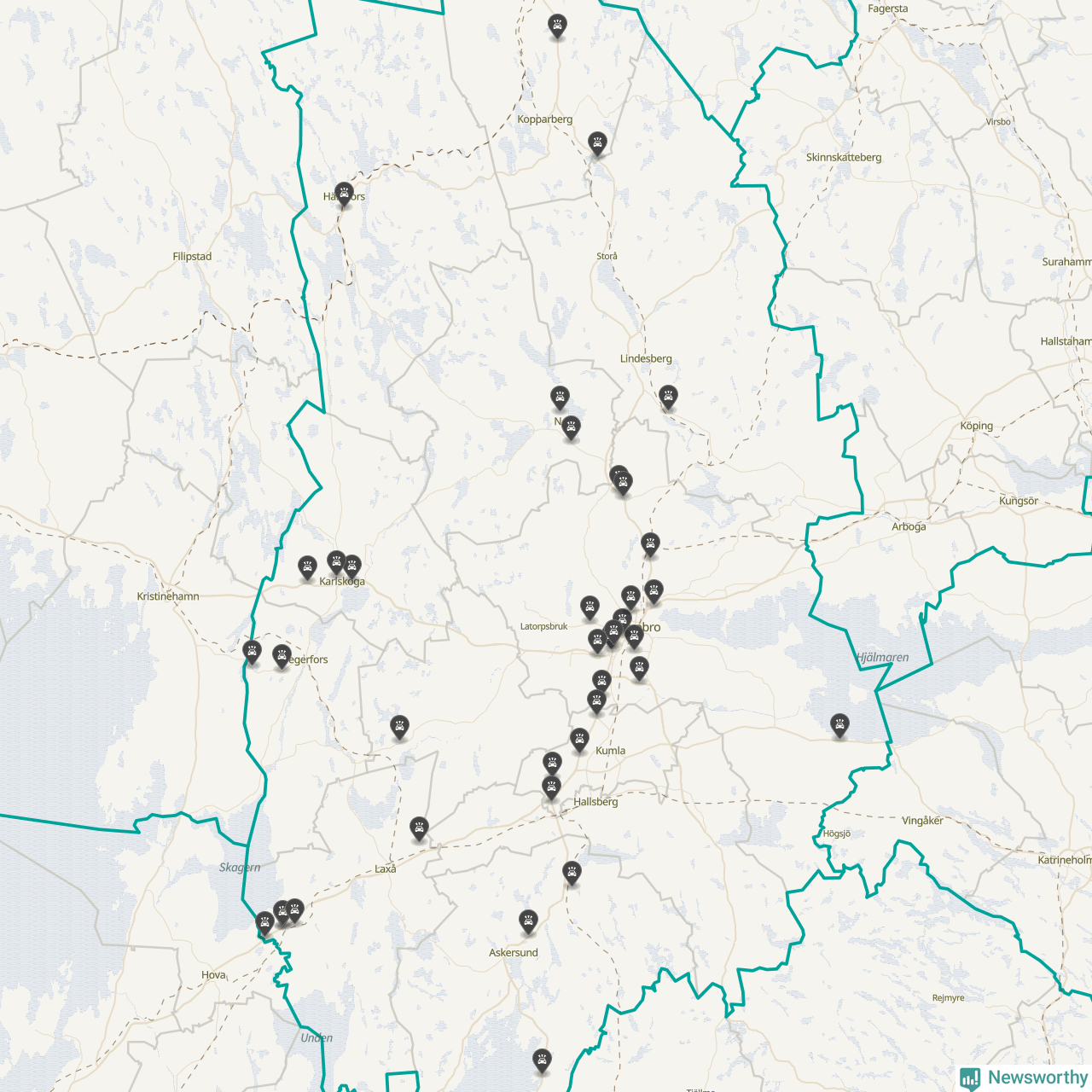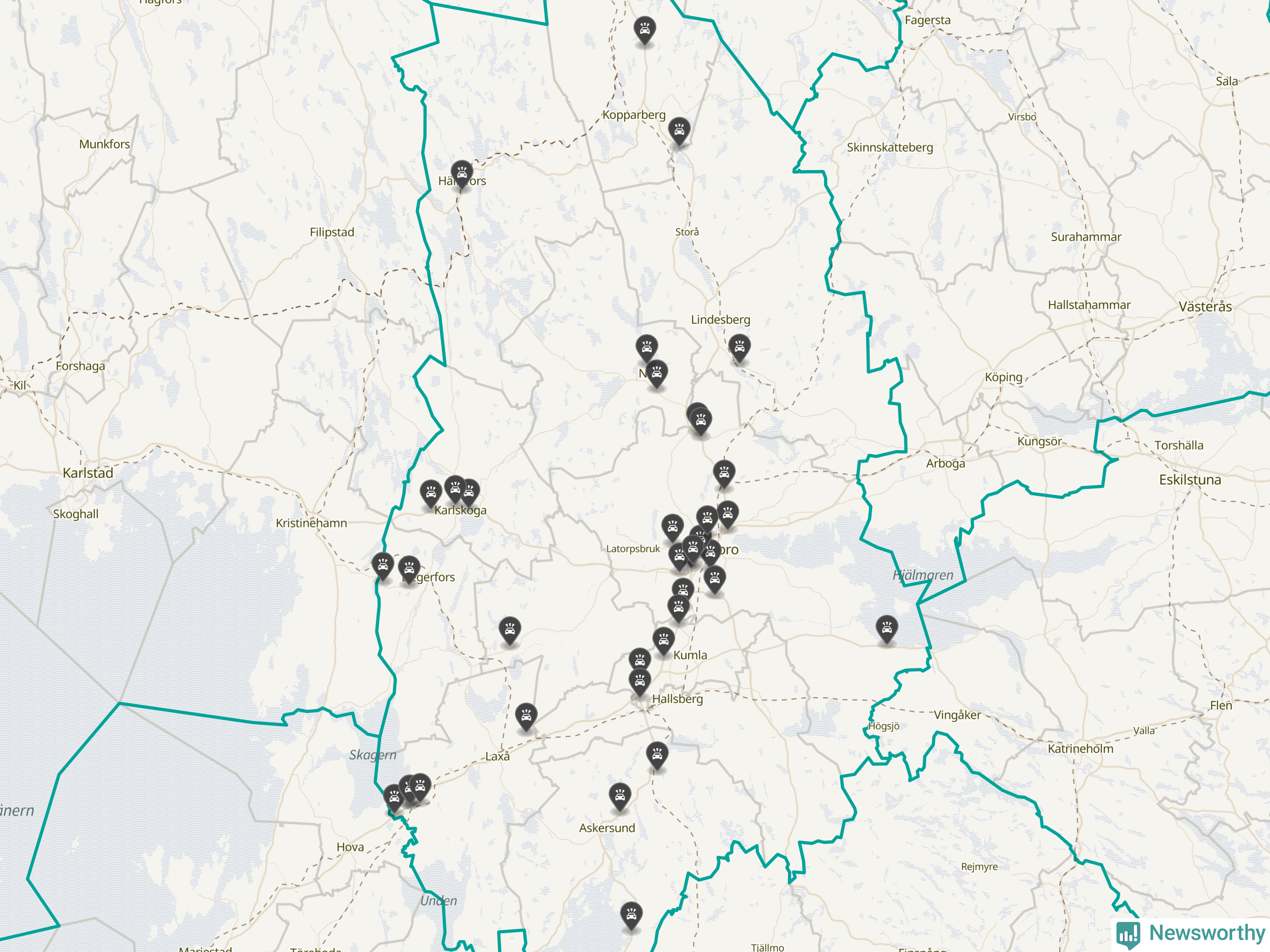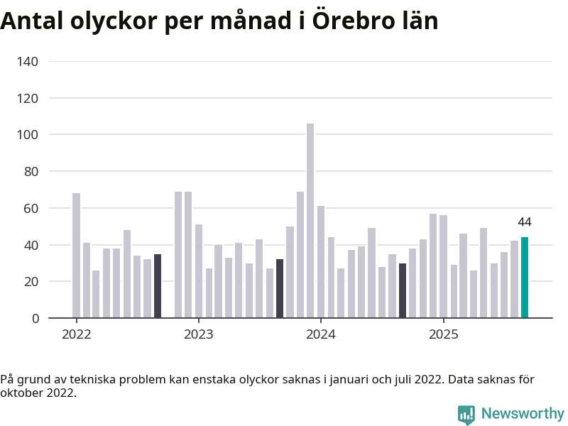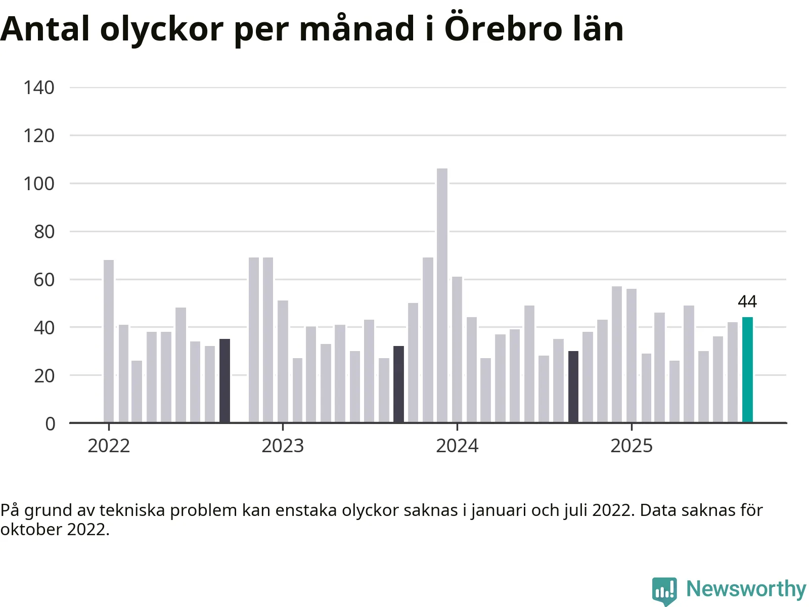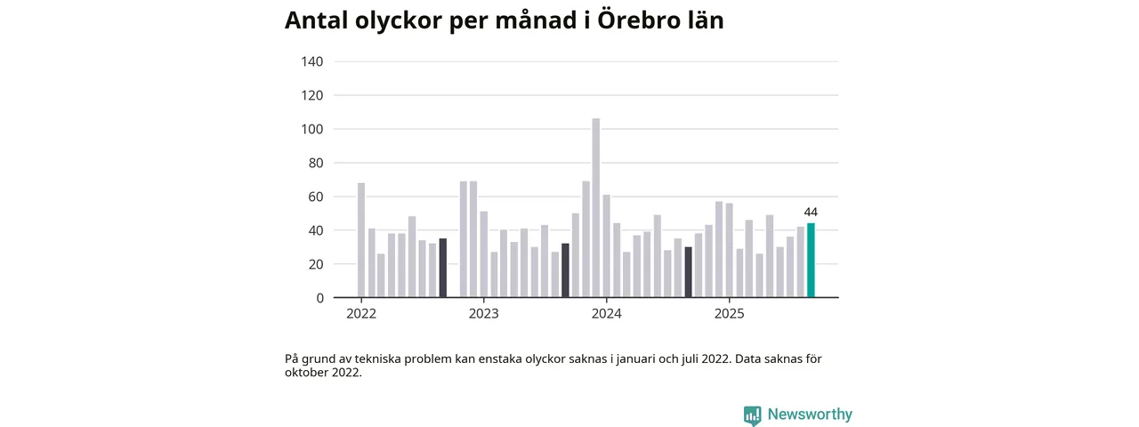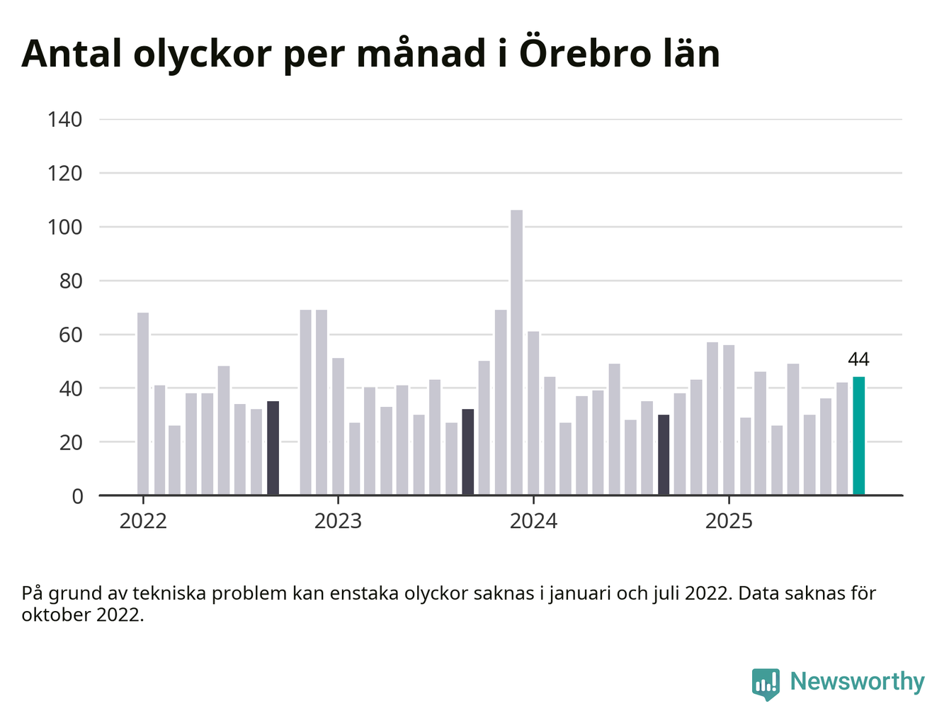 I Örebro län var trafikolyckorna fler än under samma månad i fjol: 44 olyckor längs de stora vägarna i länet. Det visar data från Trafikverket som Newsworthy sammanställt.