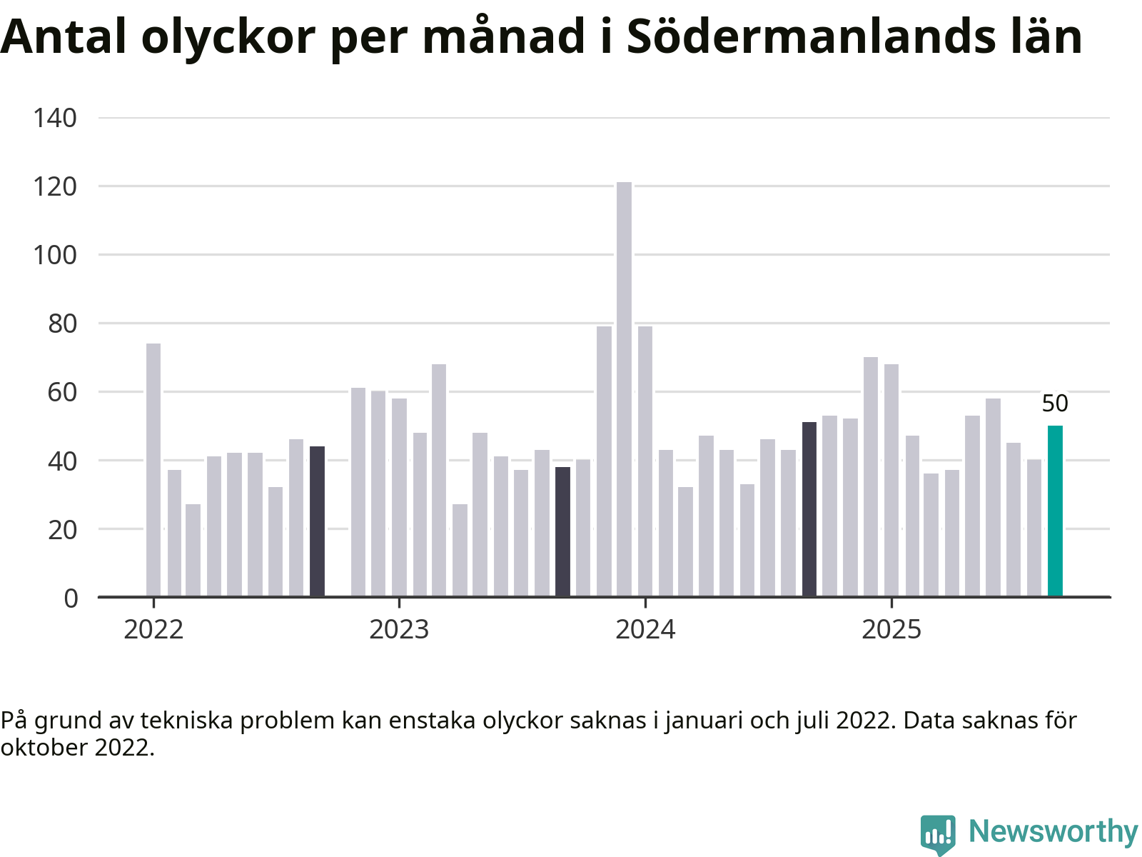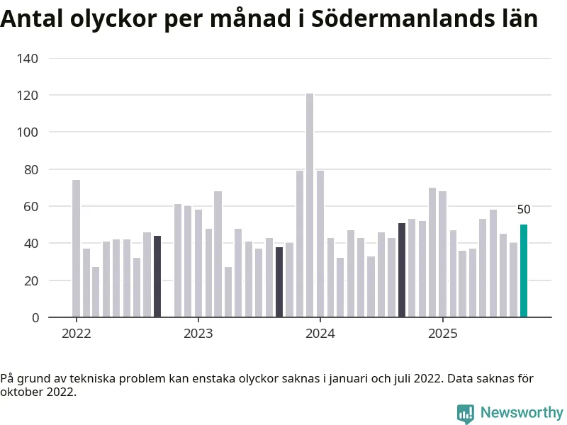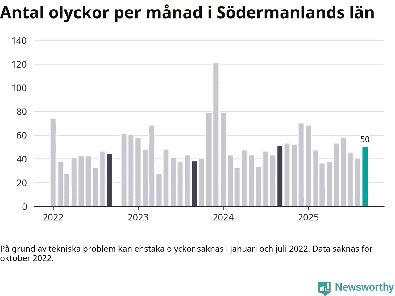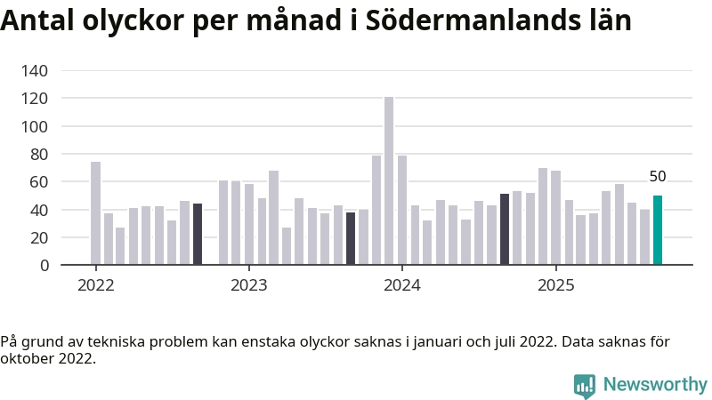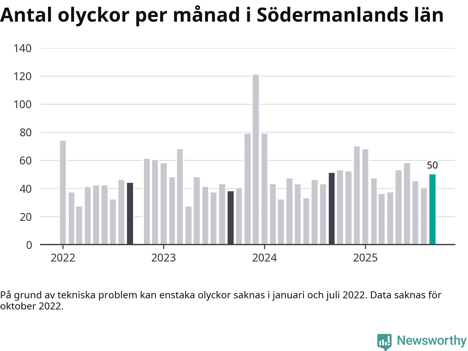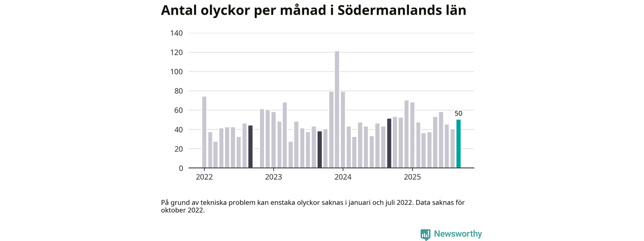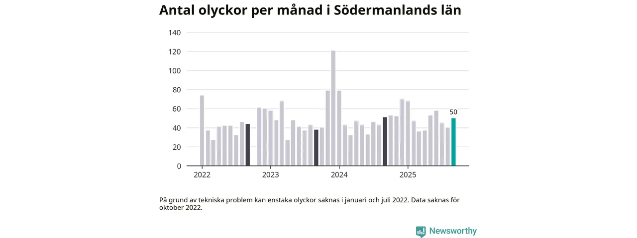 I Södermanlands län rapporterades 50 längs de stora vägarna i länet under september, visar data från Trafikverket som Newsworthy sammanställt.