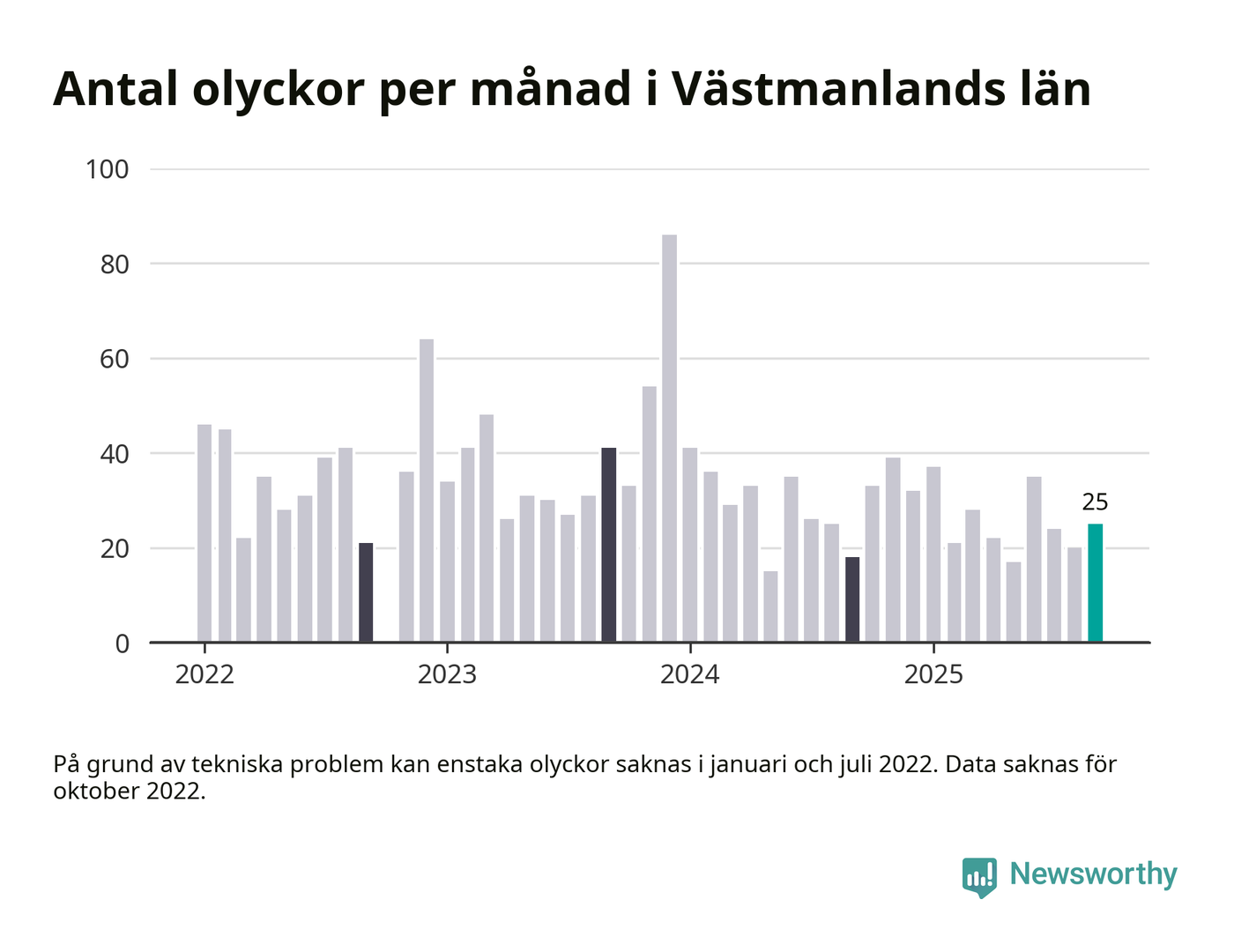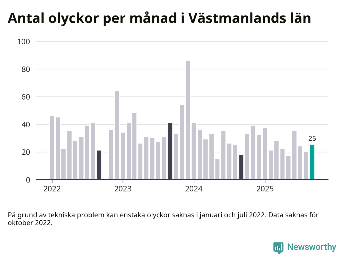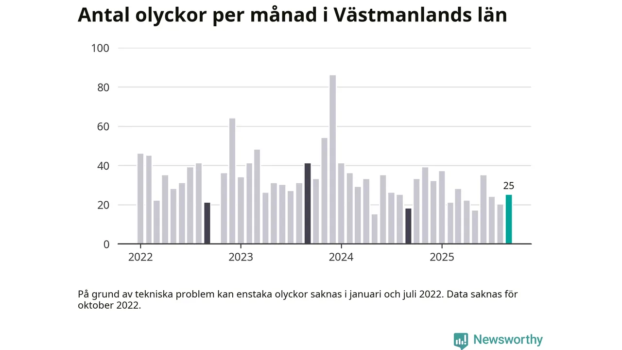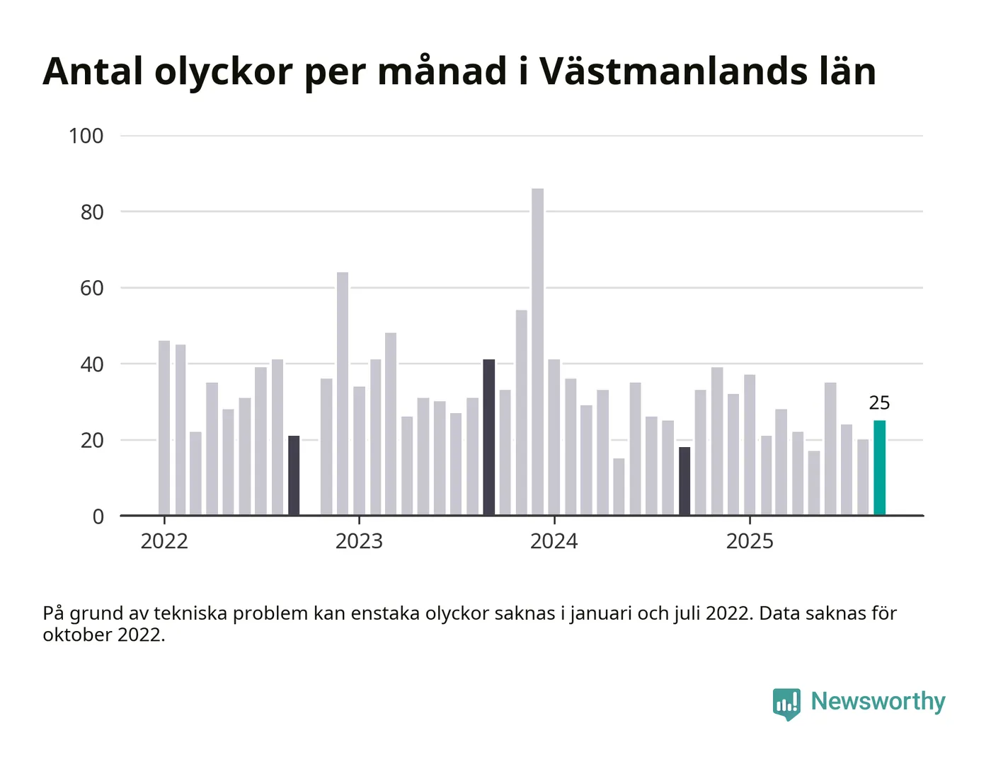 I Västmanlands län var trafikolyckorna färre än genomsnittligt i september: 25 olyckor längs de stora vägarna i länet. Det visar data från Trafikverket som Newsworthy sammanställt.