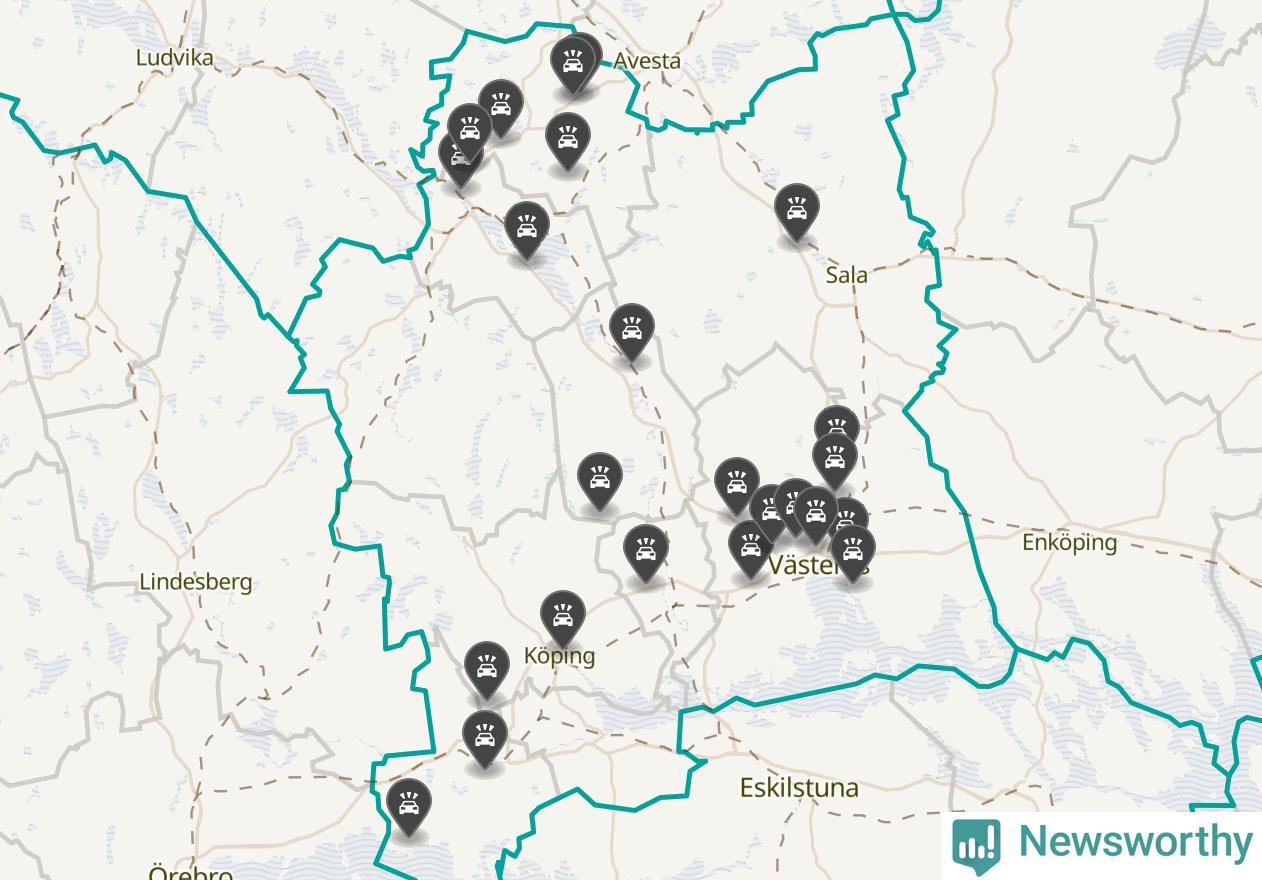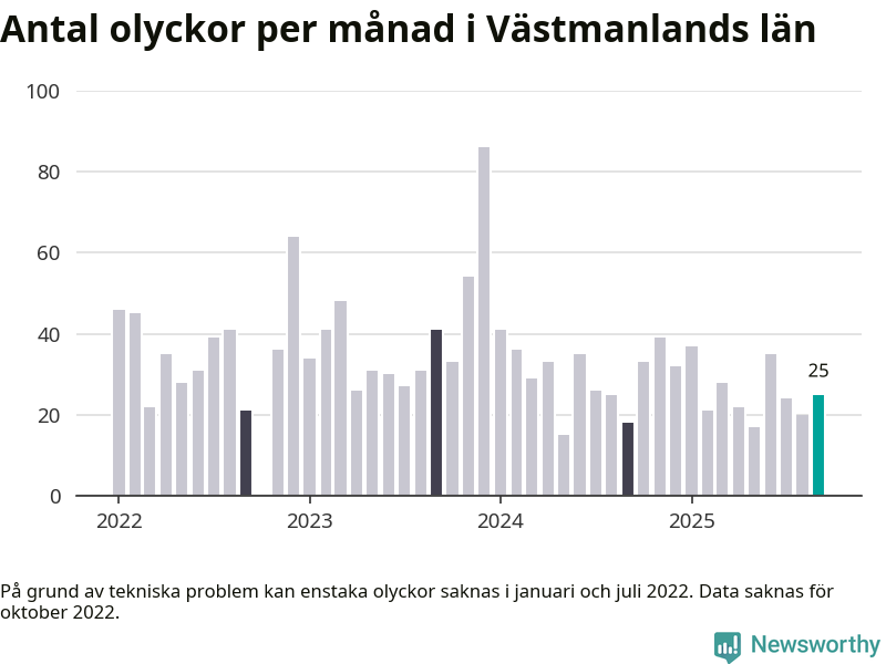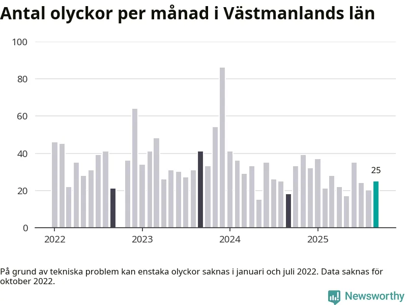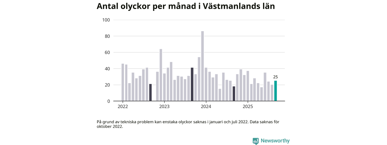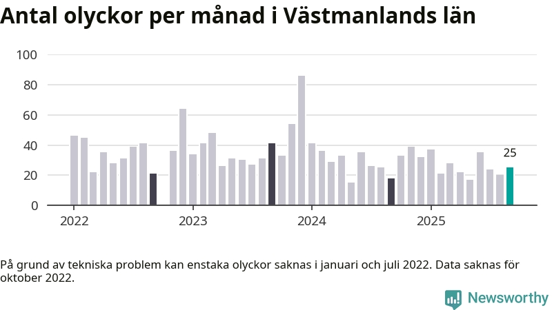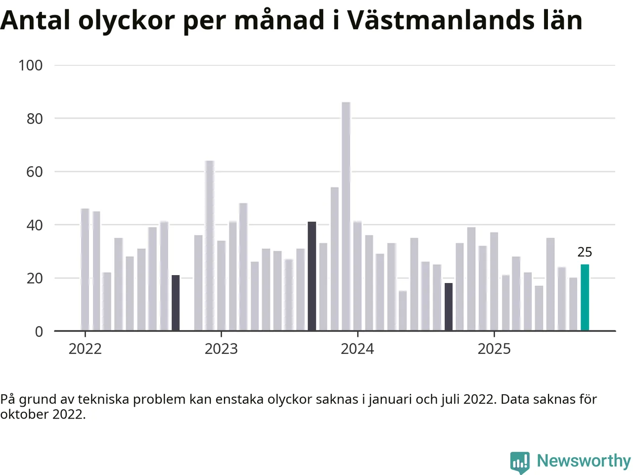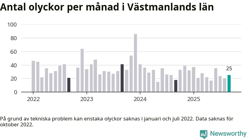 I Västmanlands län var trafikolyckorna färre än genomsnittligt i september: 25 olyckor längs de stora vägarna i länet. Det visar data från Trafikverket som Newsworthy sammanställt.