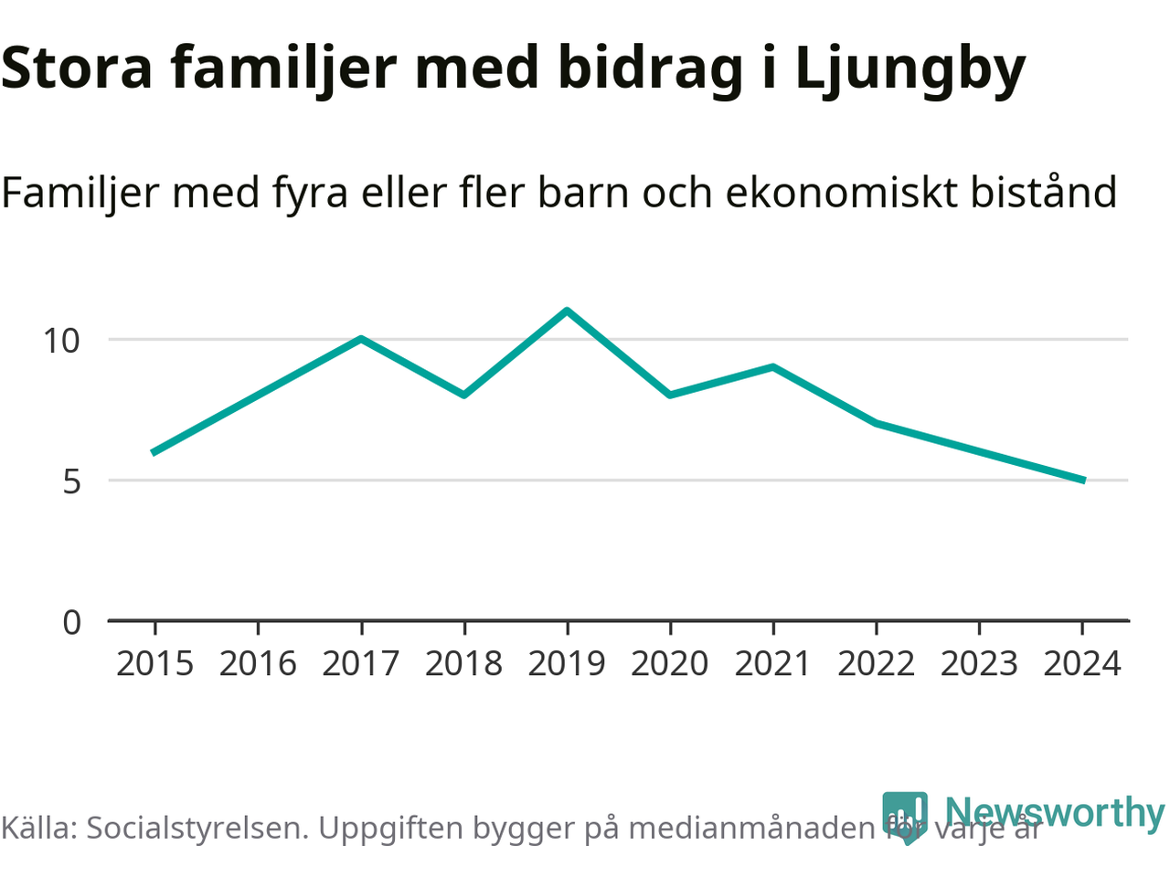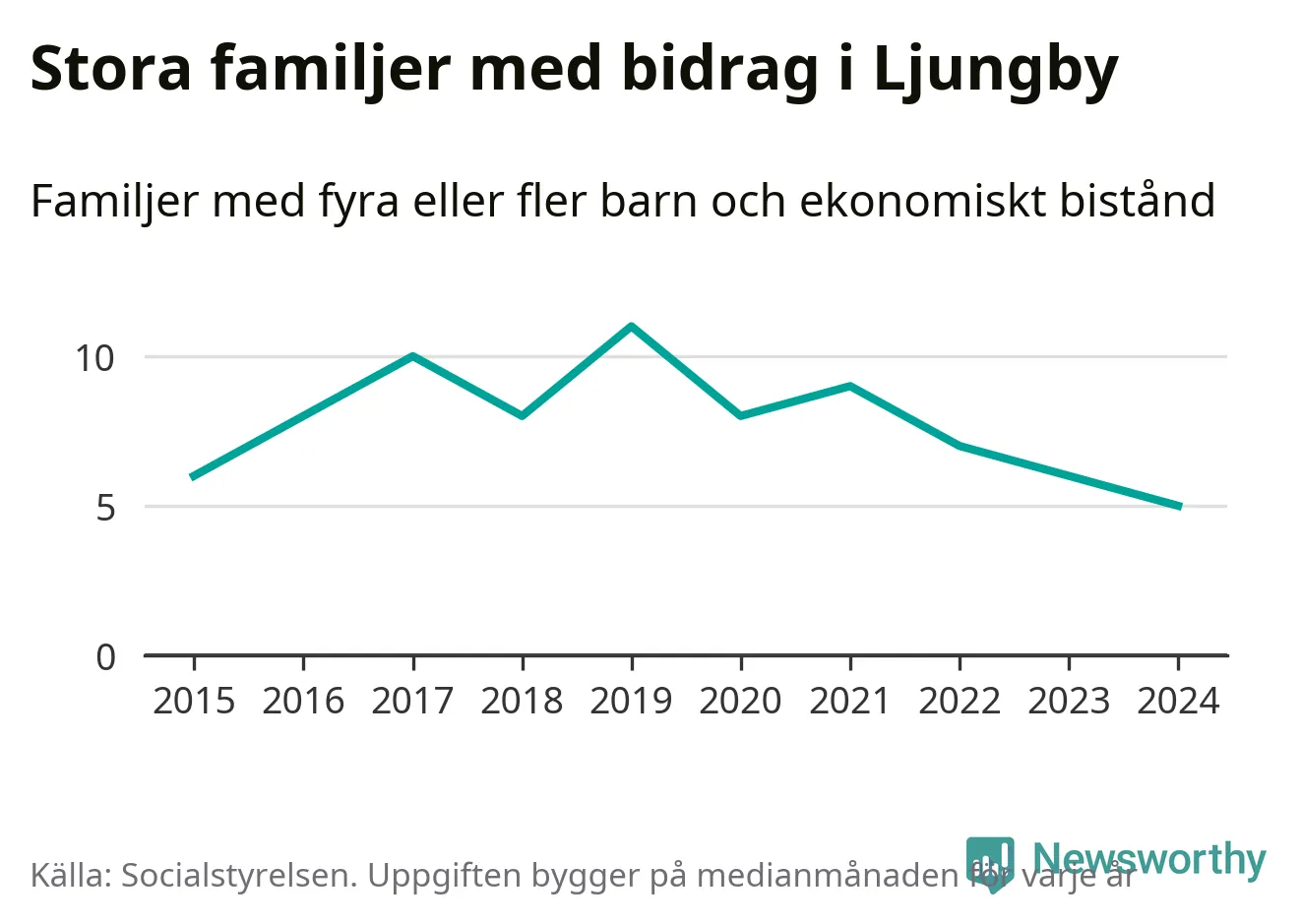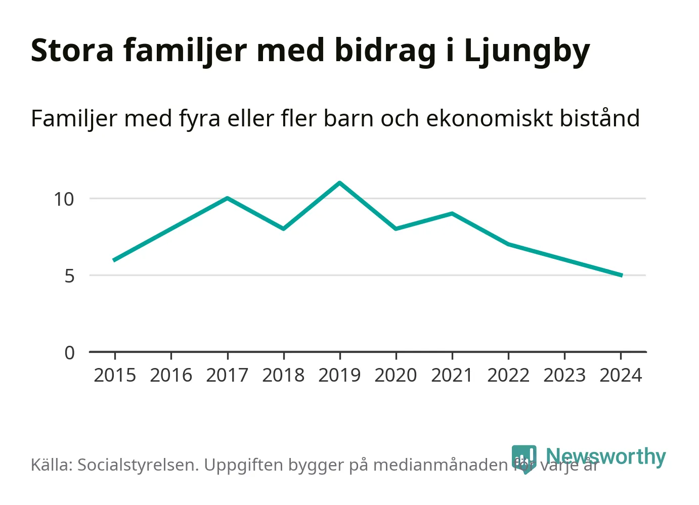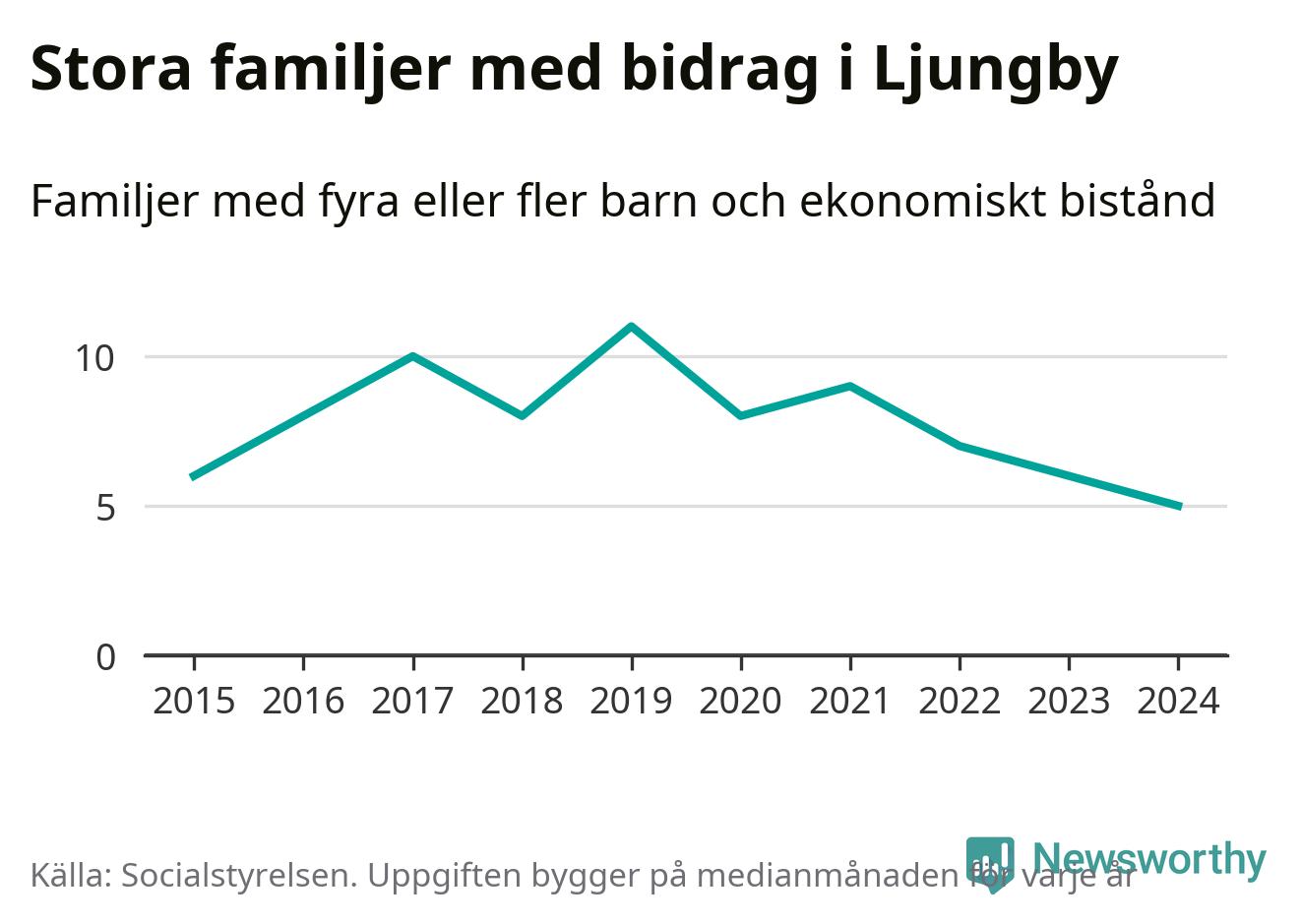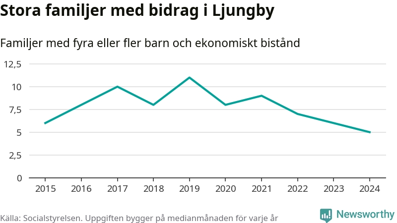 Det är den lägsta medianmånadssiffran i kommunen under de senaste tio åren. Året med högst snitt, 2019, var det elva familjer.