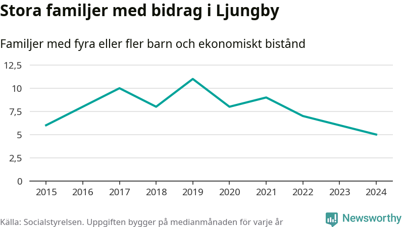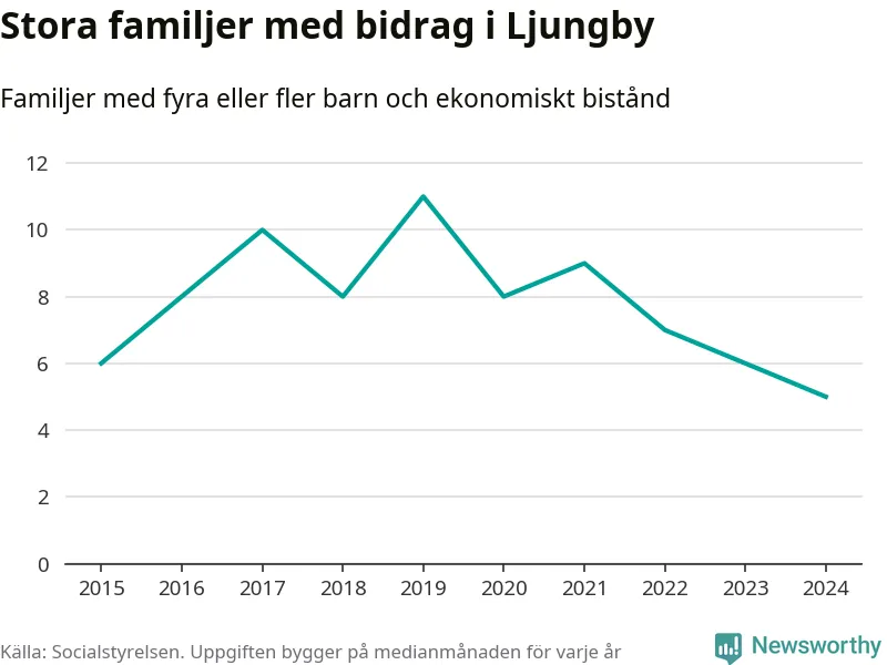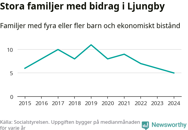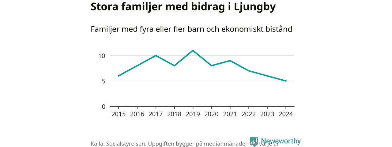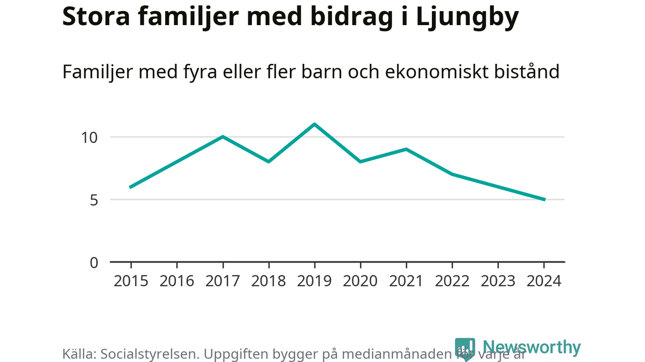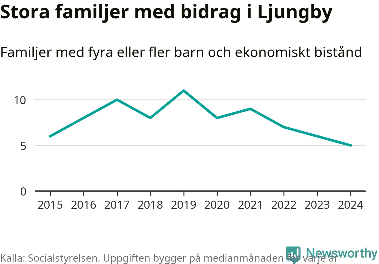 Ljungby kommun tillhör varken de kommuner där högst eller lägst andel av befolkningen som fick ekonomiskt bistånd i landet 2024. Sammanlagt 321 hushåll fick någon gång under året ekonomiskt bistånd, enligt Socialstyrelsens statistik. Av dem var 92 barnfamiljer. Vi har inte siffror på hur många unika familjer med fyra barn eller fler det handlar om, men enligt Socialstyrelsens preliminära månadsstatistik betalades ekonomiskt bistånd ut till mellan någon eller några enstaka och sju familjer per månad under fjolåret – i snitt fem familjer.