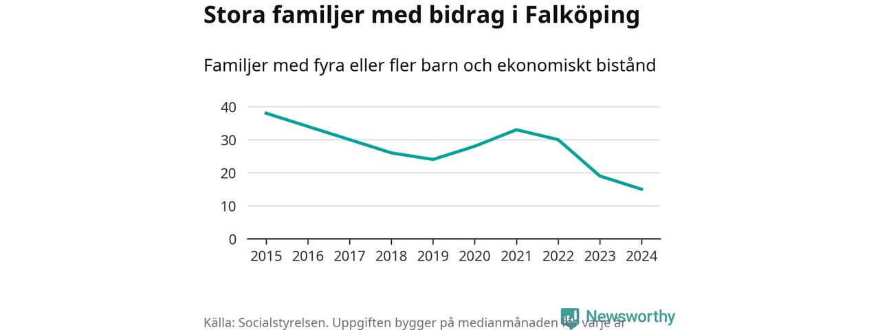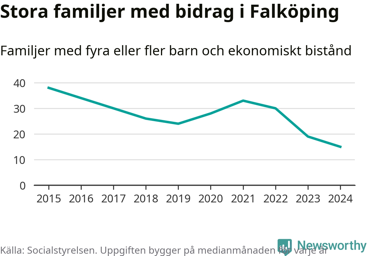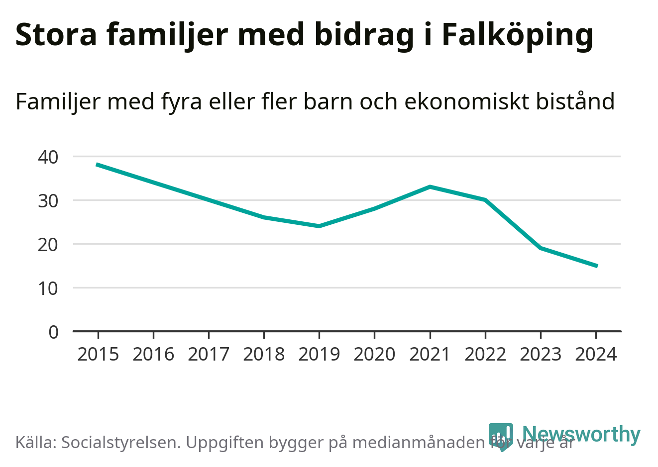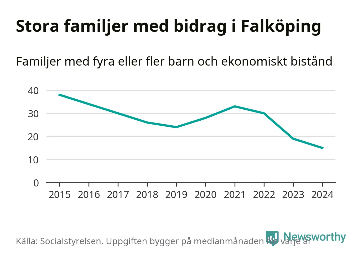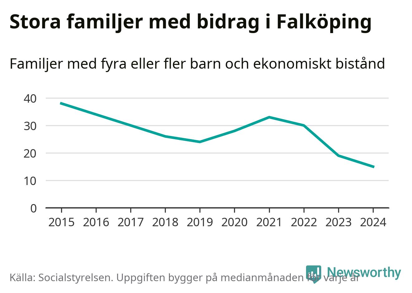 I Falköpings kommun fick en högre andel av befolkningen ekonomiskt bistånd än de flesta andra kommuner i landet 2024. Sammanlagt 631 hushåll fick någon gång under året ekonomiskt bistånd, enligt Socialstyrelsens statistik. Av dem var 164 barnfamiljer. Vi har inte siffror på hur många unika familjer med fyra barn eller fler det handlar om, men enligt Socialstyrelsens preliminära månadsstatistik betalades ekonomiskt bistånd ut till mellan tolv och 18 familjer per månad under fjolåret – i snitt 15 familjer.