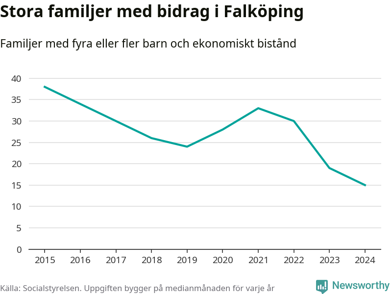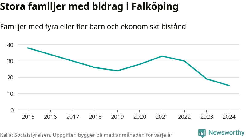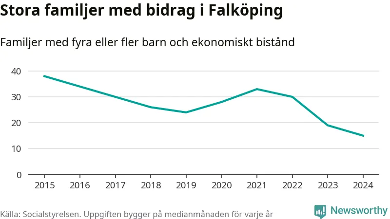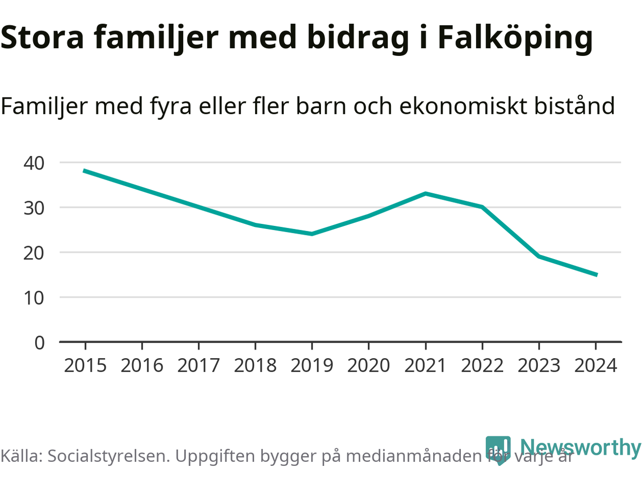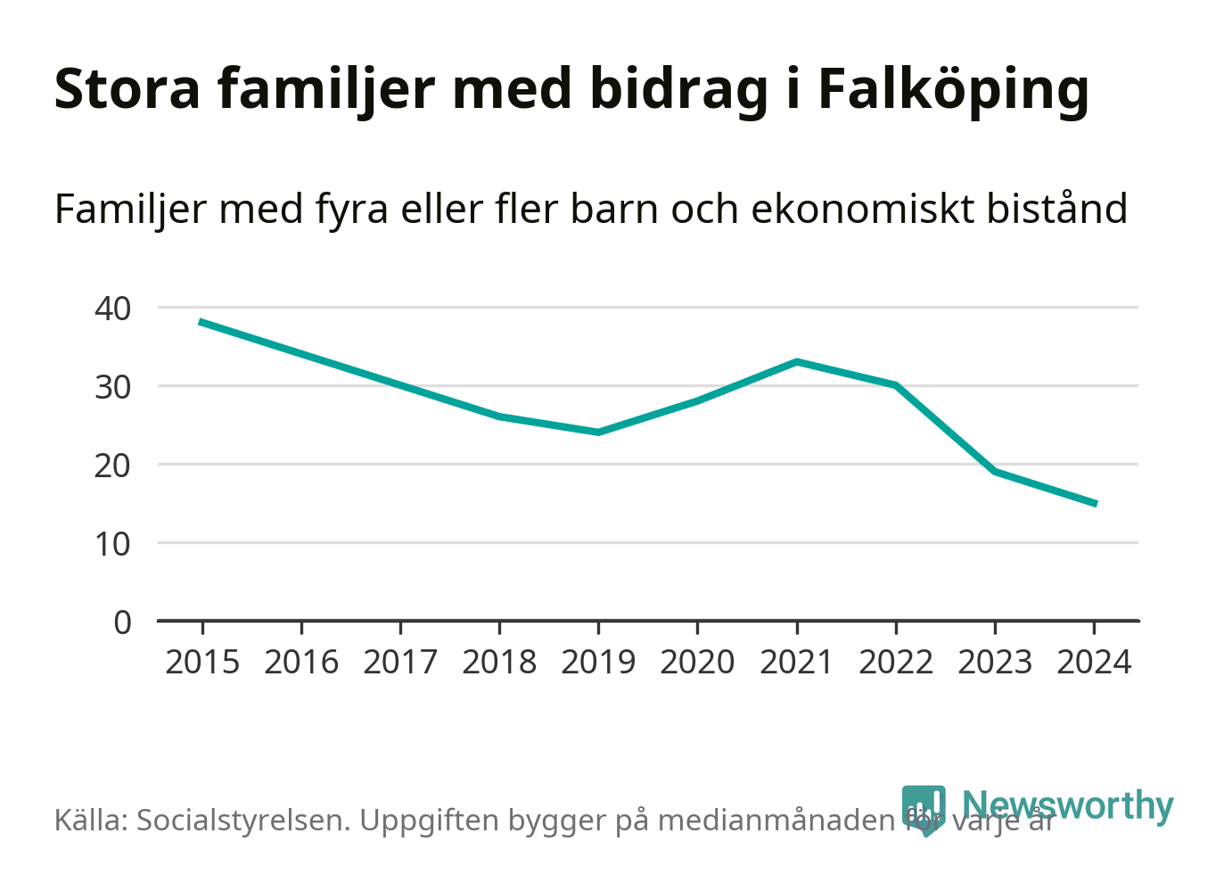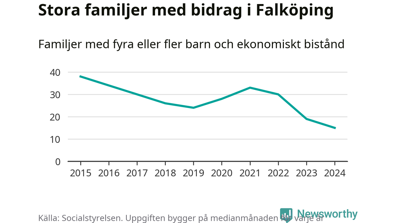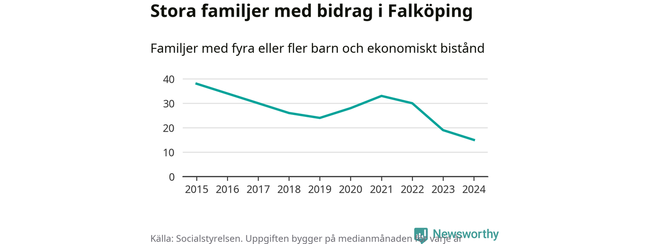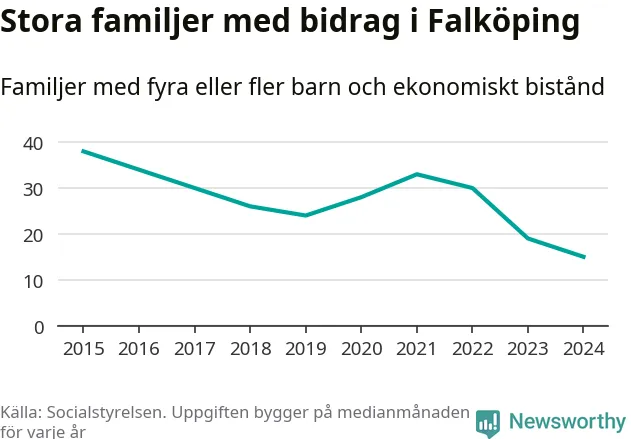 I Falköpings kommun fick en högre andel av befolkningen ekonomiskt bistånd än de flesta andra kommuner i landet 2024. Sammanlagt 631 hushåll fick någon gång under året ekonomiskt bistånd, enligt Socialstyrelsens statistik. Av dem var 164 barnfamiljer. Vi har inte siffror på hur många unika familjer med fyra barn eller fler det handlar om, men enligt Socialstyrelsens preliminära månadsstatistik betalades ekonomiskt bistånd ut till mellan tolv och 18 familjer per månad under fjolåret – i snitt 15 familjer.